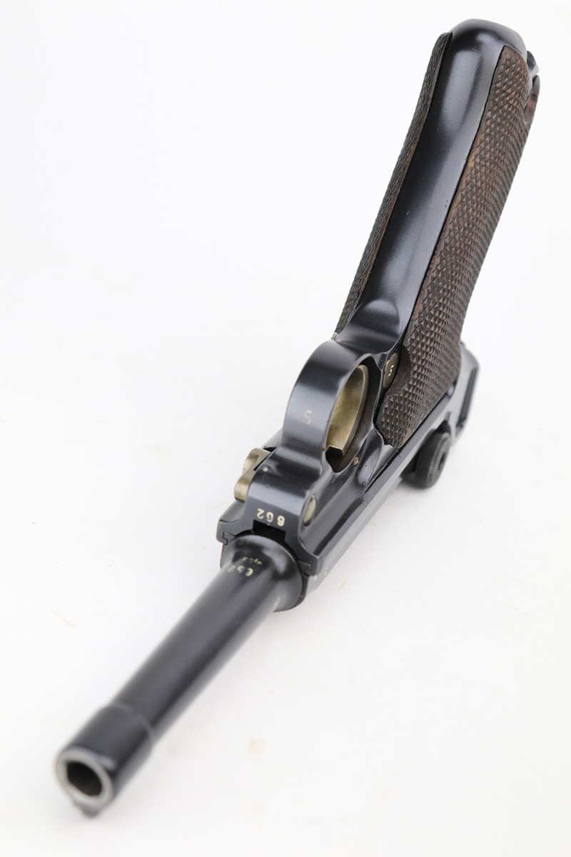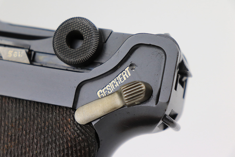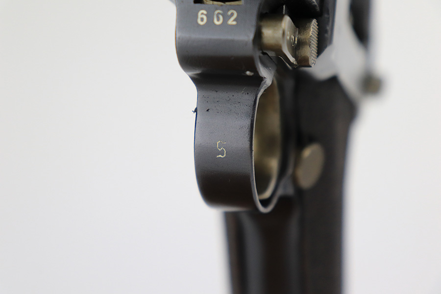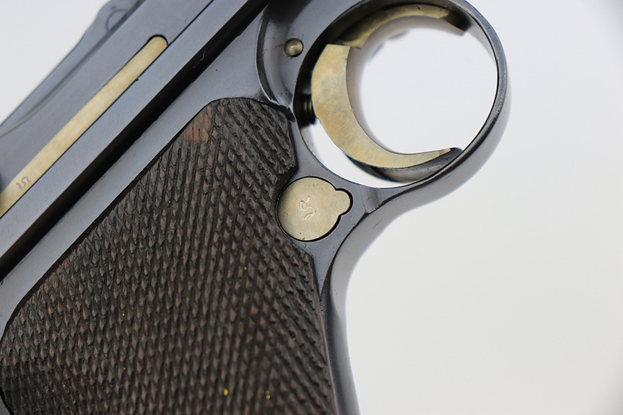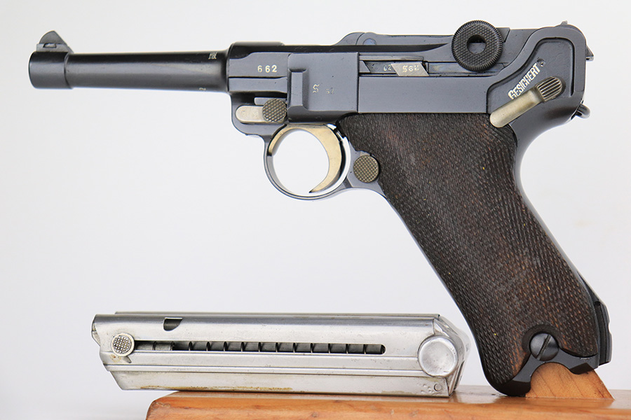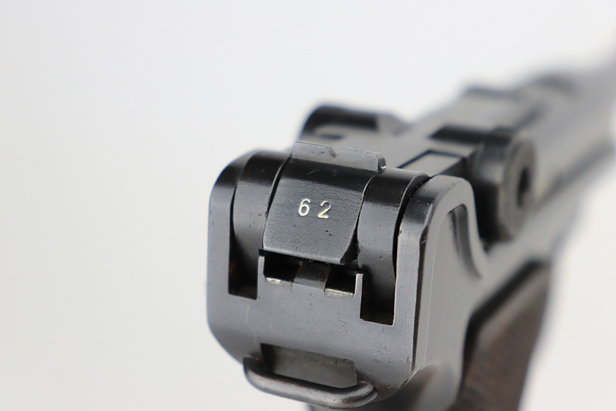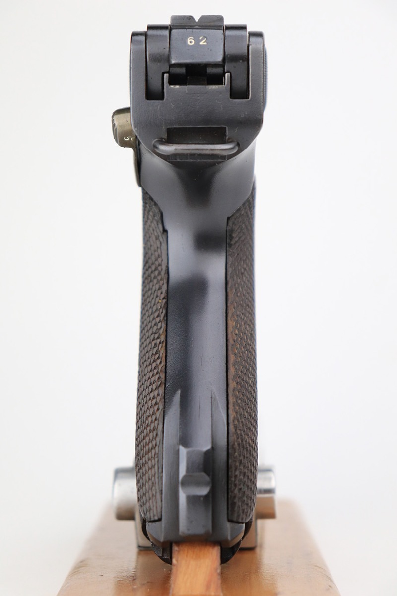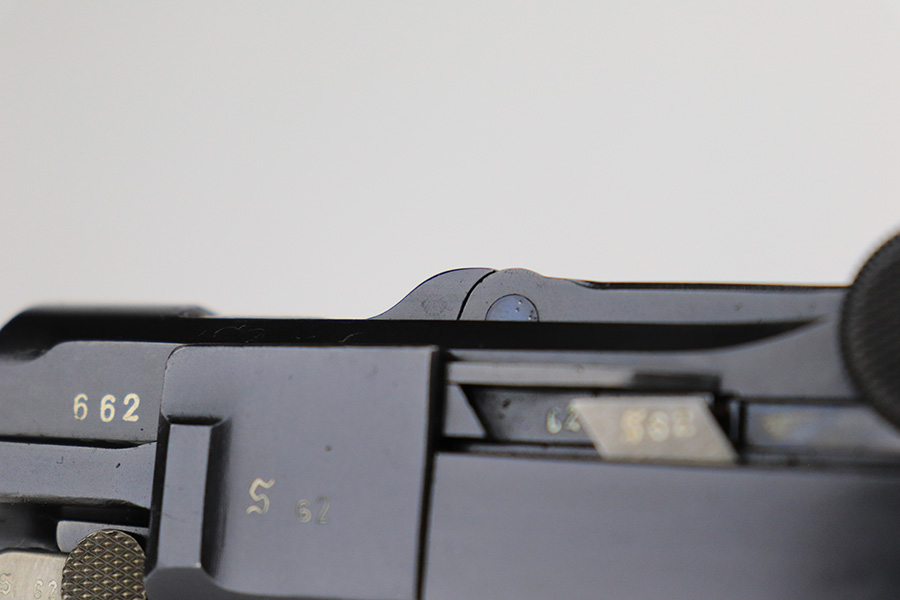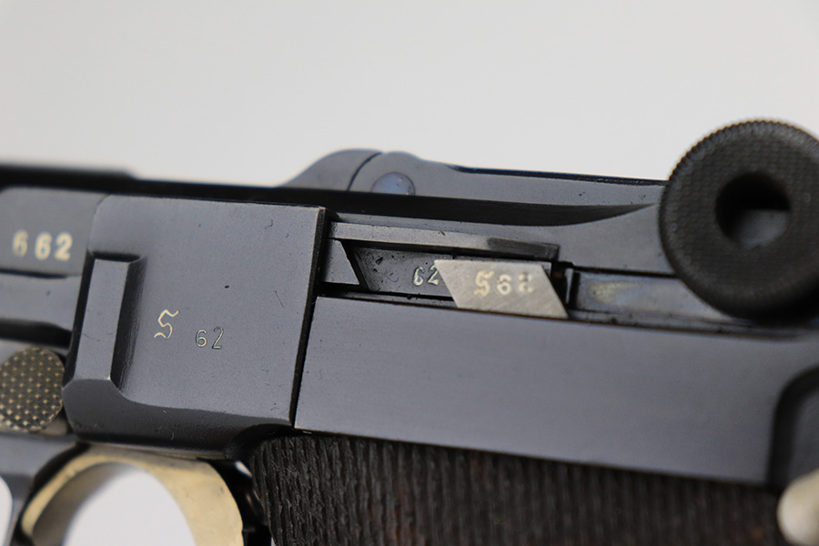 6/15/23 – This is an excellent example of a “K Date” Mauser Luger issued to the Nazi military in 1934. It is all matching and has the proper K Date military acceptance proofs. This one has been completely professionally restored, so the finish is beautiful essentially no signs of wear. Fitted with excellent matching-numbered wood grips. Comes with one original matching-numbered magazine (the one with the “+”) and one force-matched magazine. The rifling in the bore is fairly worn with tiny pitting throughout.