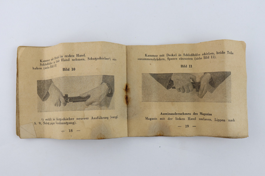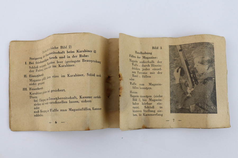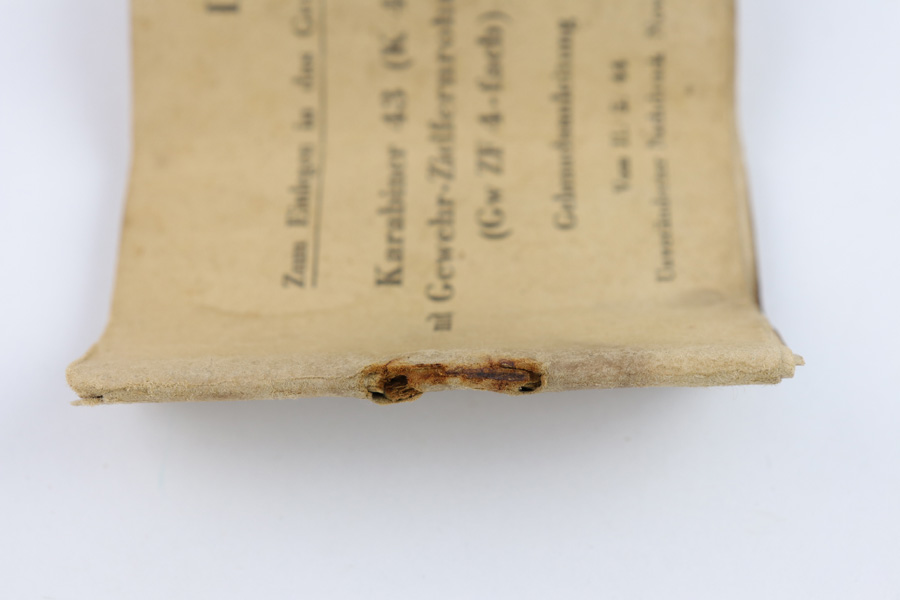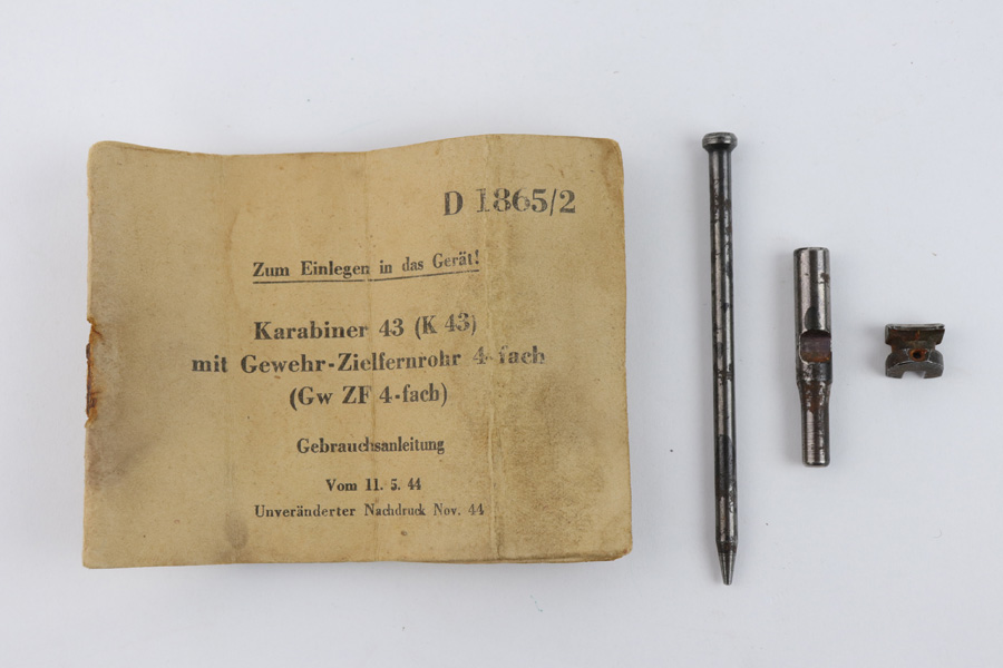 7/18/19 – This is an original Mauser / Walther G43 / K43 manual and spare parts that would fit into the buttstock of these rifles. The manual is in great condition with all pages in tact, although there is normal aging and wear throughout. The paper is tattered and worn – very delicate but in tact. 1944 dated and has black & white images. There are three small parts included (as shown). All original and authentic.