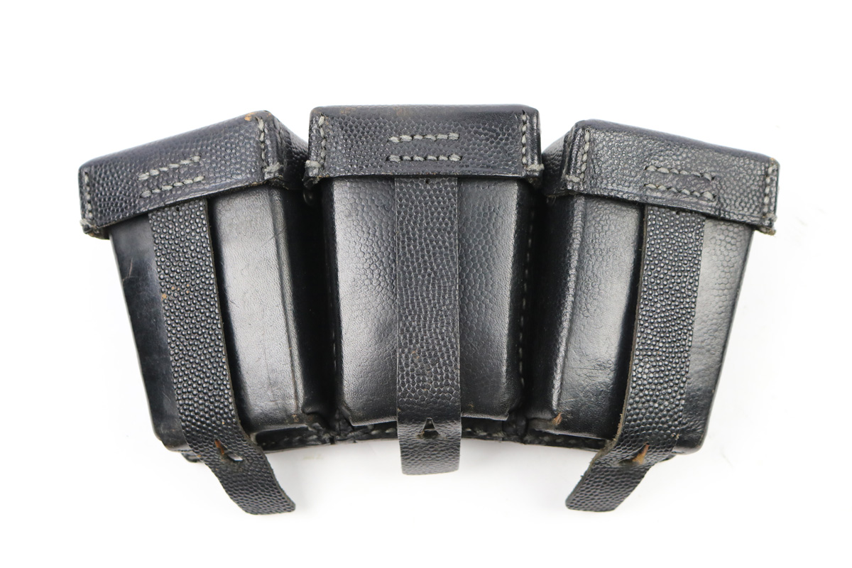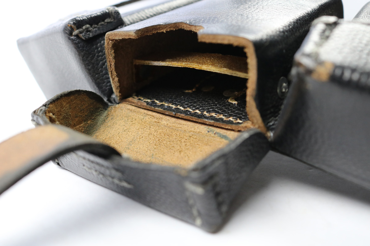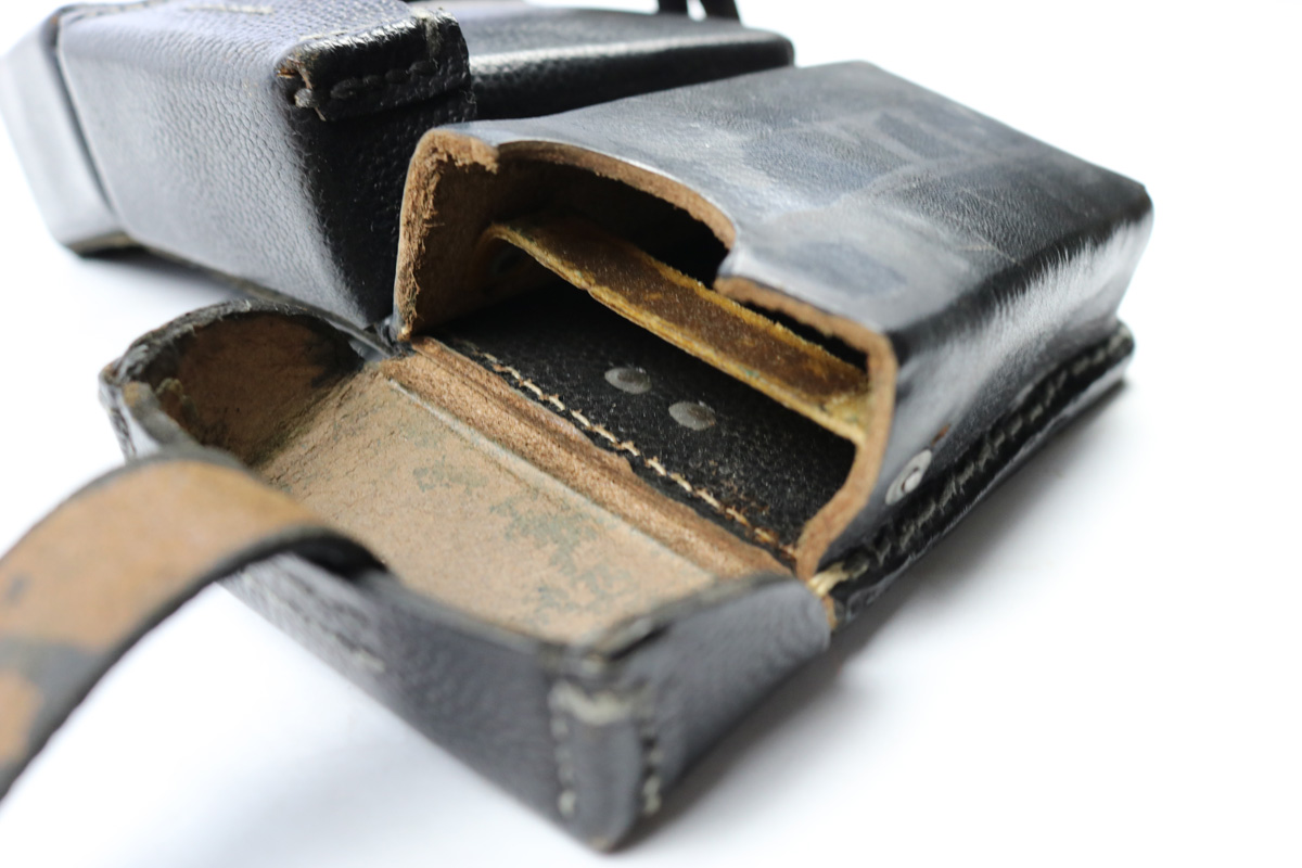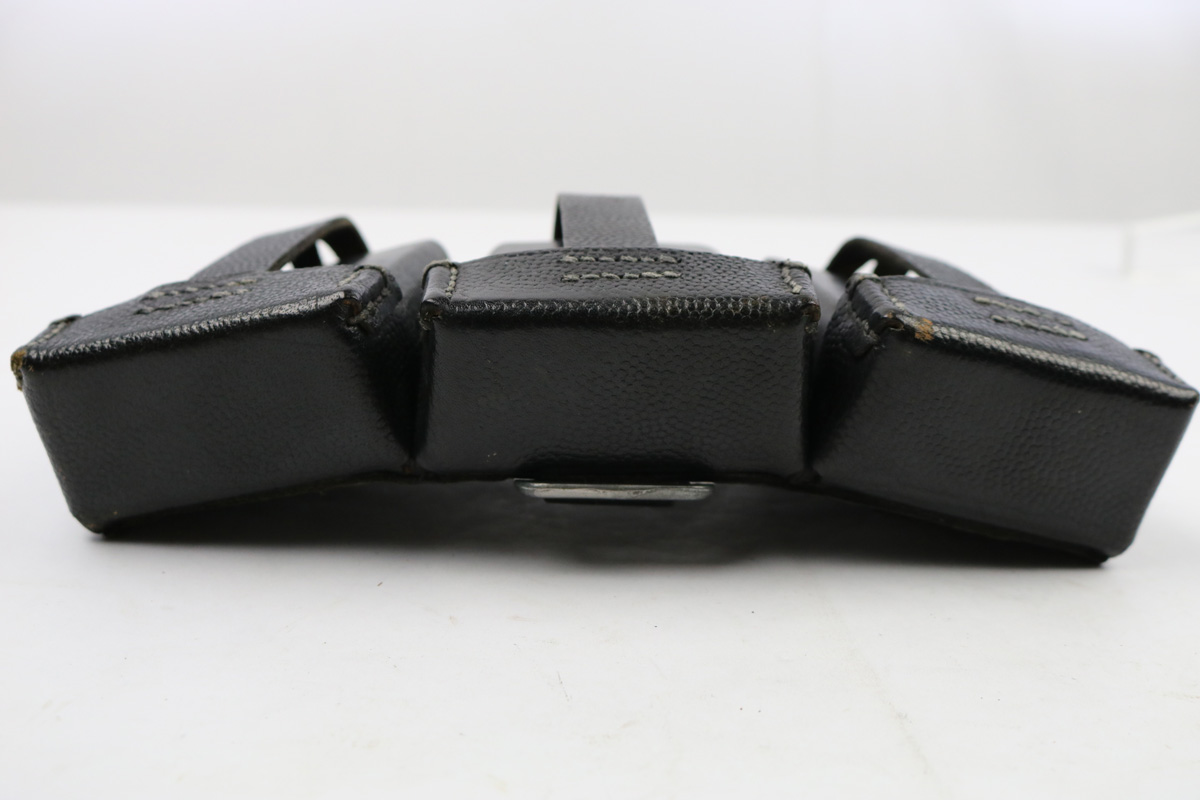 6/28/18 – This is an original WW2 K98 Ammo pouch. Pebble grain leather is clean, in tact, and excellent. All original stitching in tact as well. Stamped on the back with a unit number and “RBNr”. Guaranteed original.