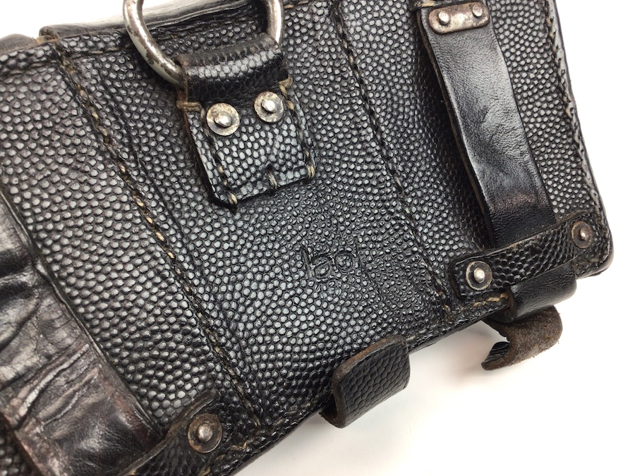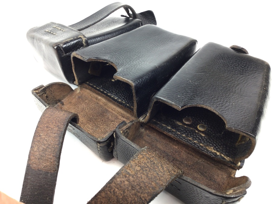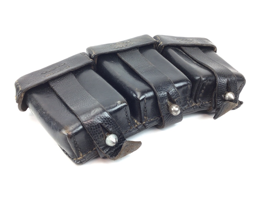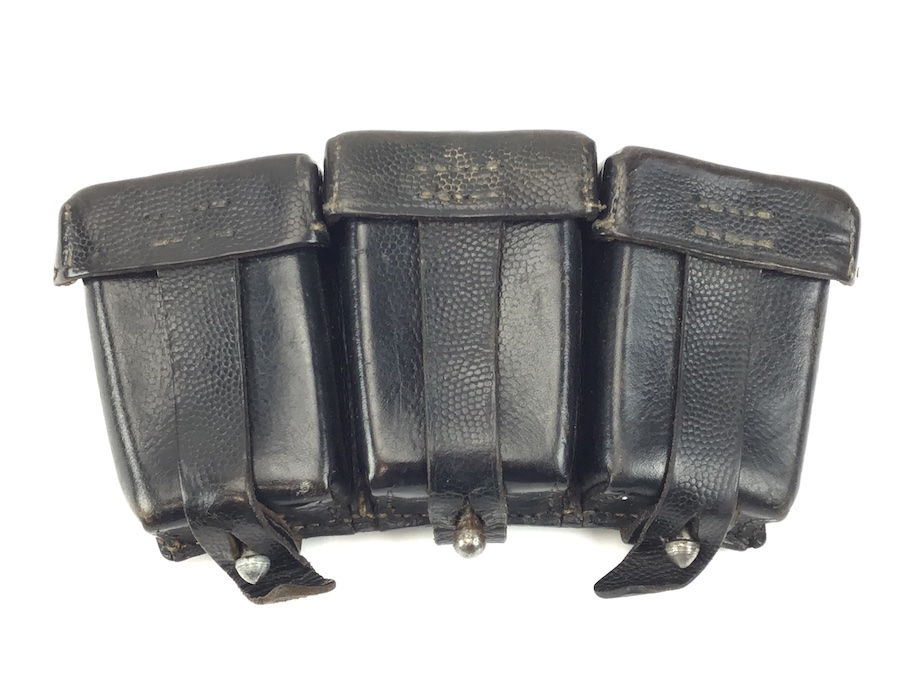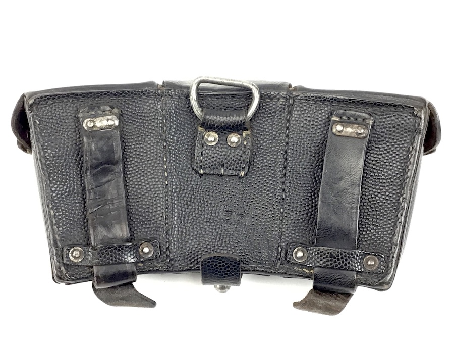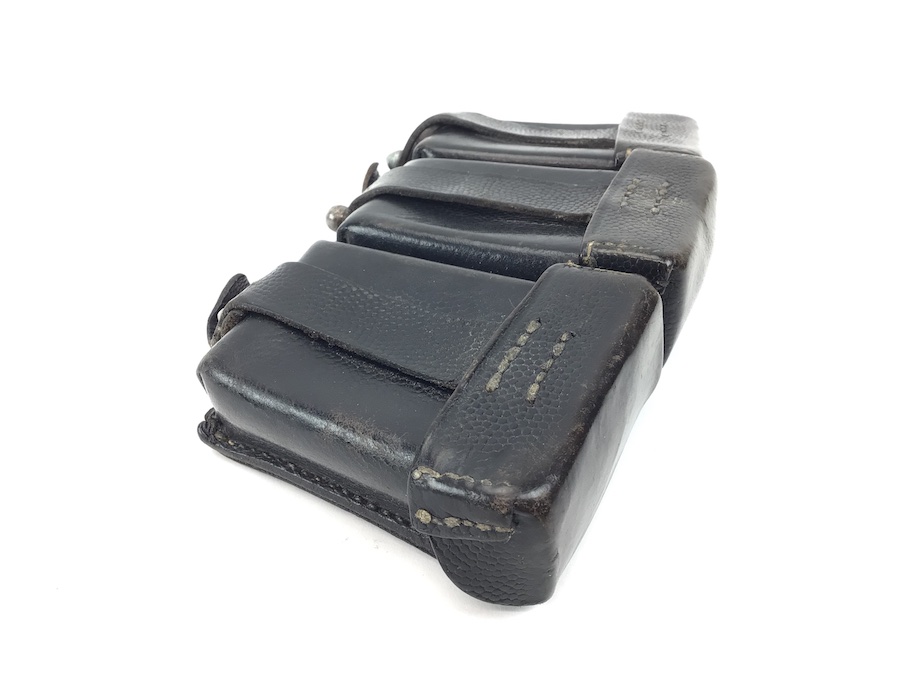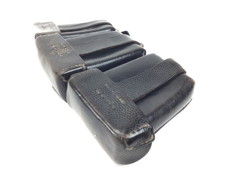 4/1/21 – Original and excellent condition ammunition pouch for the Mauser K98 8mm rifle. Maker stamped on the back, “ao”. There are no other marks. Very sturdy leather with a clean interior and fully intact stitching. The interior is clean and the dividers are not present.