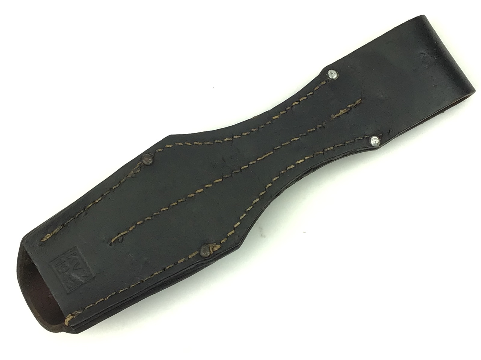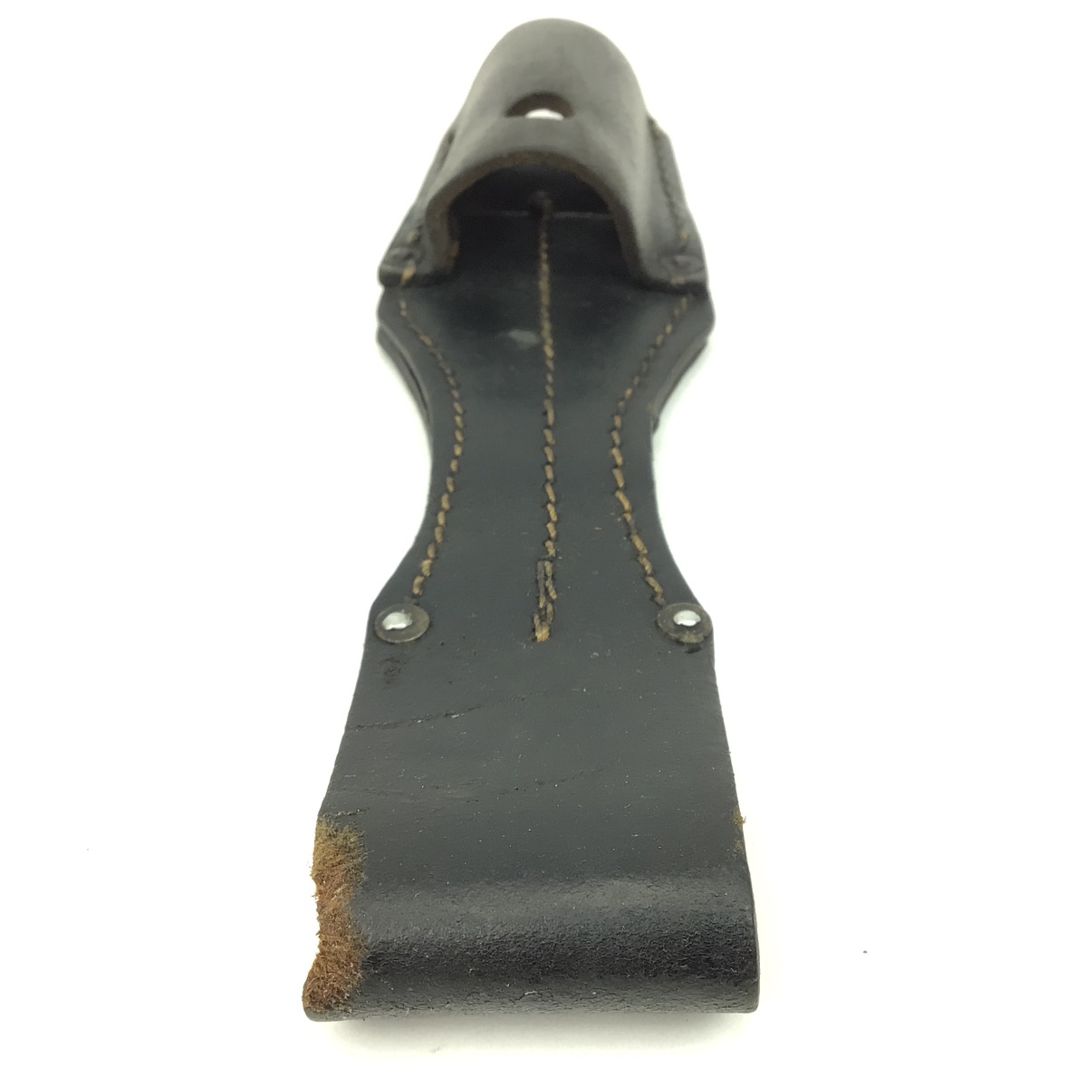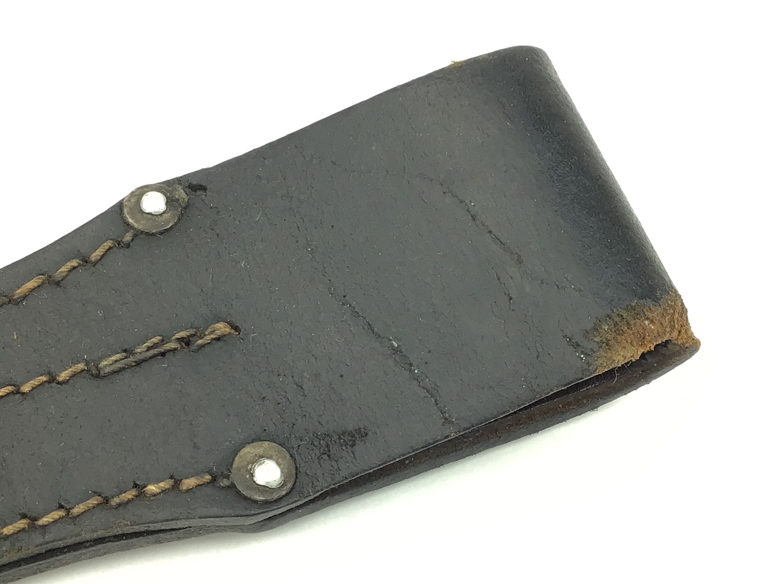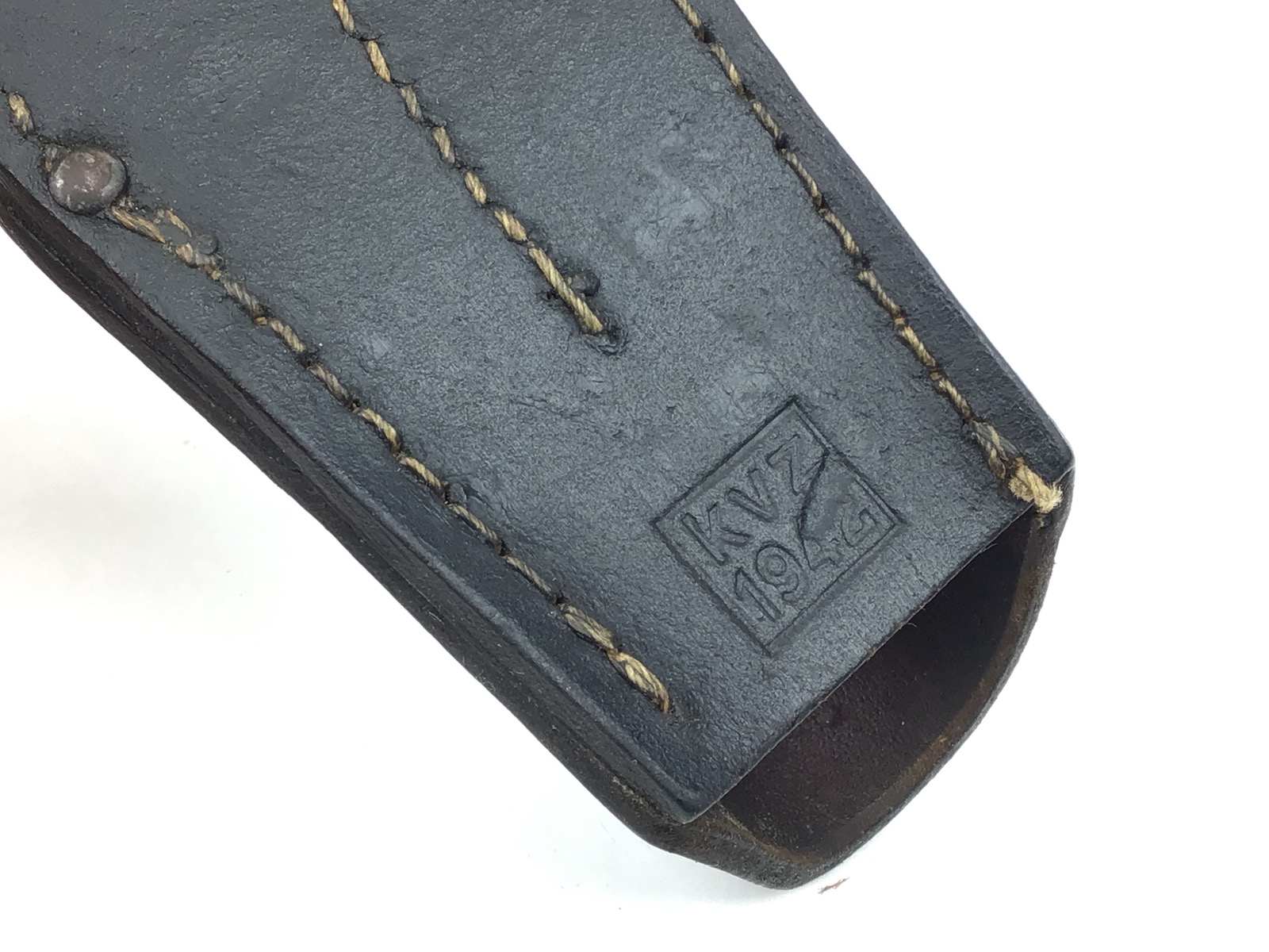 11/16/21 – Original and great condition. Leather from for a K98 bayonet. Great condition with intact stitching. Maker and date stamped on the back ‘kvz’ ‘1942’. Minor wear area on the edge of the belt loop.