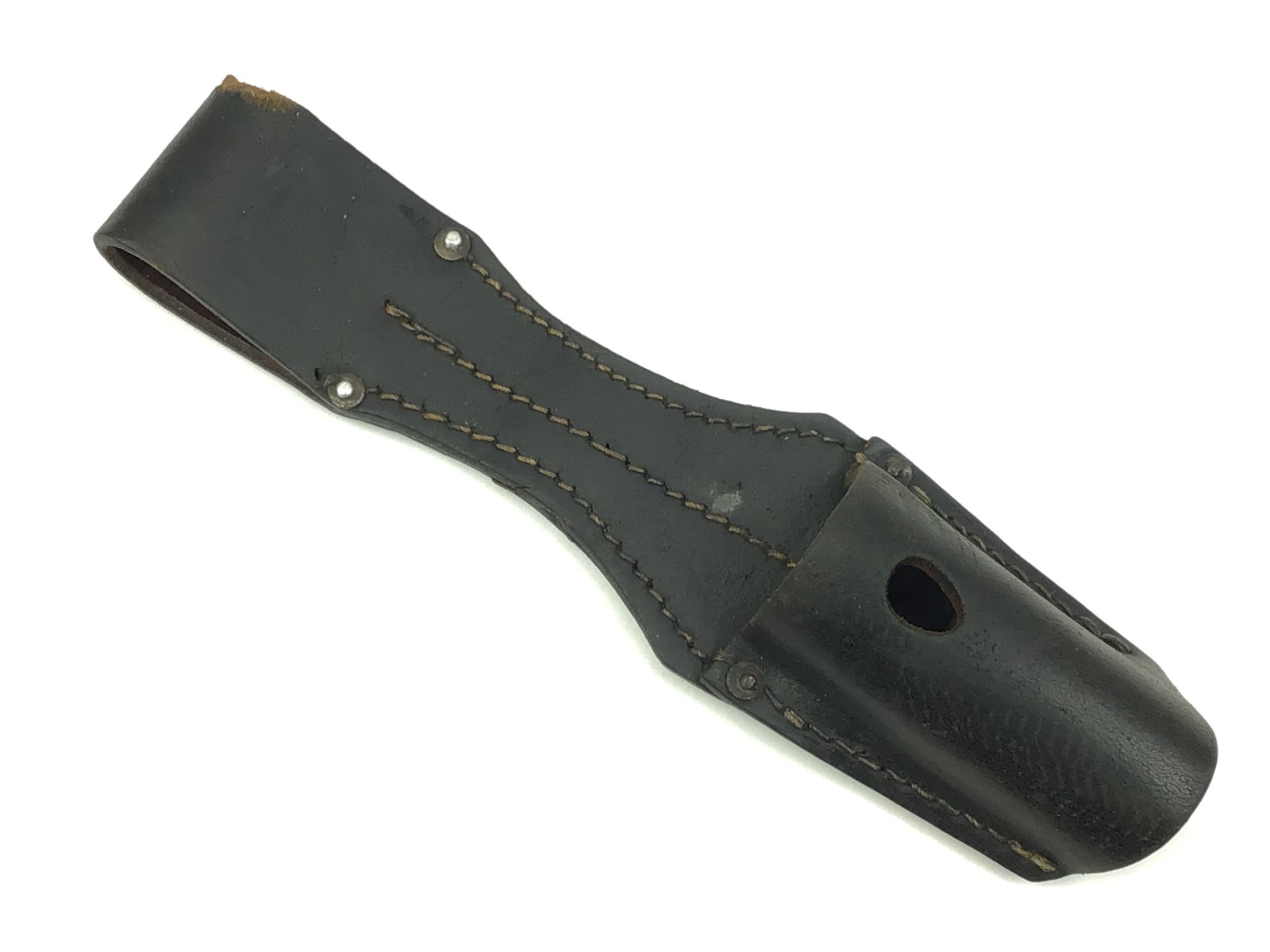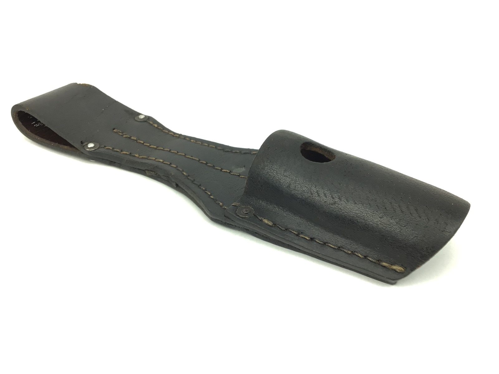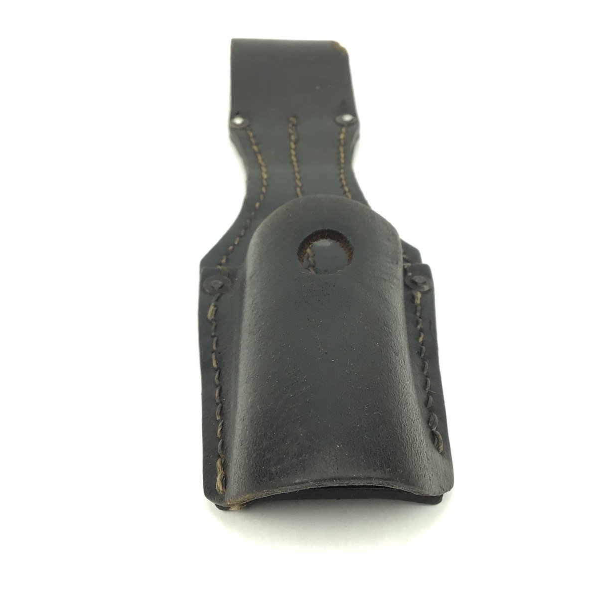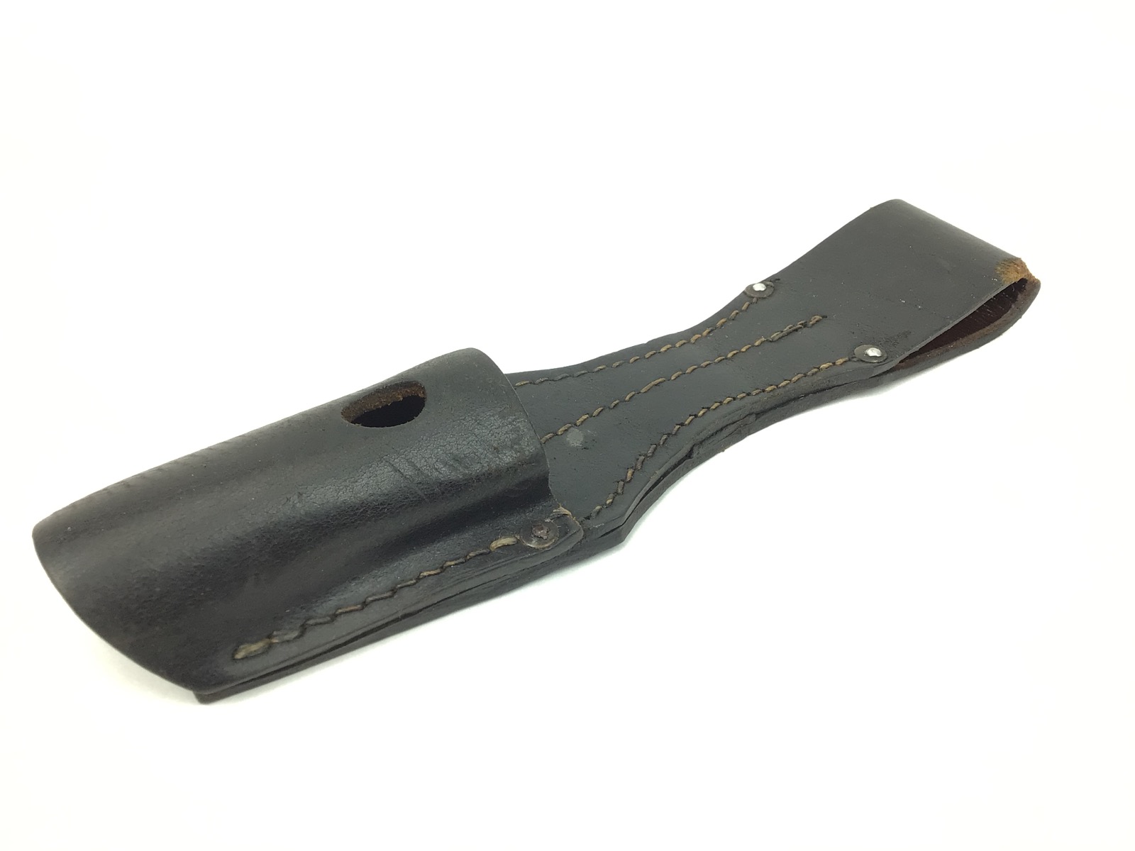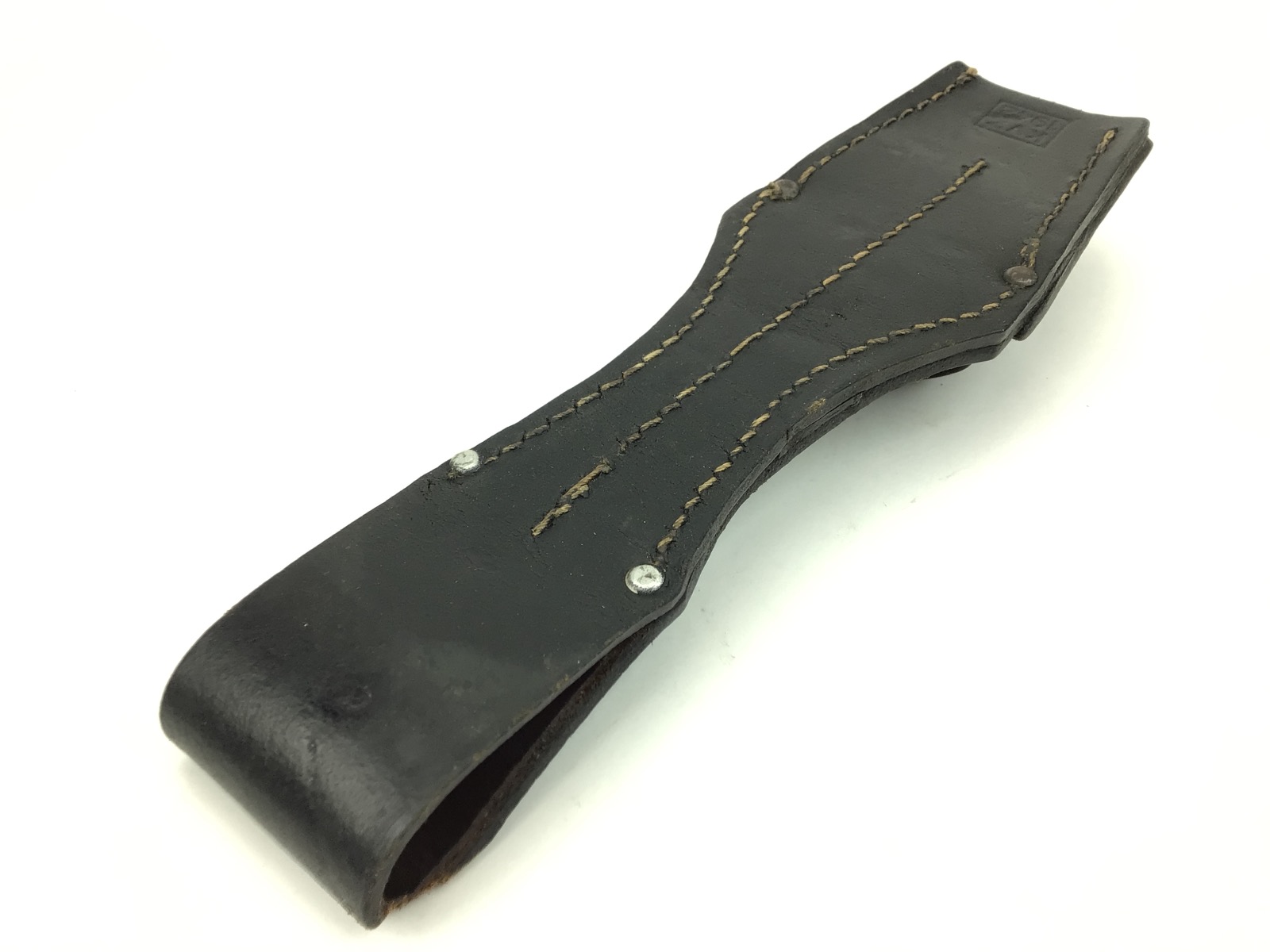 11/16/21 – Original and great condition. Leather from for a K98 bayonet. Great condition with intact stitching. Maker and date stamped on the back ‘kvz’ ‘1942’. Minor wear area on the edge of the belt loop.
