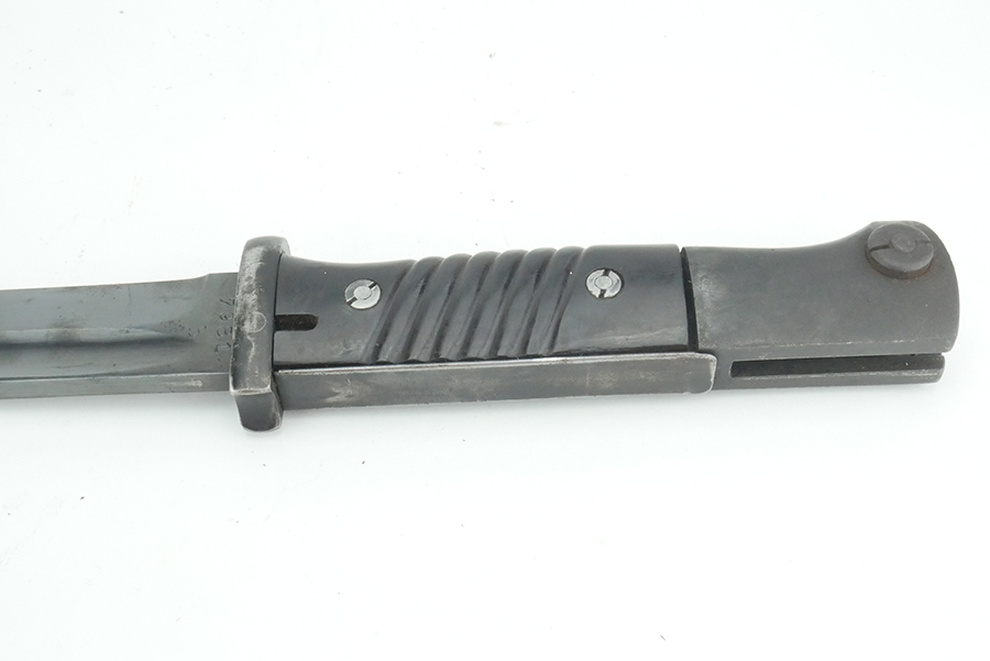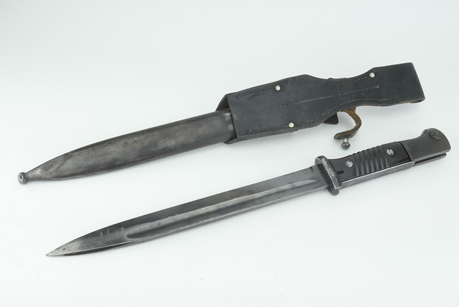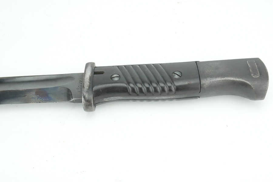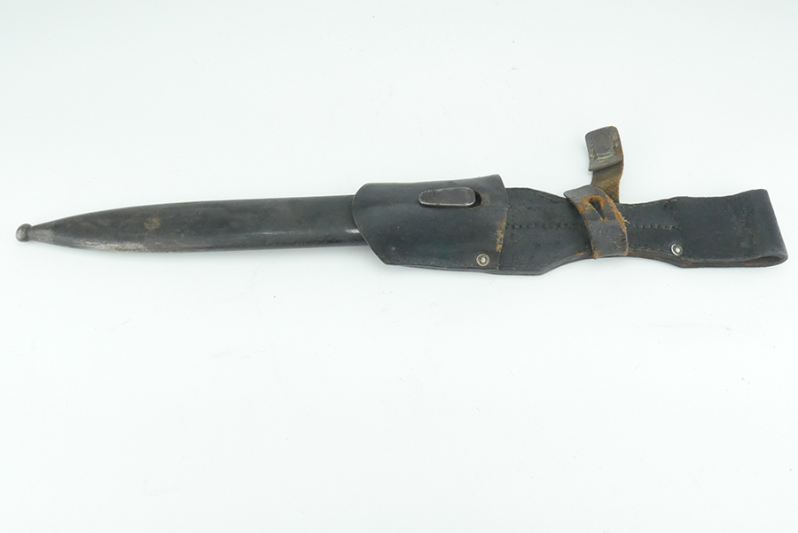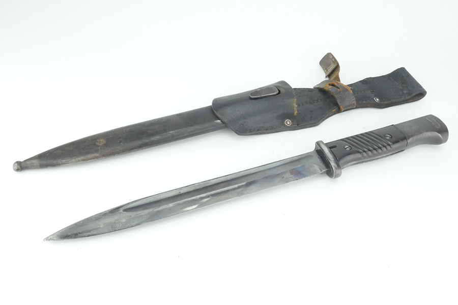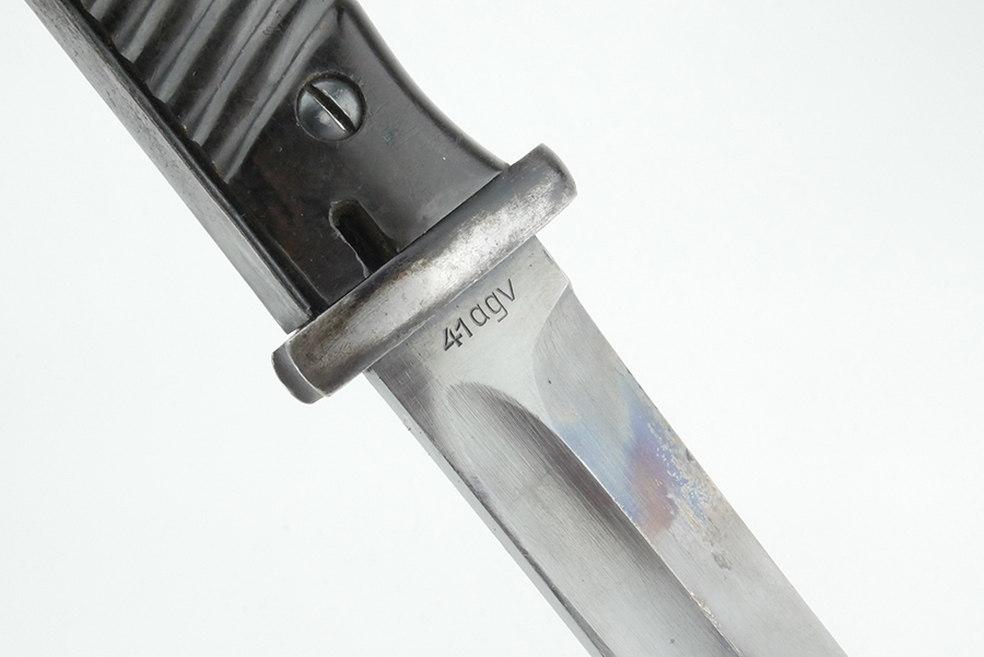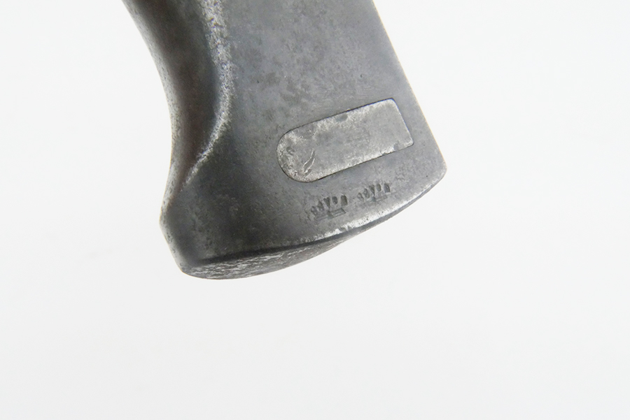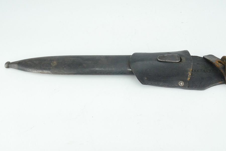 8/22/24 – This is an example of a mismatched K98 Bayonet issued to the German military in WW2. Manufactured in Solingen, Germany by Berg & Co. and maker marked 41AGV above the hilt. The bayonet comes with a period correct scabbard as well as the bayonet frog. The blade on this piece retains some original finish but does have areas that appear to have been touched up, maintains original edge. Both bayonet and scabbard have the proper Waffen proofs. Blade does have minor surface damage and surface loss. Surface loss is consistent with the blade being scabbard wear. Scabbard’s original numbers have been scratched out and force matched to the the bayonet. Both the scabbard and the bayonet, with the exception of the blade, have surface oxidation throughout.
