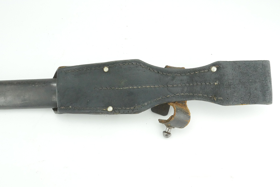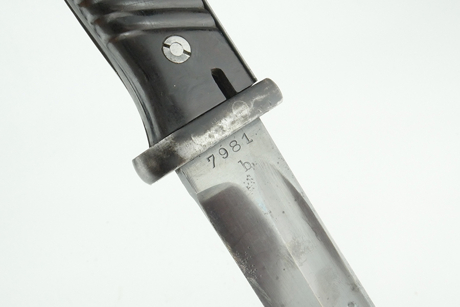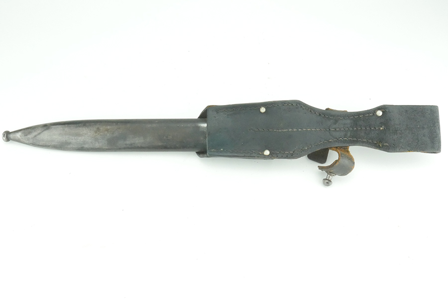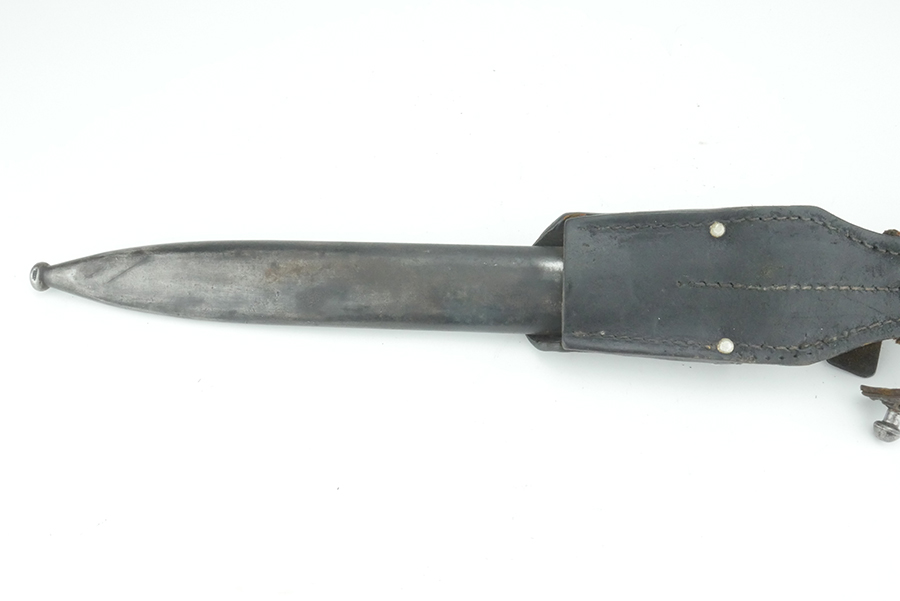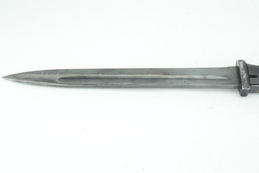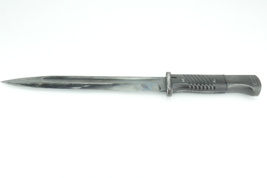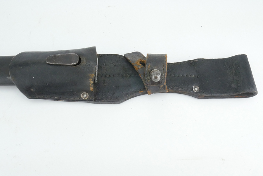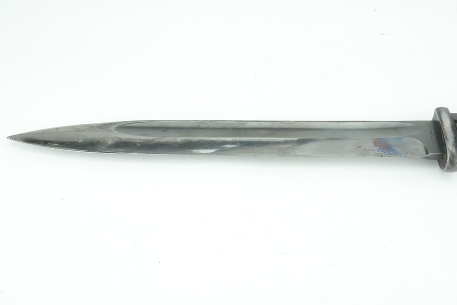 8/22/24 – This is an example of a mismatched K98 Bayonet issued to the German military in WW2. Manufactured in Solingen, Germany by Berg & Co. and maker marked 41AGV above the hilt. The bayonet comes with a period correct scabbard as well as the bayonet frog. The blade on this piece retains some original finish but does have areas that appear to have been touched up, maintains original edge. Both bayonet and scabbard have the proper Waffen proofs. Blade does have minor surface damage and surface loss. Surface loss is consistent with the blade being scabbard wear. Scabbard’s original numbers have been scratched out and force matched to the the bayonet. Both the scabbard and the bayonet, with the exception of the blade, have surface oxidation throughout.
