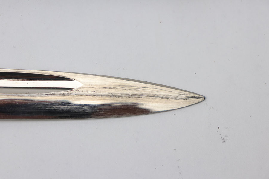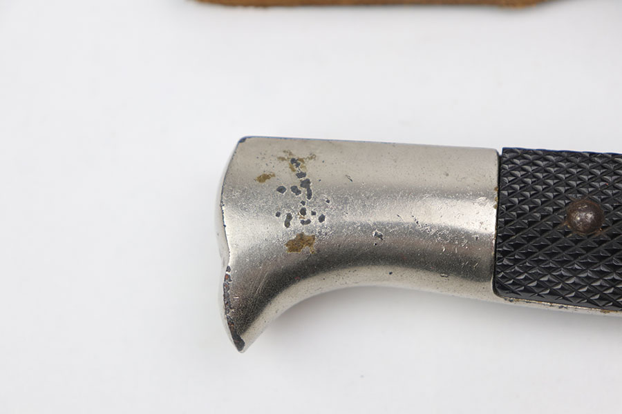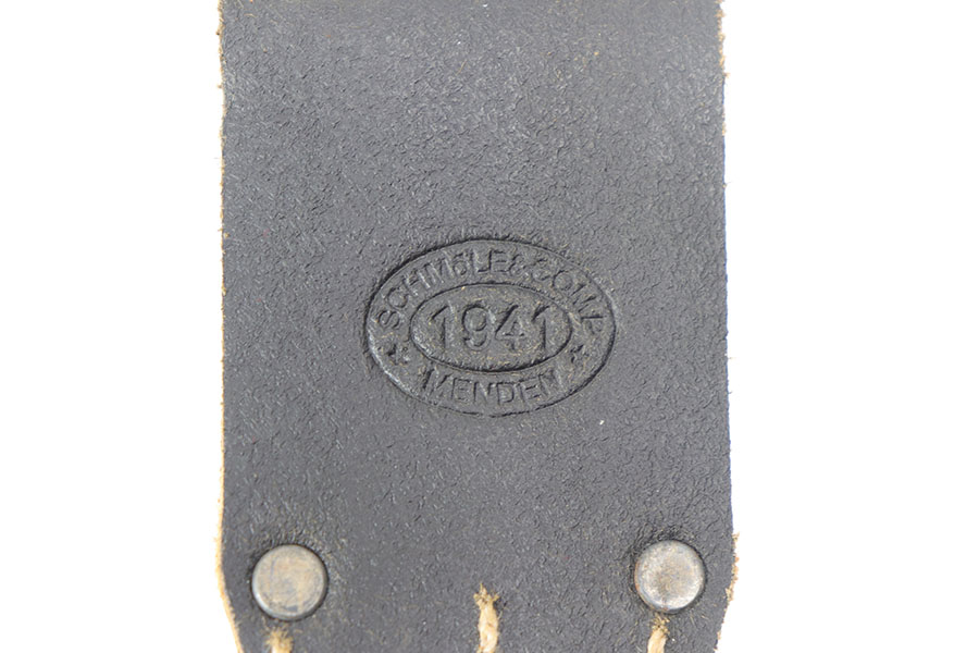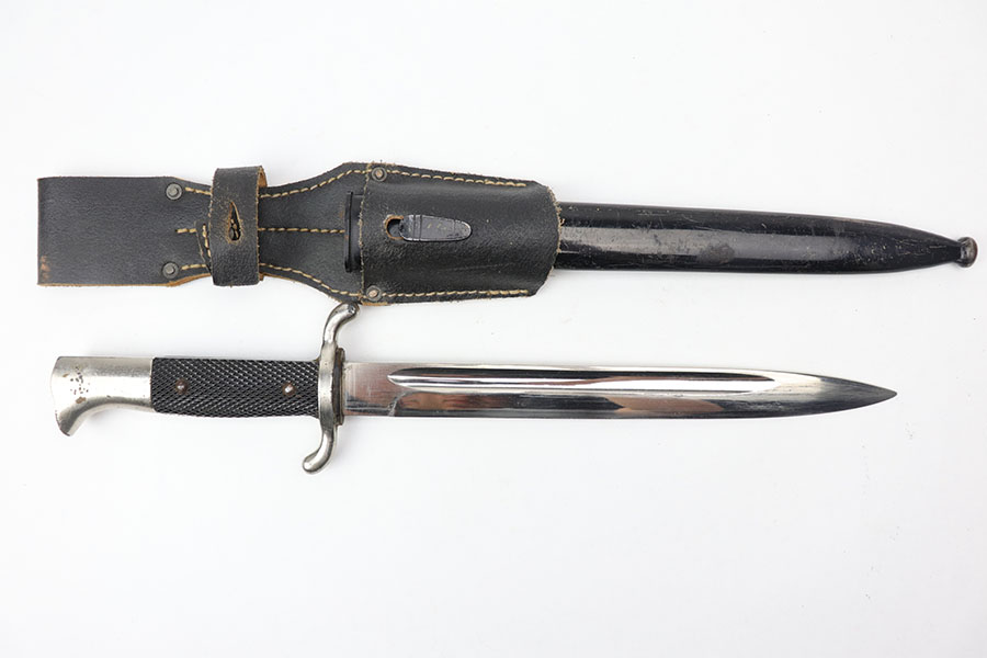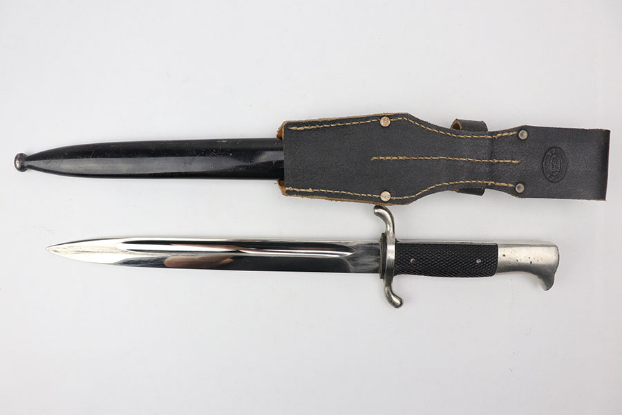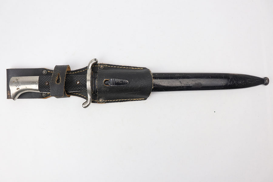 8/20/20 – This is an original K98 dress / parade bayonet from WW2. The bayonet is actually more like a dagger, with no way of attaching to a rifle. These were used as part of the many nazi “dress” style uniforms. The blade is excellent and shiny with minimal scabbard wear. There’s some oxidation and finish loss on the pommel / handle. Leather stopper still in tact. The scabbard has some light surface scratching and finish loss as well, but nothing excessive. Comes with a minty, 1941 dated leather frog.