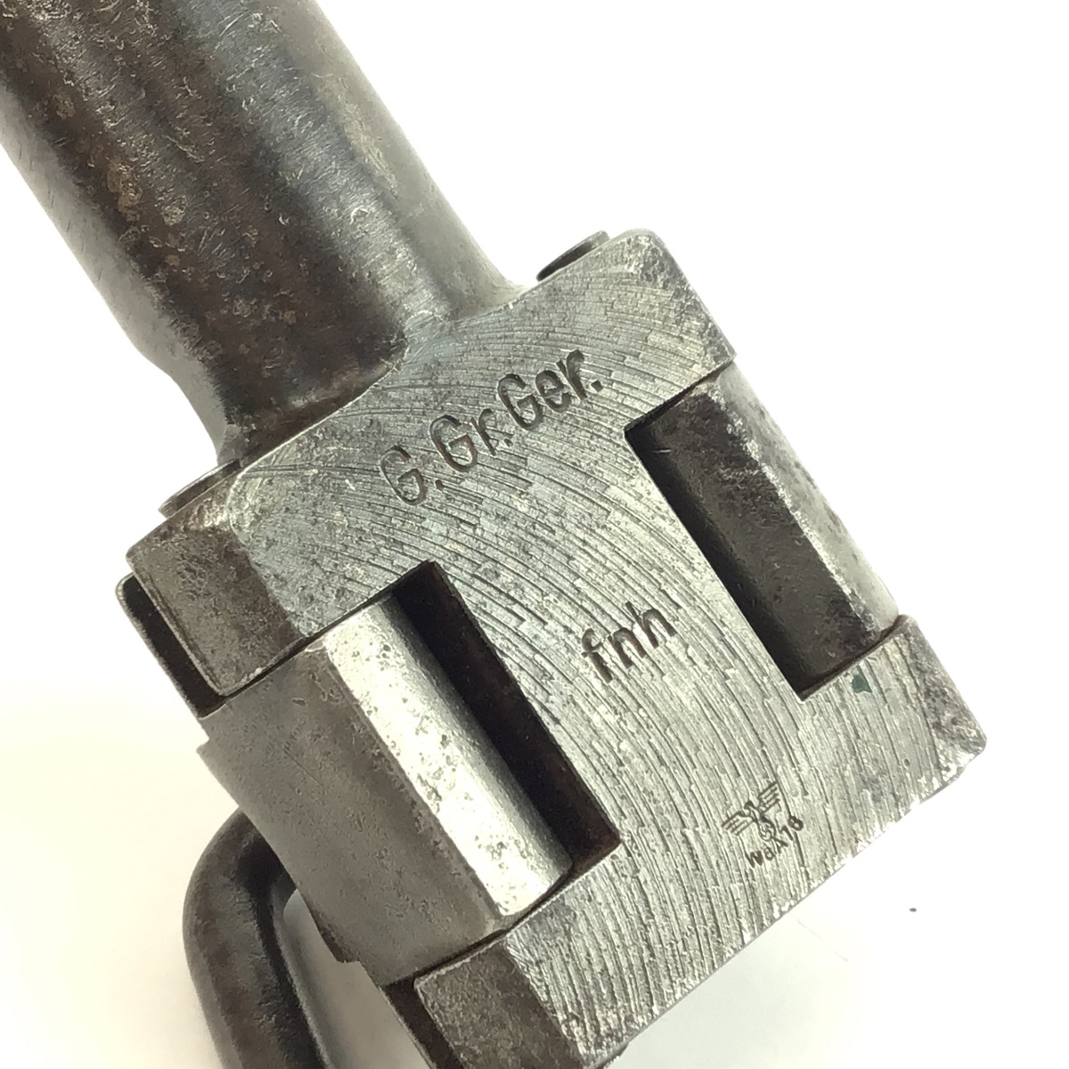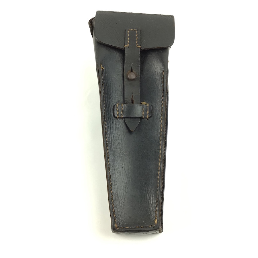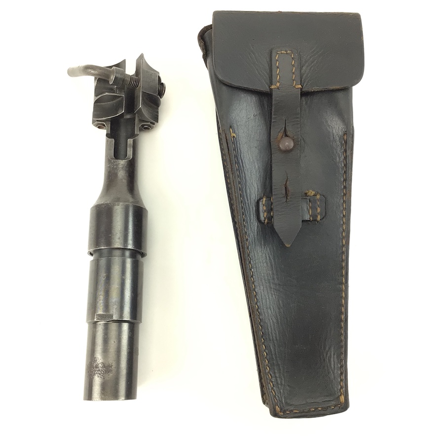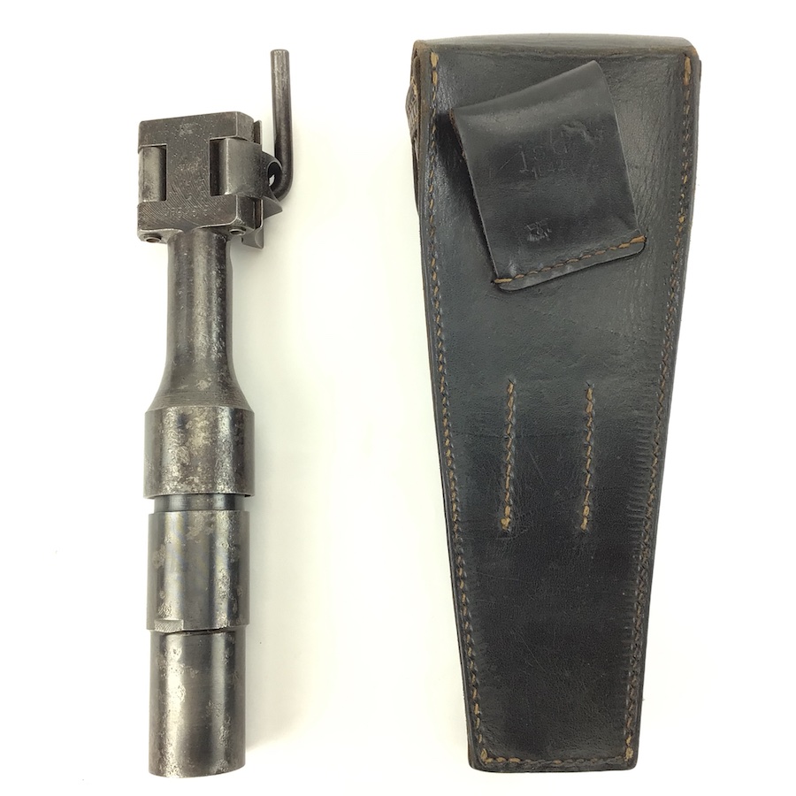 7/13/21 – Original and great condition, Mauser K98 grenade launcher and black leather carry pouch. The launcher is maker stamped “fnh” along with a military waffen stamp “WaA78”. The numeral “2” is stamped on the barrel. Clean barrel with great rifling. Some minor wear and pitting, but still in great shape. The case is maker and date stamped on the belt loop “jsd 1942”. Also waffen stamp “WaA14”. Although missing the carry strap, this piece has original and intact stitching. Strong leather and minimal wear. Clean interior.