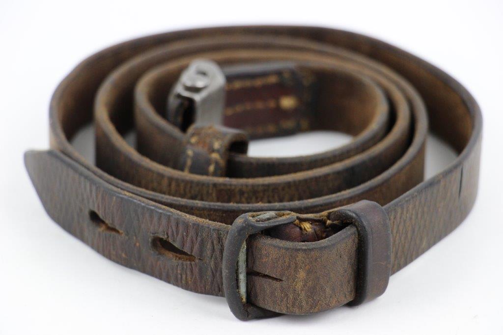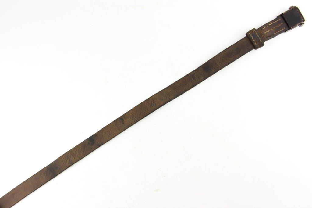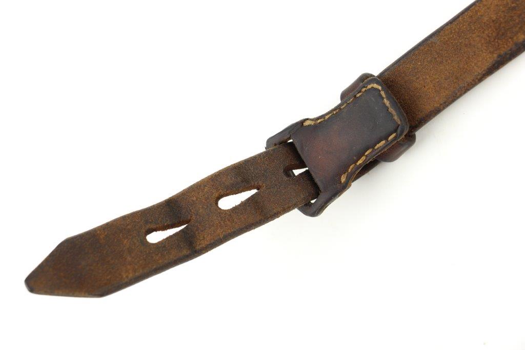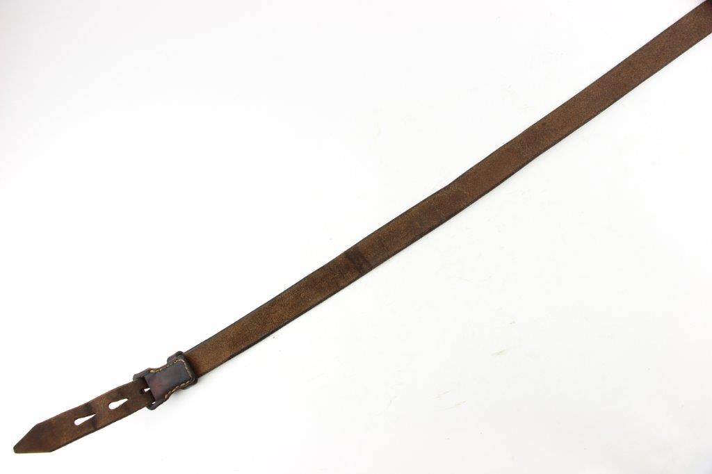 6/5/24 – This is an original leather K98 rifle sling from WW2. The sling is complete with an original leather keeper and leather fastening loop. The sling is completely intact and shows light surface wear and aging throughout. No notable maker markings or stamps. Original stitching intact, and all correct fixtures.