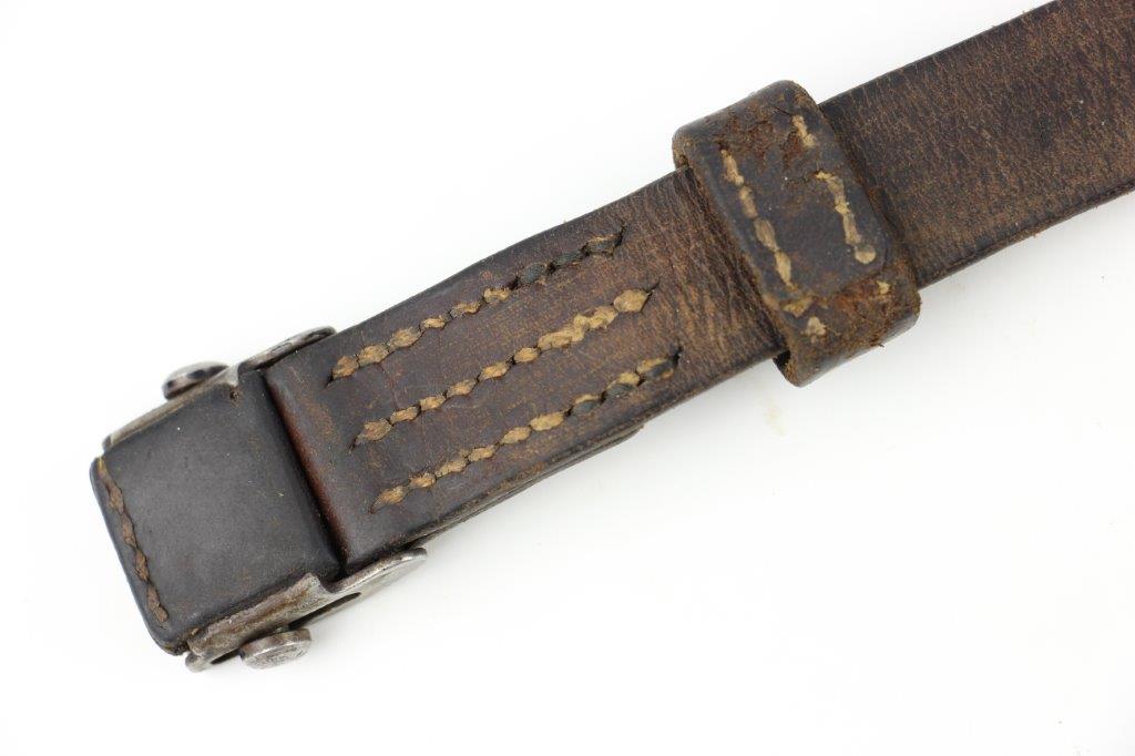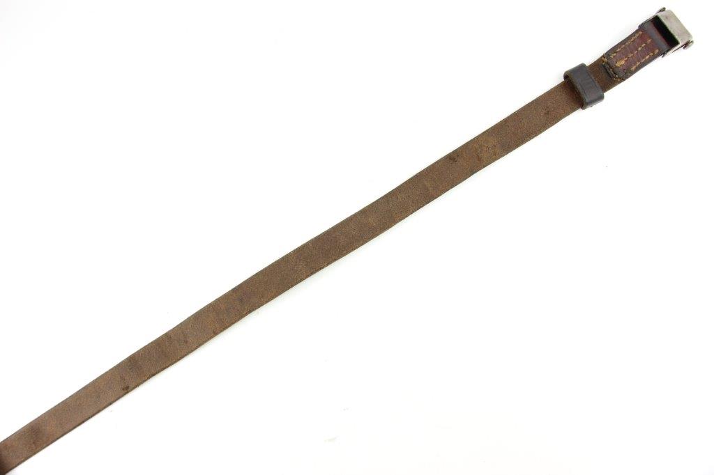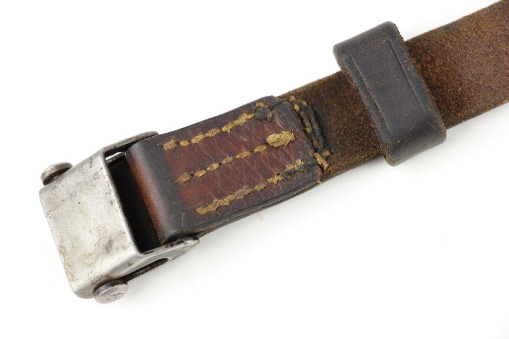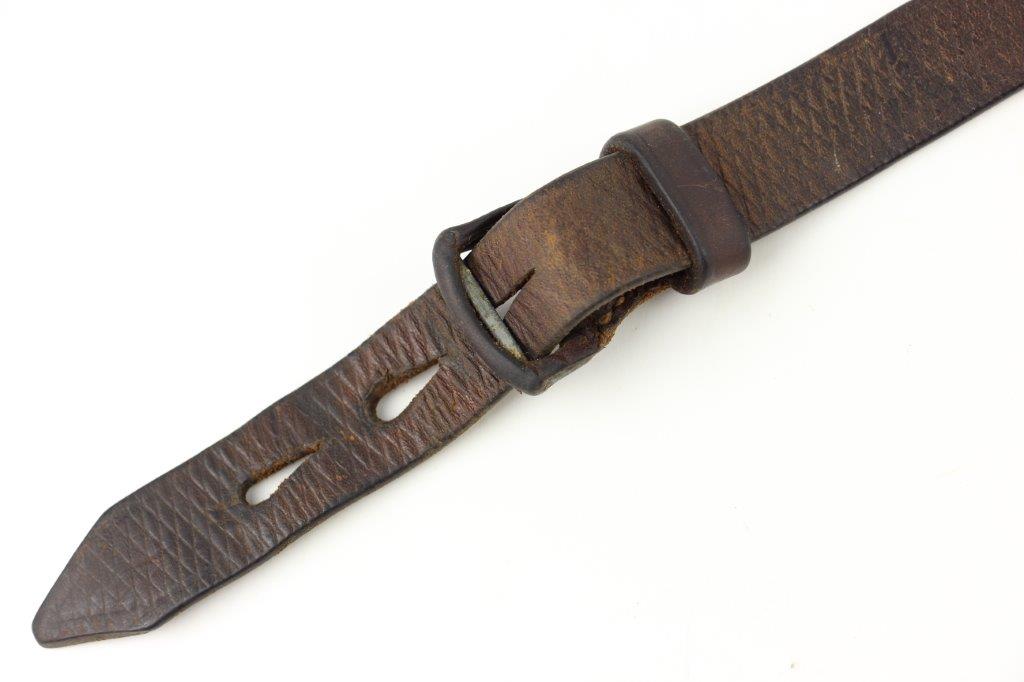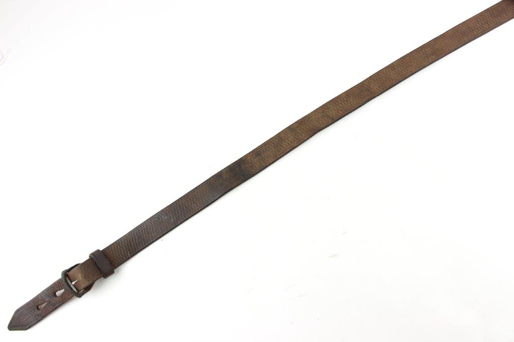 6/5/24 – This is an original leather K98 rifle sling from WW2. The sling is complete with an original leather keeper and leather fastening loop. The sling is completely intact and shows light surface wear and aging throughout. No notable maker markings or stamps. Original stitching intact, and all correct fixtures.