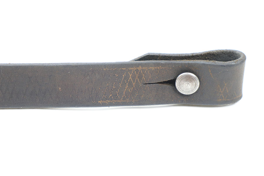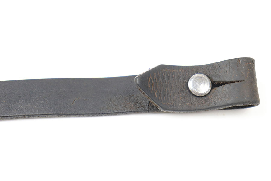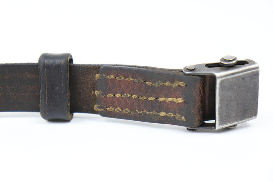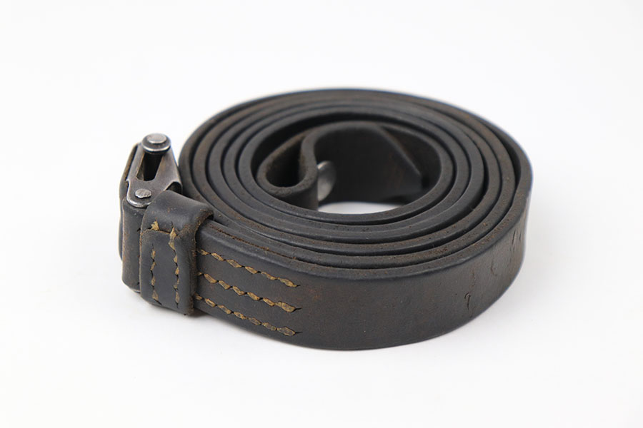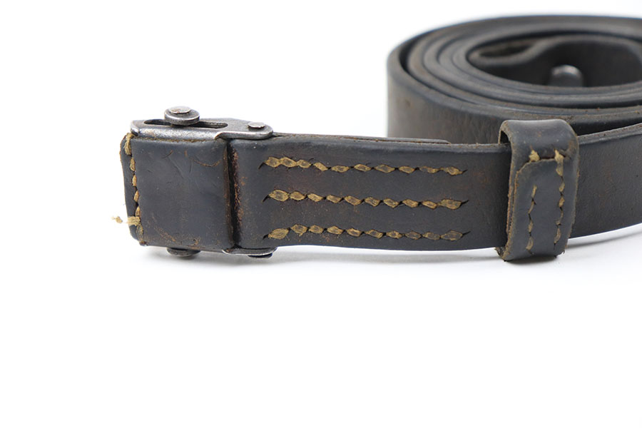 8/13/21 – This is an original WW2 era leather sling for a German K98 or similar style rifle. The sling measures 55.5 inches approximately. The leather is fairly worn but there is no major issue and the leather is completely in tact, as is the stitching. No stamps or markings.