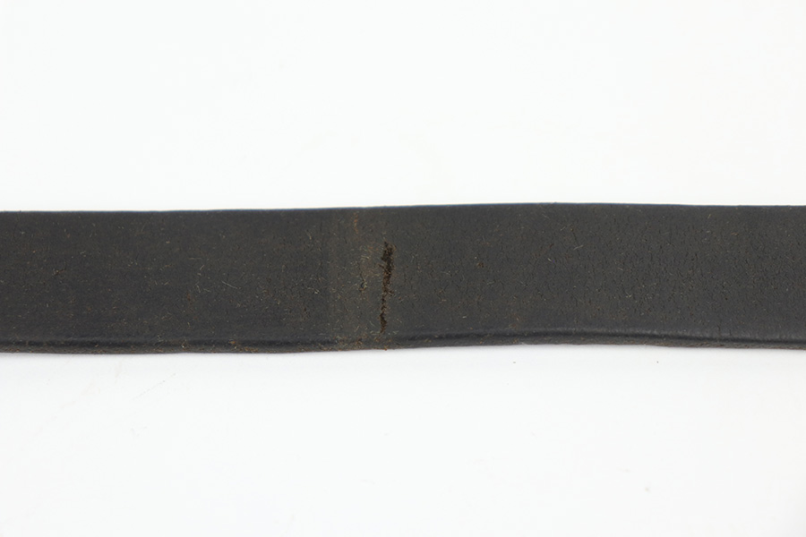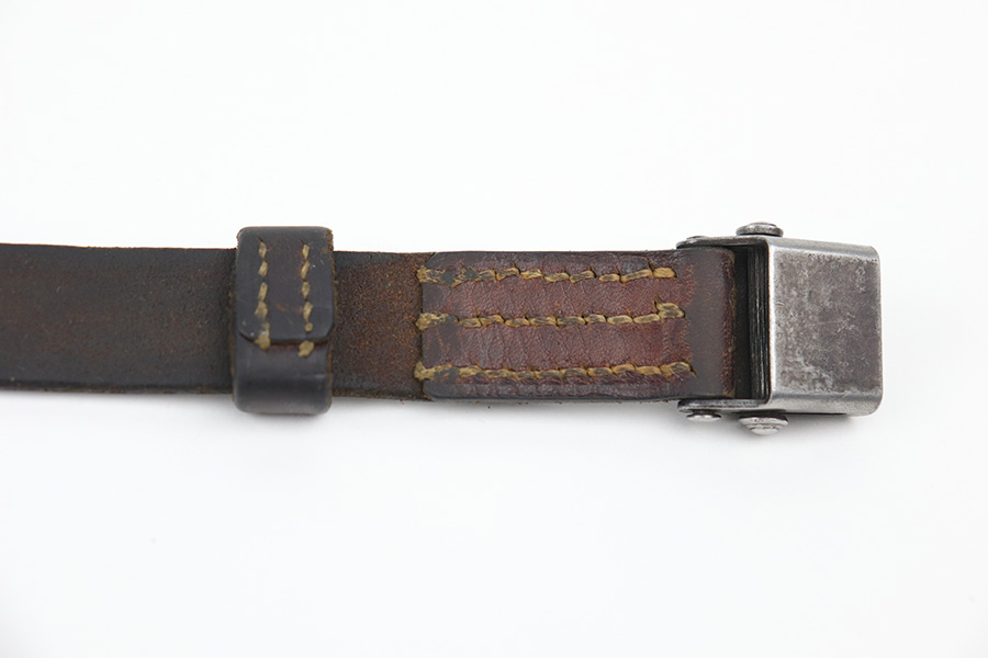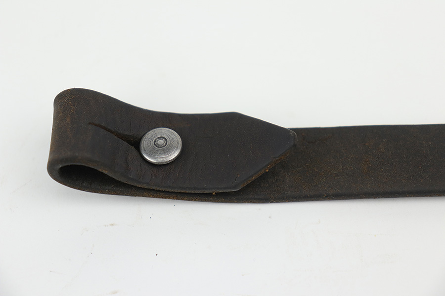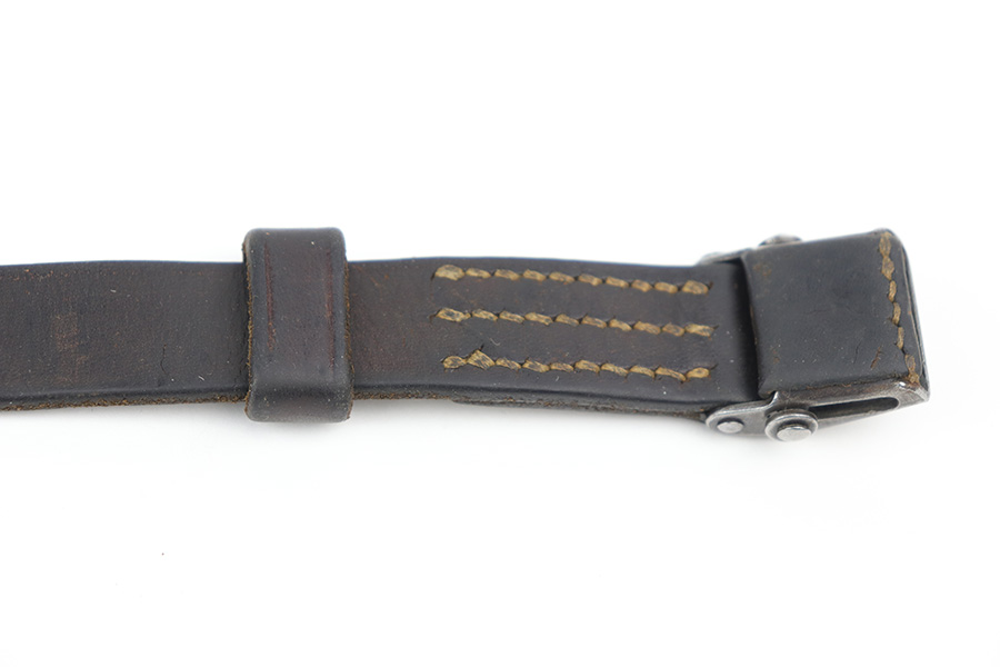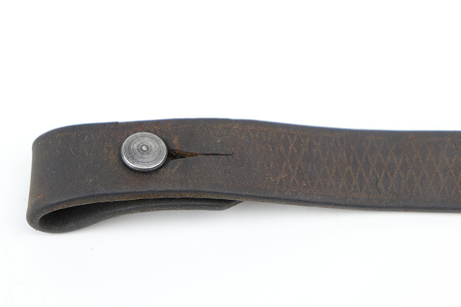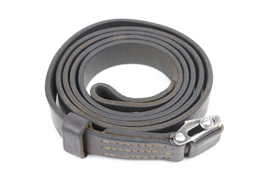 10/20/21 – This is a leather rifle sling for a K98 or similar sized rifle. There are no stamps or markings but the leather shows typical signs of aging and previous use. No excessive wear and all stitching in tact. Measures about 56 inches long.