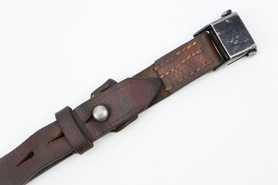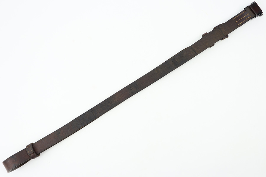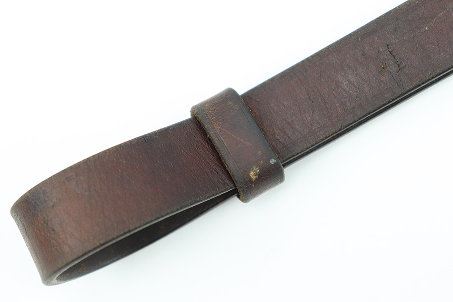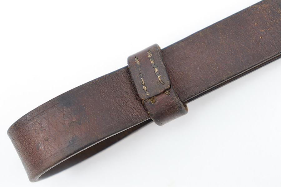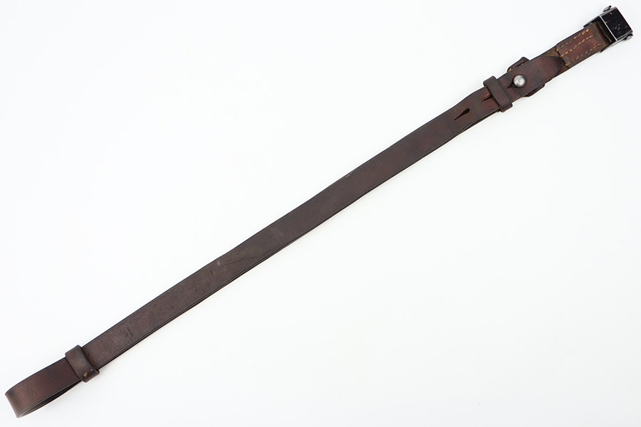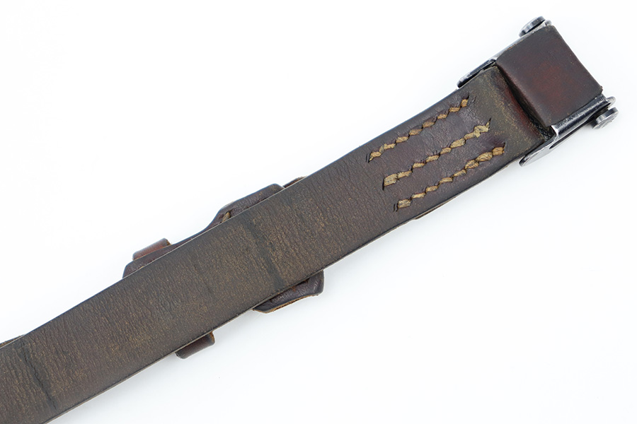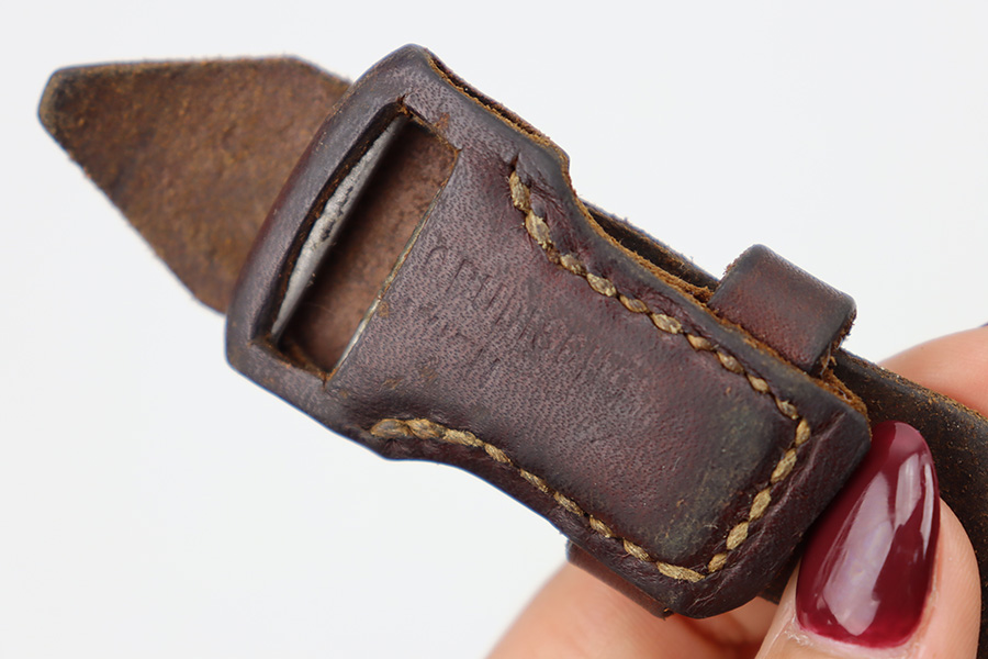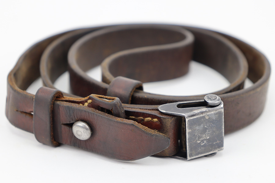11/20/23 – This is an original WW2 German K98 leather rifle sling. The sling comes with an original attached leather keeper as well. The keeper is maker stamped, and although faint it appears to read, “C. Budischow”. Great condition with normal pliability and light use wear but no major cracks or issues in the leather. All original stitching intact throughout as well.