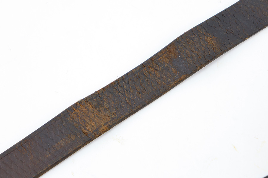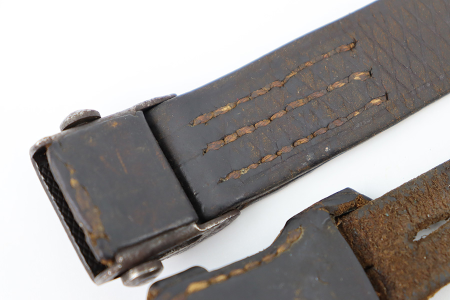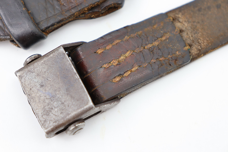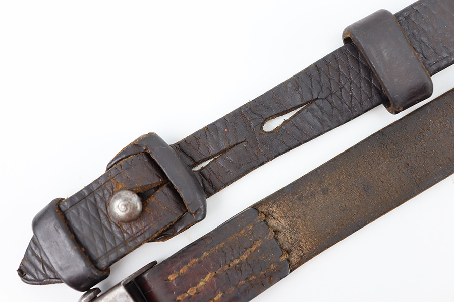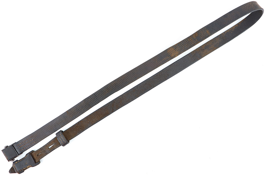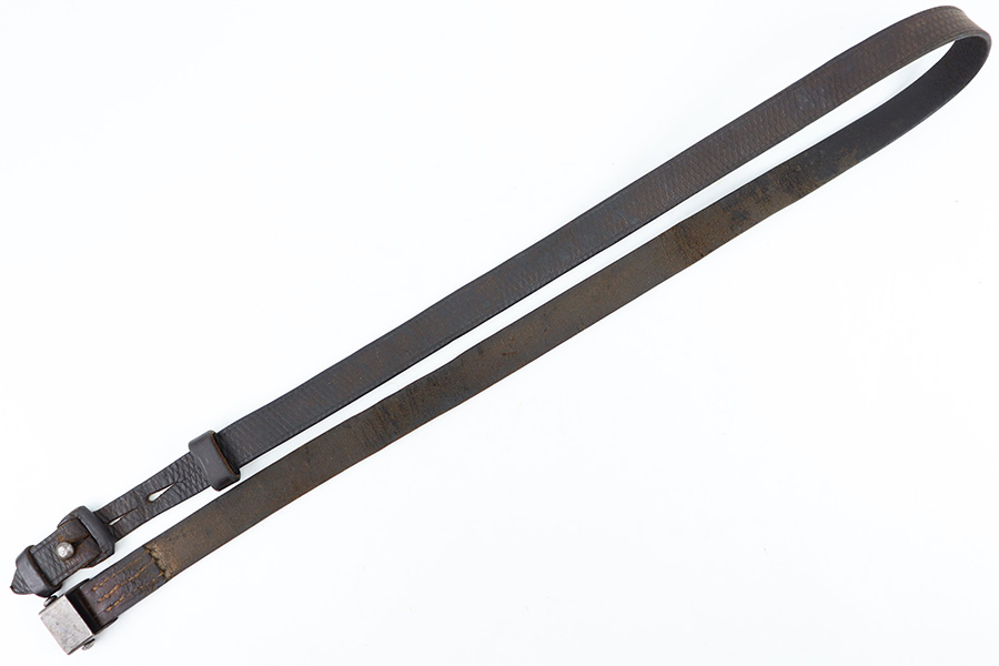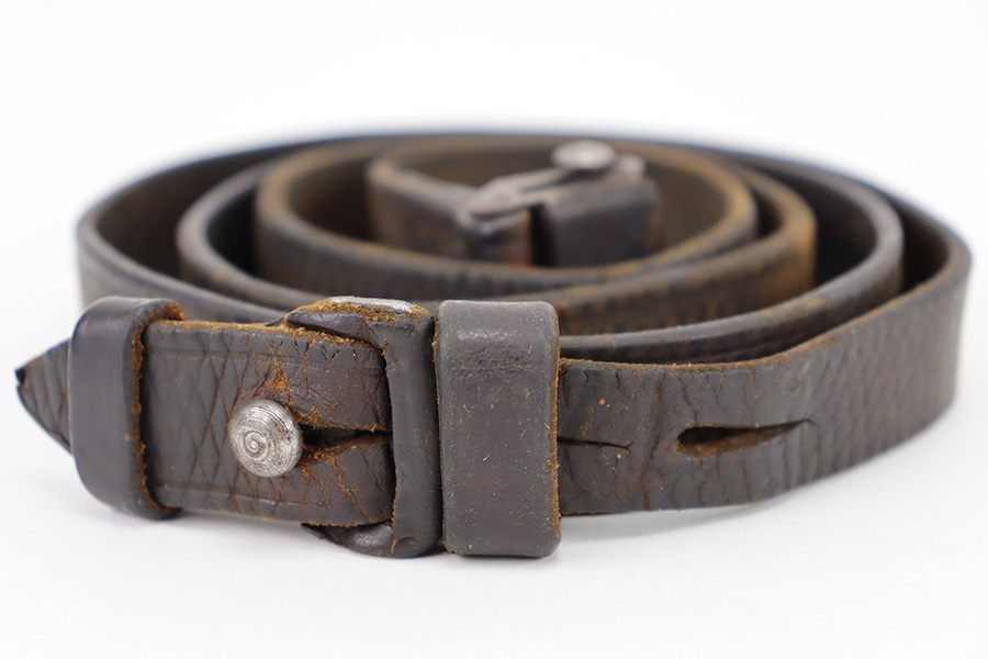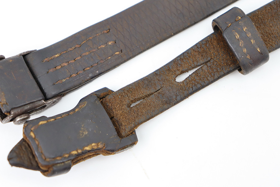 12/11/23 – This is an original WW2 era leather K98 rifle sling. The sling comes with an original leather keeper, as shown. Great overall condition with some mild surface wear and light aging throughout, but no major issues. Some general use wear but the leather is strong and all original stitching / fixtures are intact.