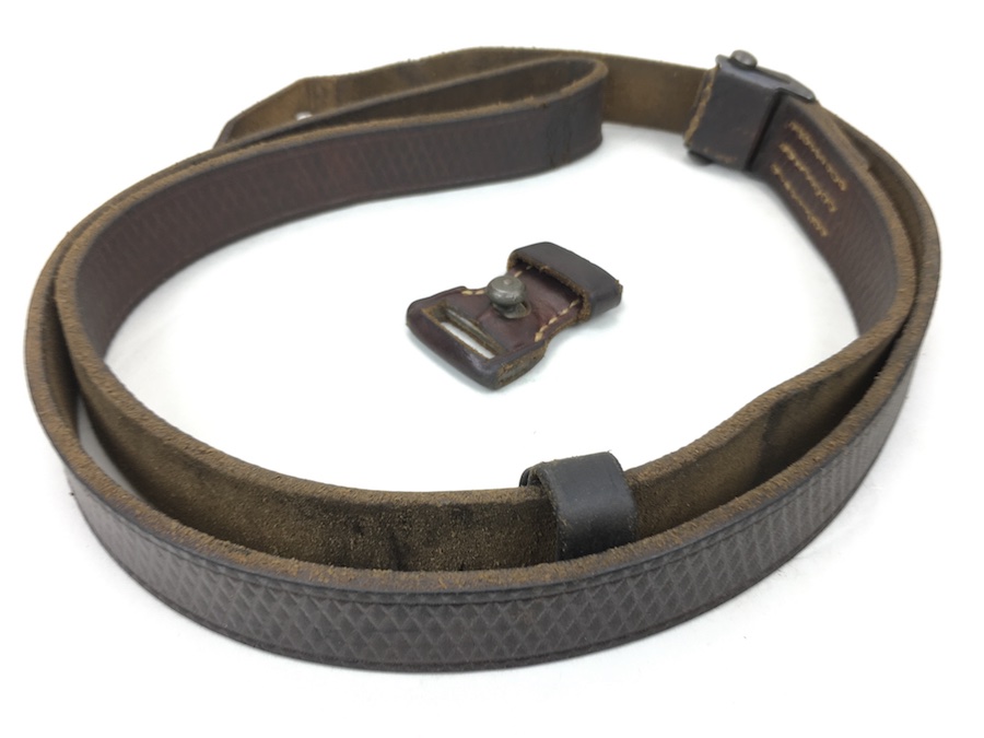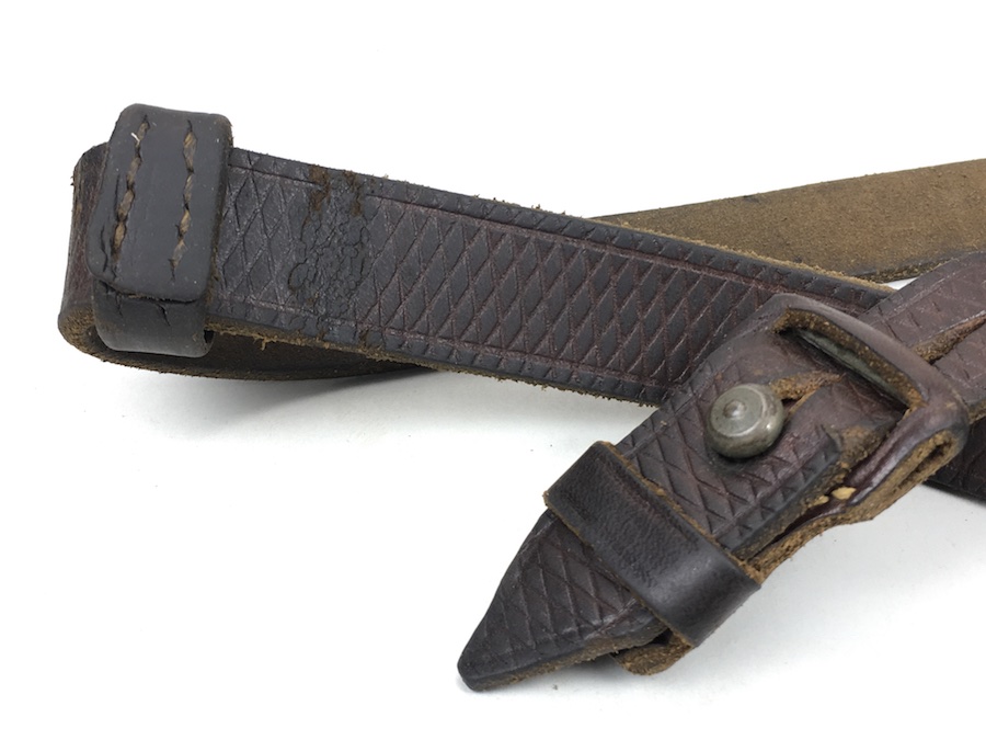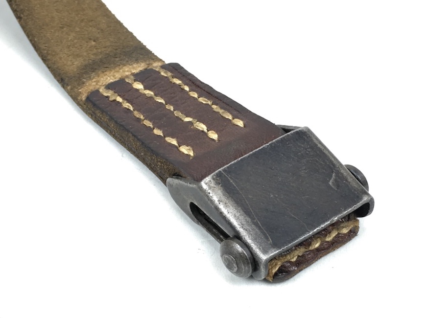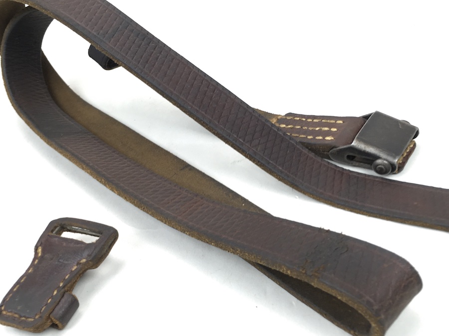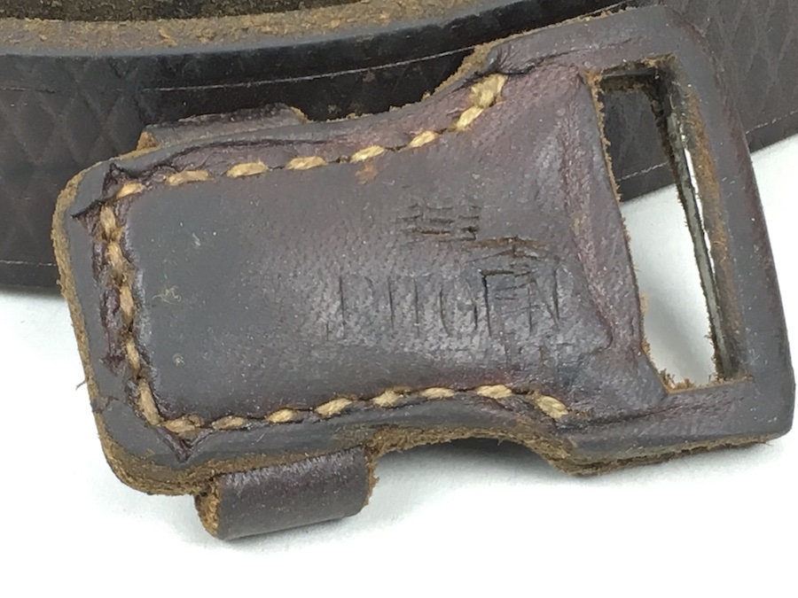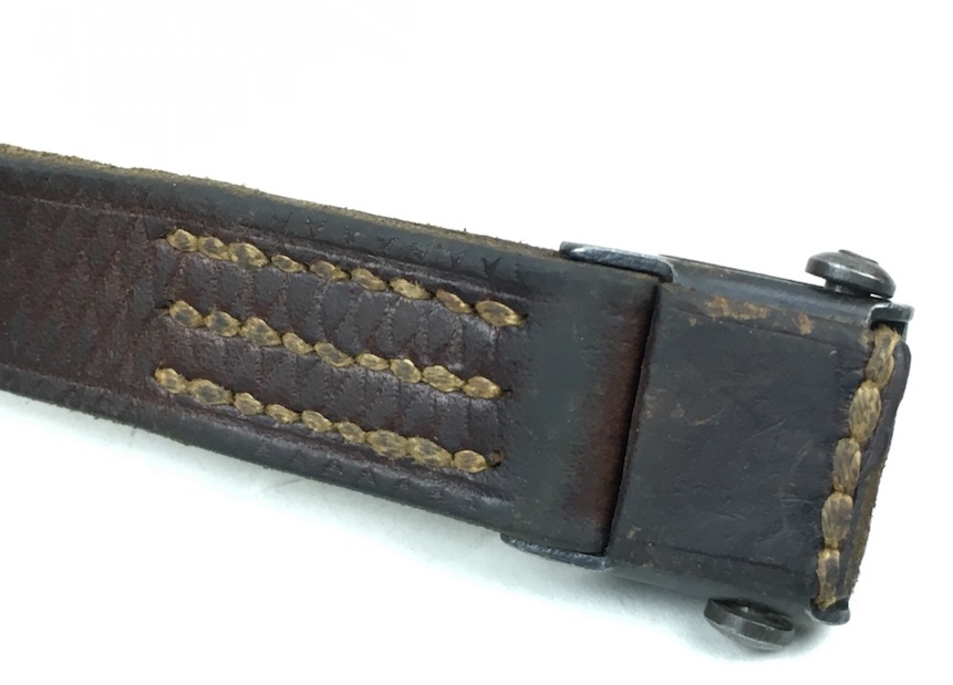 7/25/19 – This is an original and excellent condition leather strap for a K98 rifle manufactured during WWII. Maker stamped “RITGEN” on the rear of the keeper stud. There are no other markings. The leather is excellent and completely in tact with no notable flaws. The leather retains about 95% of the original herring bone pattern. The leather and stitching on the un-marked buckle is excellent. All the stitching is original as well without issues. Very nice piece. Guaranteed original.