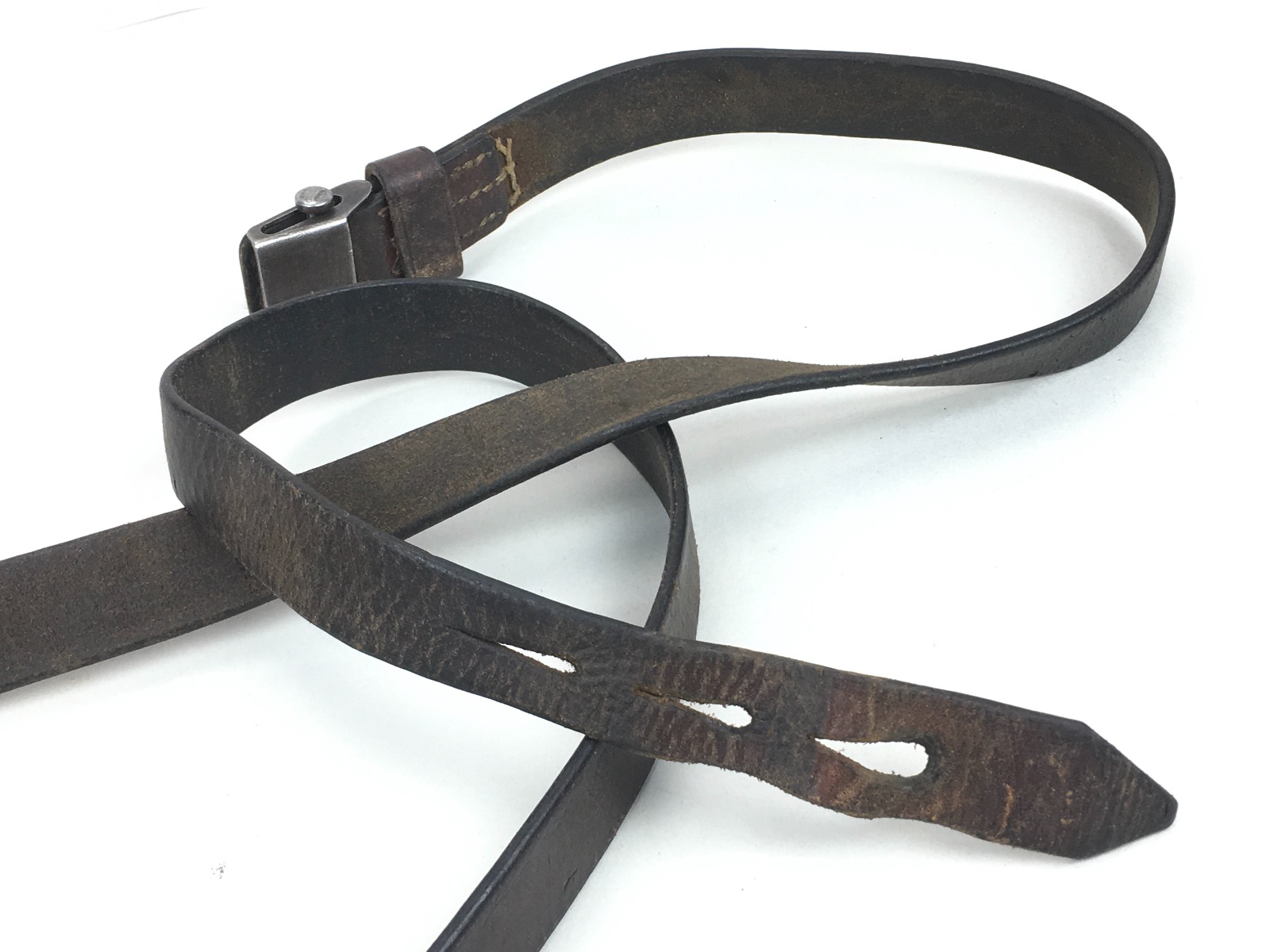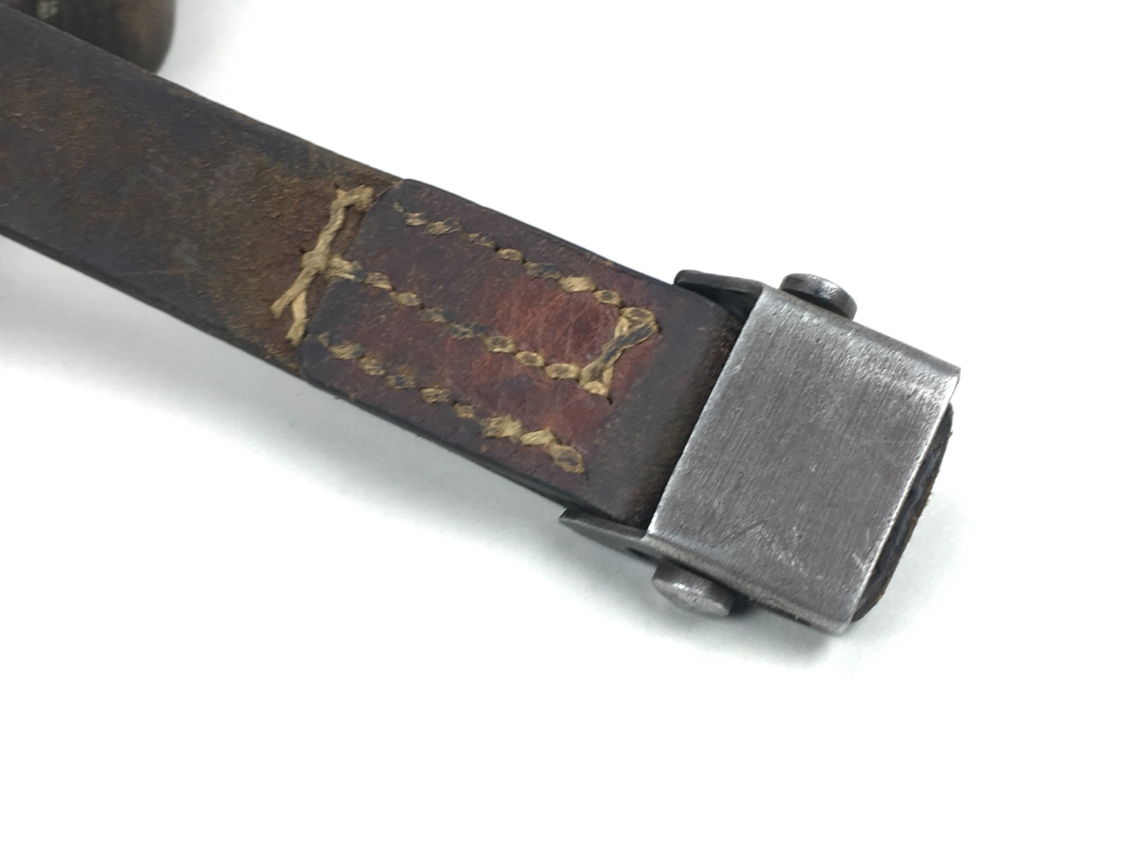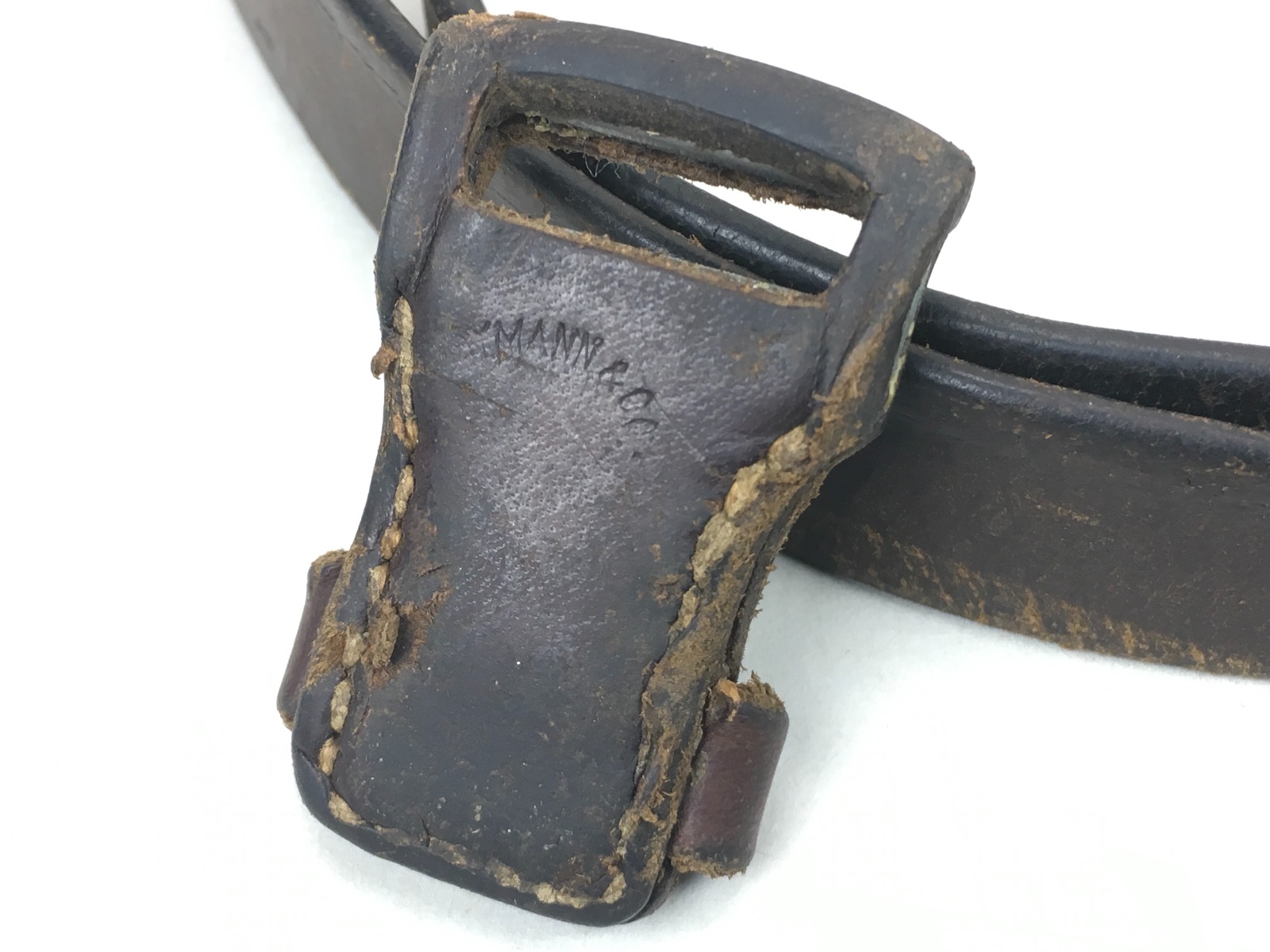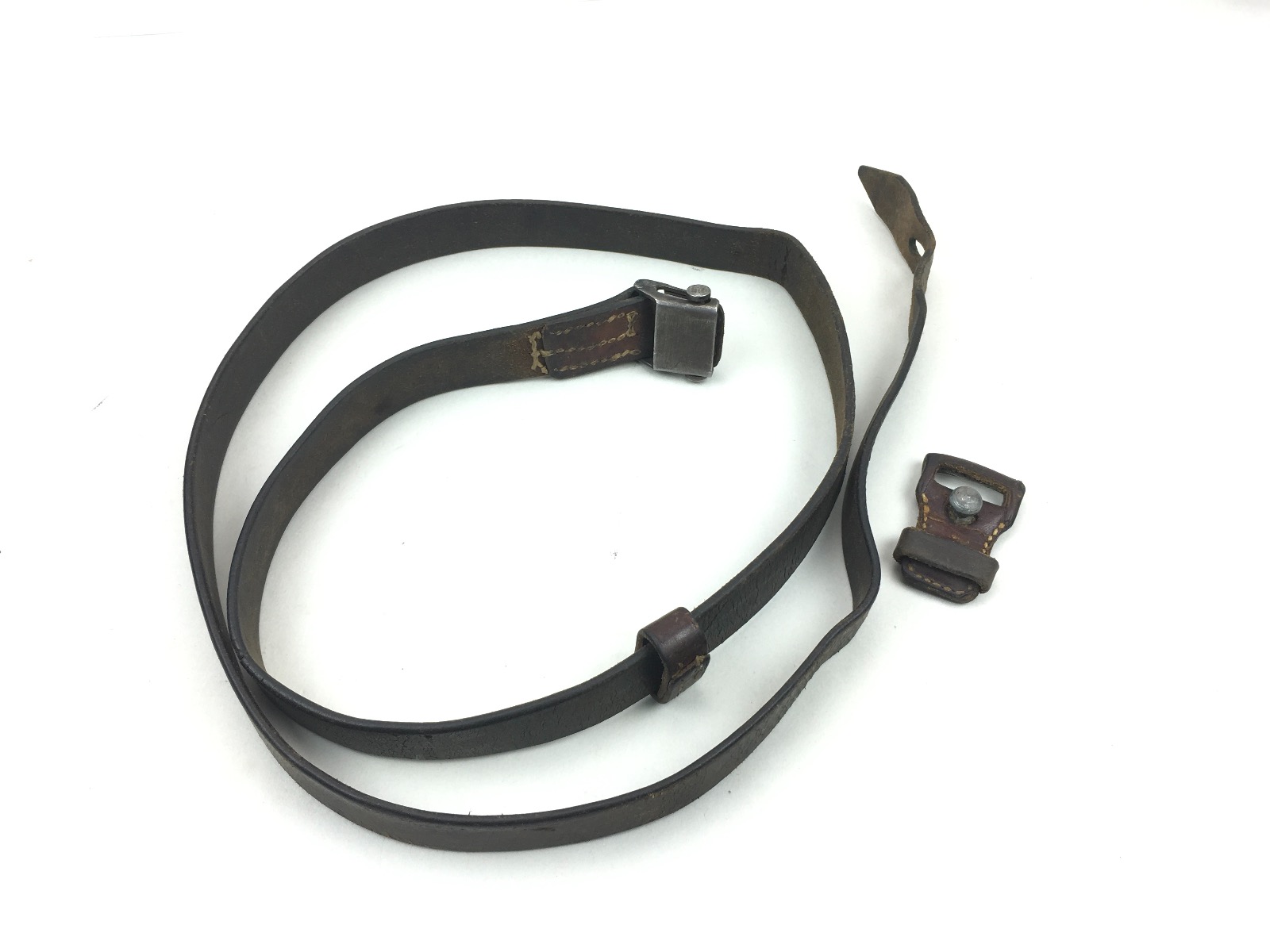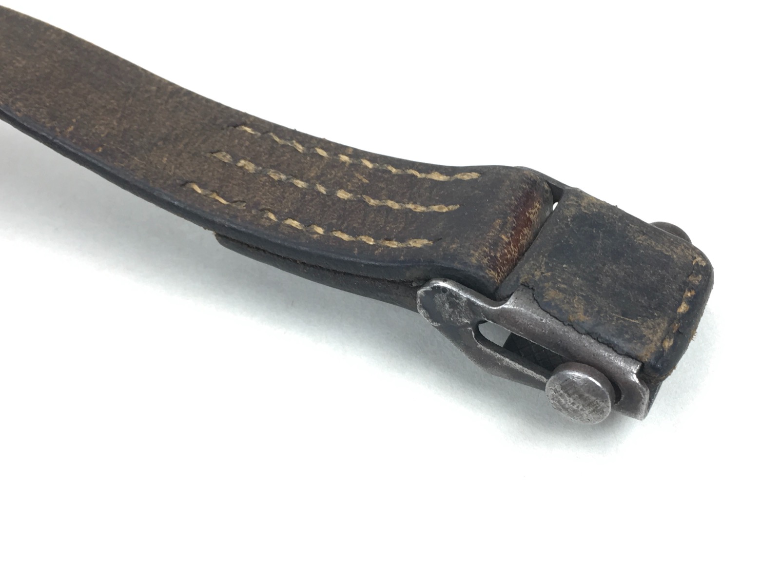 8/12/19 – This is an original WW2 era leather strap for a K98 rifle. The strap is maker marked on the rear of the keeper, however, the first few letters are unreadable. The clasp is unmarked. The leather is soft and completely in tact with no notable flaws. The stitching is all original as well without issues. Herringbone pattern is worn, but visible on about 50% of the sling. Guaranteed original.