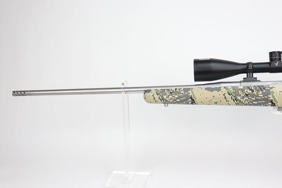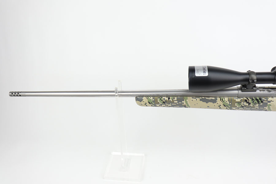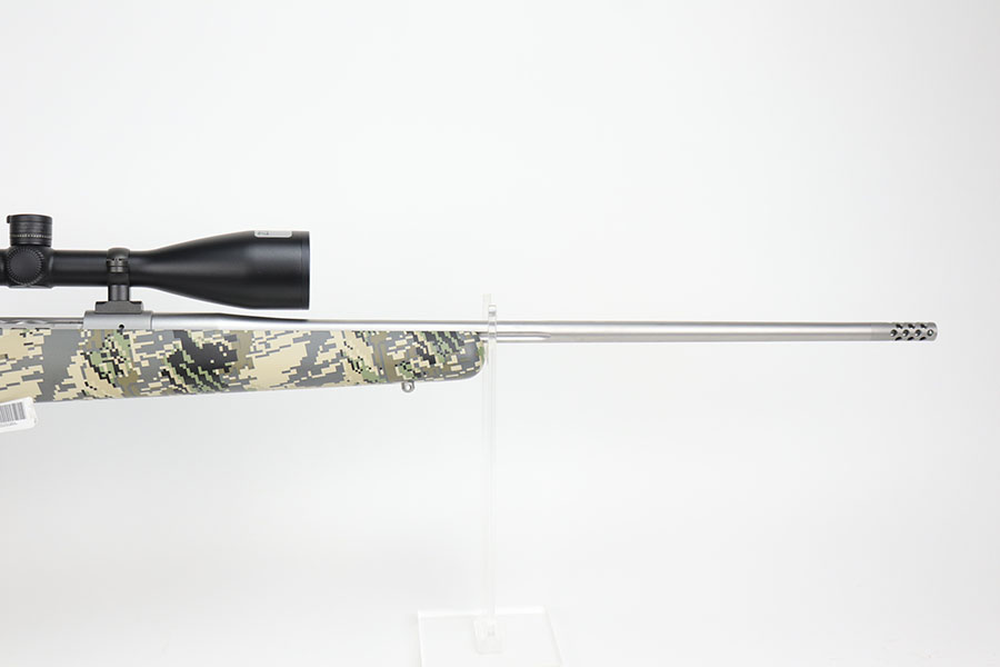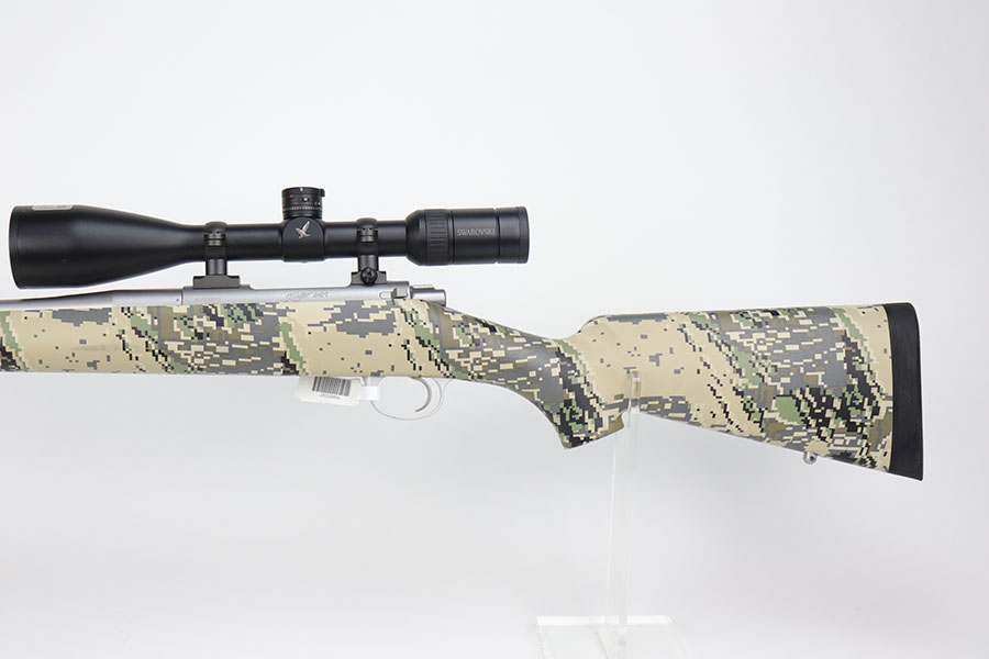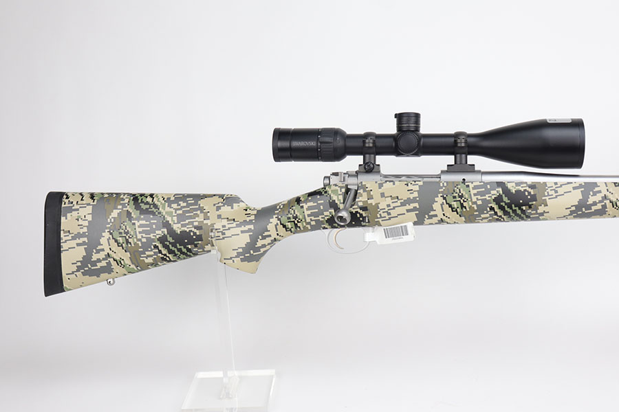 11/6/20 – This is a nearly unfired Kimber 84m Mountain Ascent in .308 WIN with Swarovski Z3 scope. This is a lightweight rifle, weighing in at less than five and a half pounds. The stock is reinforced carbon fiber with soft touch treatments and a one inch recoil pad. Length of pull is 13.75 inches, drop at heel is .54 inches. Four round magazine capacity. Muzzle brake and thread protector on barrel. Barrel is 24 inches long. The scope is a Swarovski Z3 4-12×50 with crystal clear optics. Also included is the original box for the scope with matching serial, and it contains the manual and lens caps. The rifle MSRP is just over $2000, and the scope over $800.