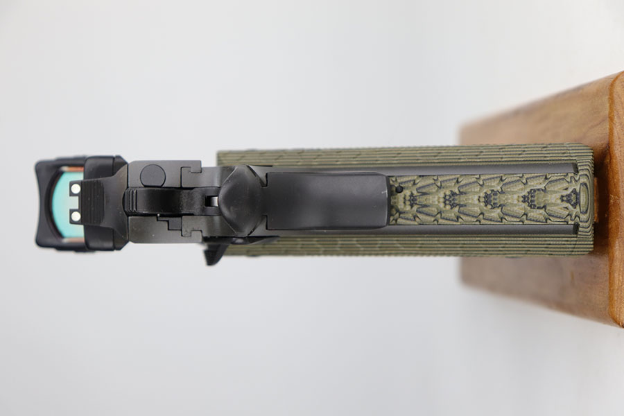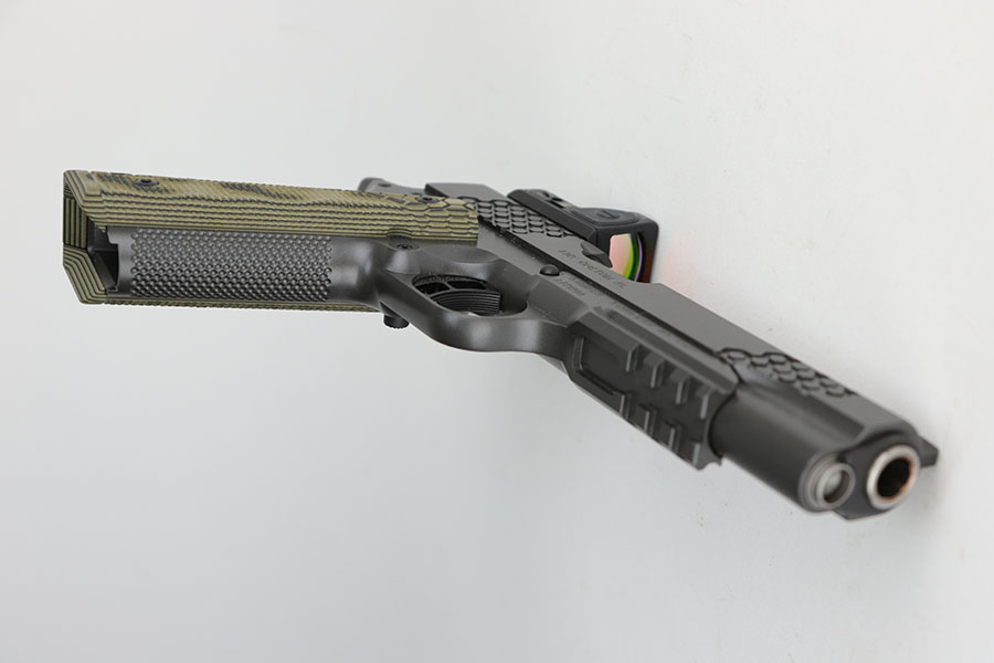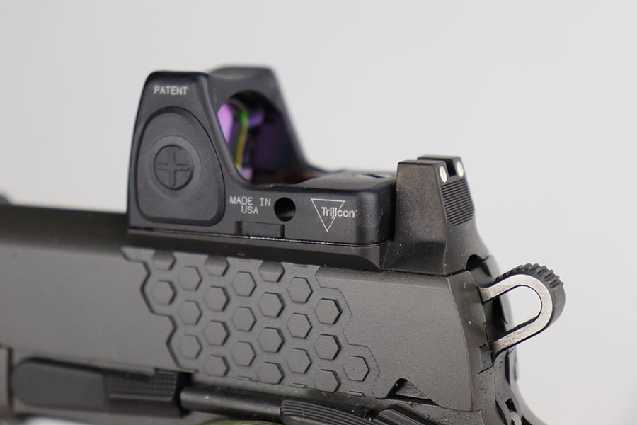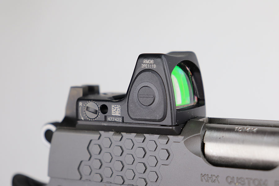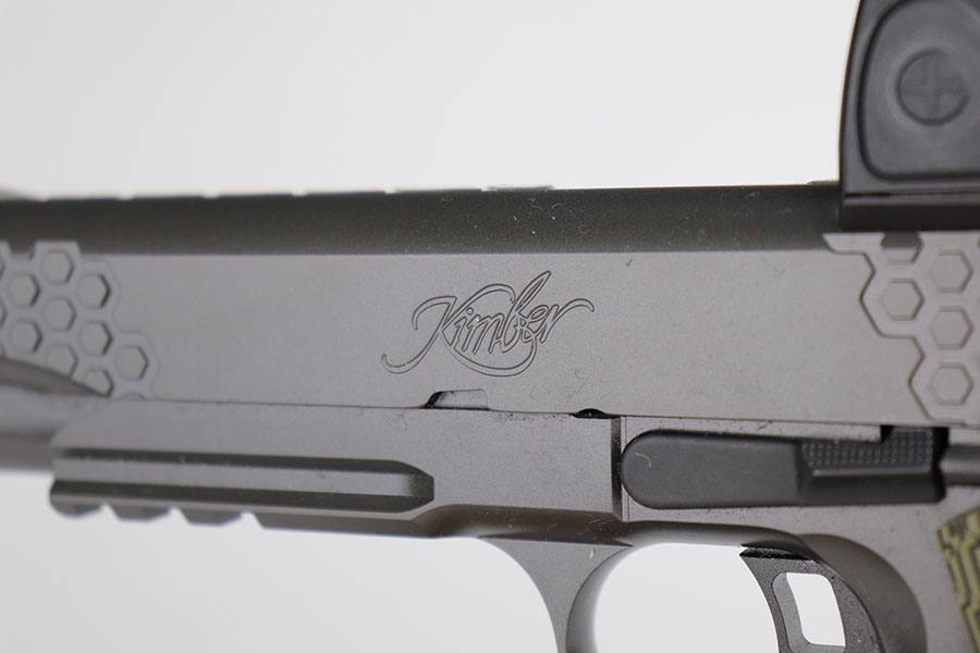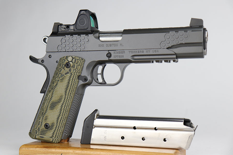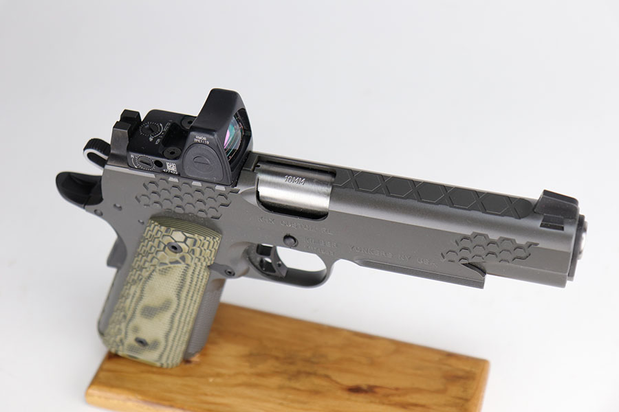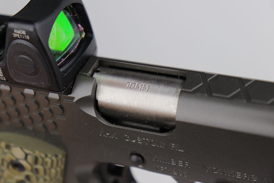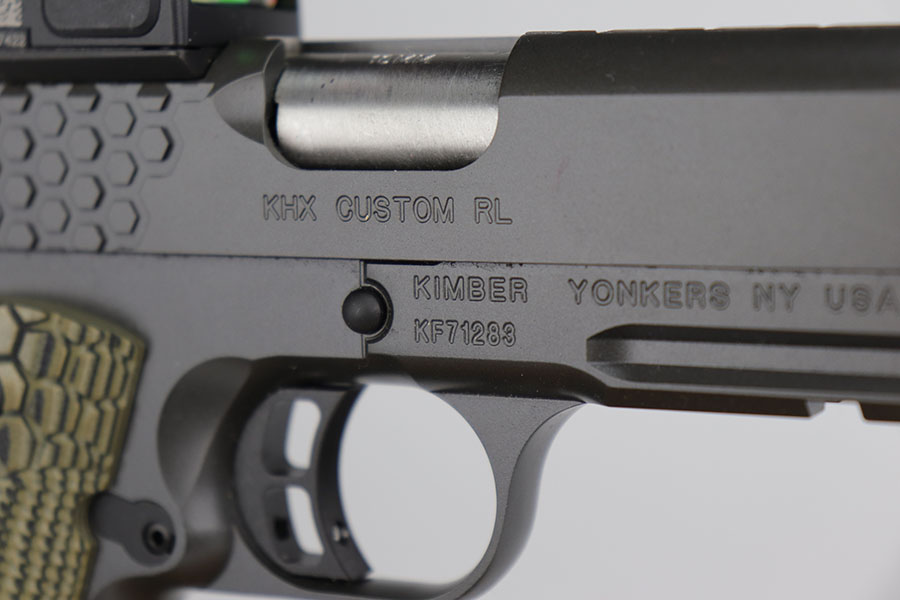 11/18/20 – This is a nearly unfired Kimber KHX Custom RL (OI) in 10mm. From Kimber: The Kimber KHX Custom RL (OI) Semi-Auto Pistol comes factory equipped with a Trijicon RMR Type 2 reflex sight, attached to a milled slide. The reflex sight provides rapid target/sight acquisition, while white dot, co-witness front and rear sights serve as back-up sights, with or without the reflex sight installed. A 1913 Picatinny rail on the frame allows the attachment of aftermarket tactical sights and lights. The fully supported match-grade barrel is fitted to the slide with a match-grade stainless steel bushing for incredibly consistent accuracy; and a full-length, steel guide rod ensures reliability. The stainless steel slide and frame of the KHX Custom RL (OI) are precision machined, and feature KimPro II gray finish. Stiplex front strap stippling, along with aggressively textured Hogue Magrip G-10 grip panels provide a solid, non-slip hold. The slide features hexagonal-pattern serrations at the front and back. An extended beavertail grip safety ensures a high grip; and protects the hammer when carrying the weapon cocked and locked. An aluminum match-grade trigger is factory set to break clean and crisp for precise shot placement and enhanced control during rapid fire. The Kimber KHX Custom RL (OI) Semi-Auto Pistol is a reliable sidearm for self-defense or tactical shooting competitions.