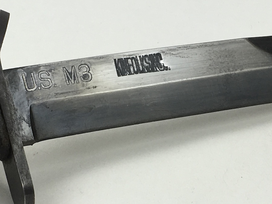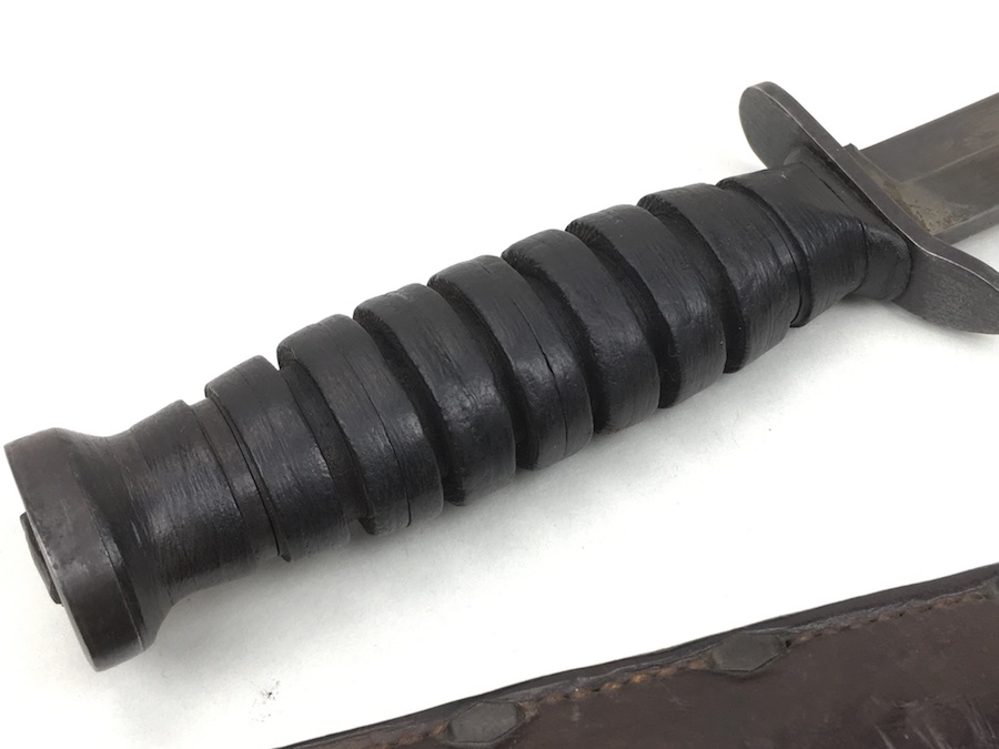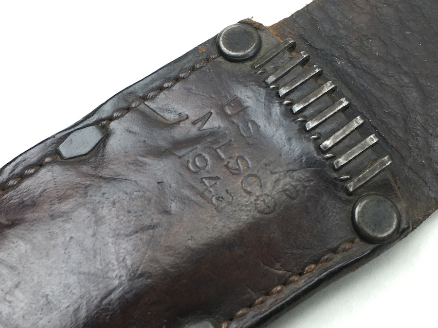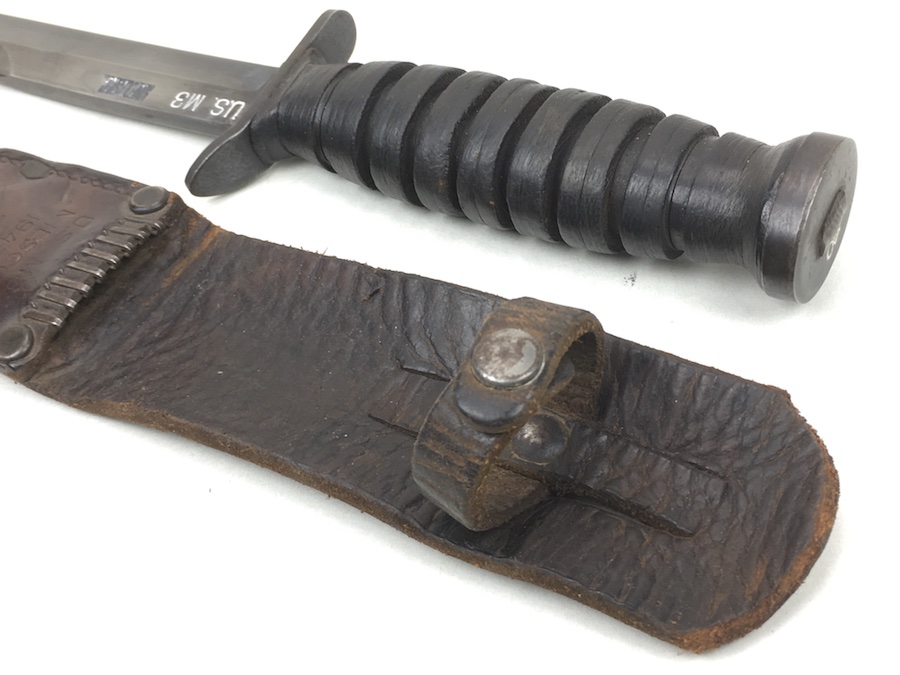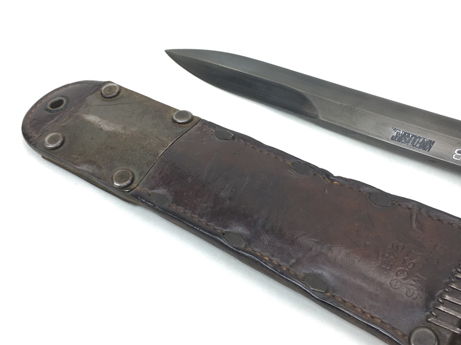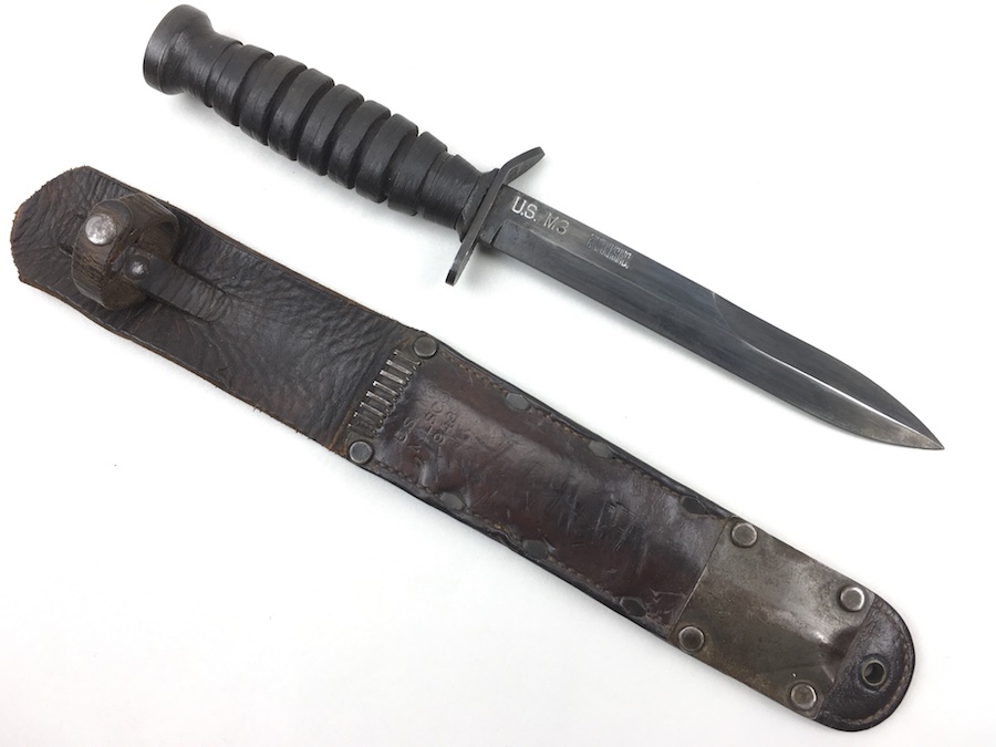 8/12/19 – This is an original & rare maker, Kinfolks M3 fighting knife with an original leather m6 scabbard. The blade is maker marked along with US and M3. The blued blade is in great condition but there is some bluing loss, as well as thinning throughout. No edge chips and no evidence of sharpening. Excellent and tight leather handle. The leather scabbard is stamped 1943 MILSCO. The leather is excellent. Some normal wear and aging, but very nice for an earlier variation like this.