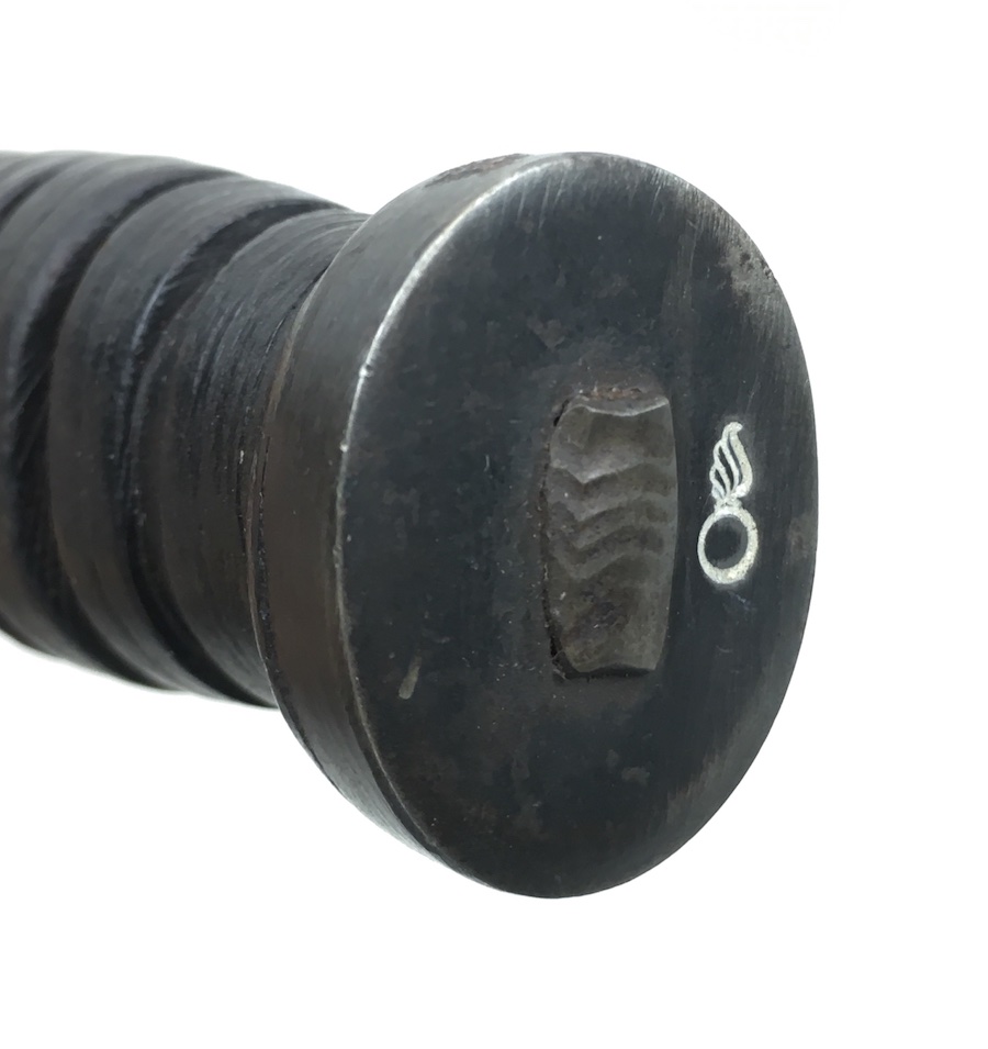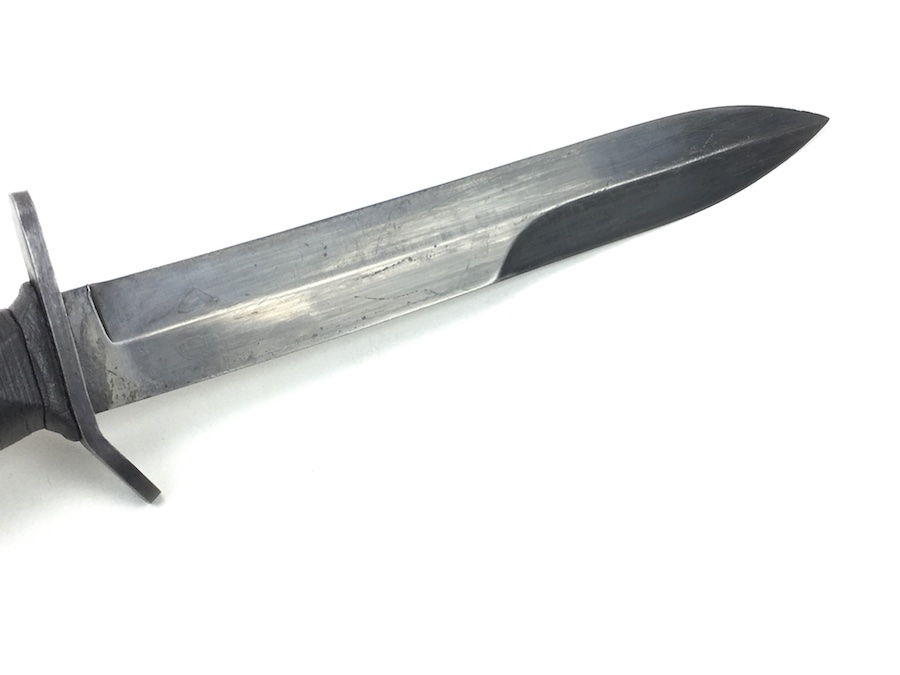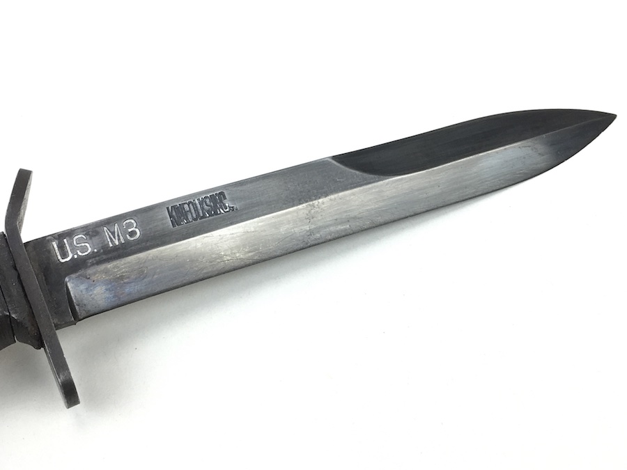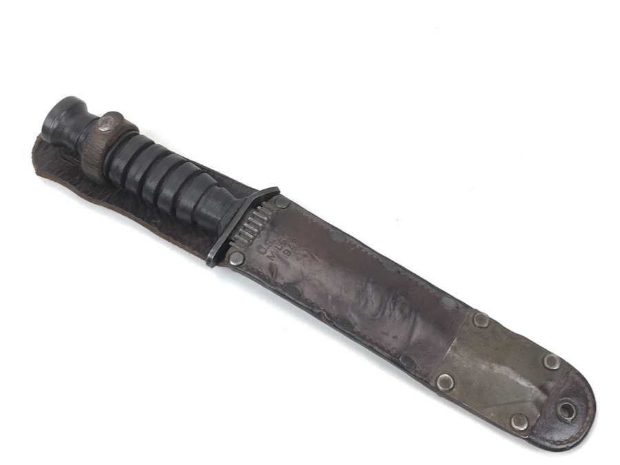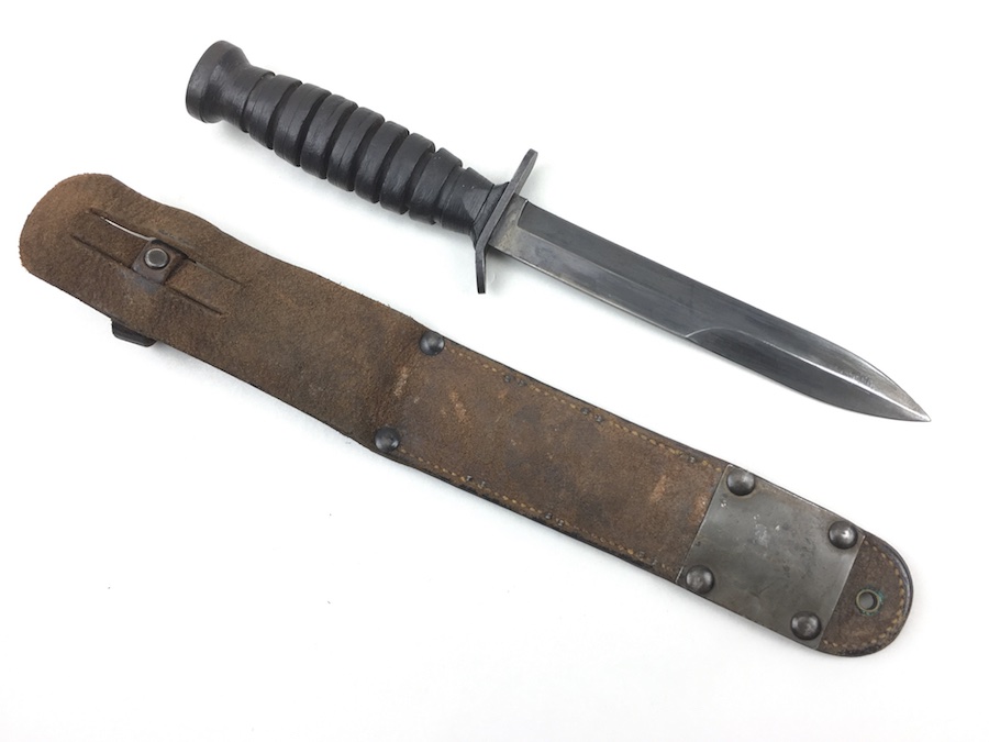 8/12/19 – This is an original & rare maker, Kinfolks M3 fighting knife with an original leather m6 scabbard. The blade is maker marked along with US and M3. The blued blade is in great condition but there is some bluing loss, as well as thinning throughout. No edge chips and no evidence of sharpening. Excellent and tight leather handle. The leather scabbard is stamped 1943 MILSCO. The leather is excellent. Some normal wear and aging, but very nice for an earlier variation like this.