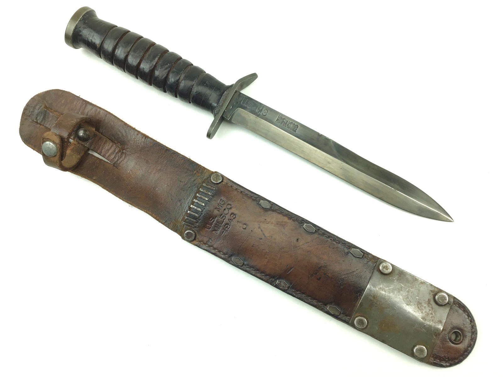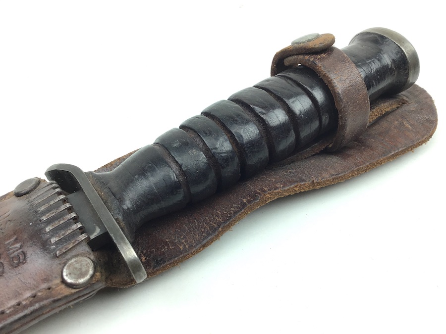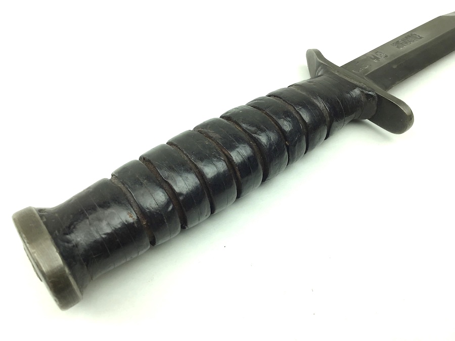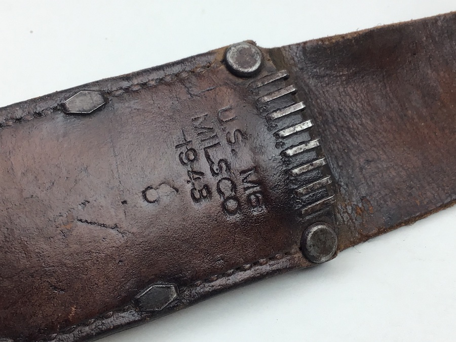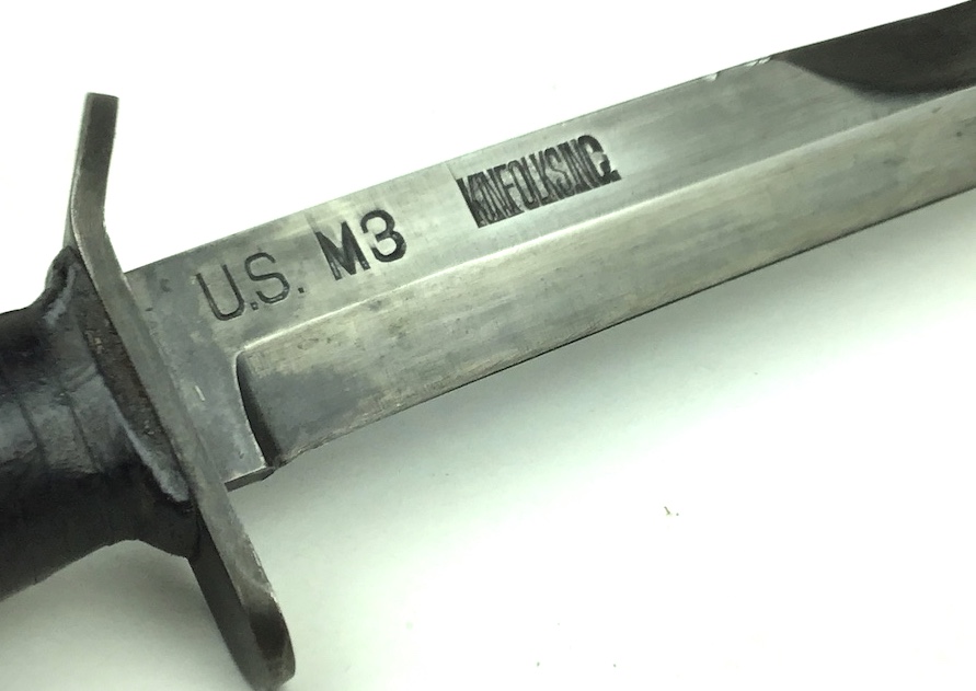 5/13/20 – This is an original & rare maker, Kinfolks M3 fighting knife with an original leather m6 scabbard. The blade is maker marked along with US and M3. The blued blade is in great condition but there is some bluing loss, as well as thinning throughout. No edge chips and no evidence of sharpening. Excellent and tight leather handle. Cross guard wiggles just slightly, but it is secure. The leather scabbard is stamped 1943 MILSCO. The leather is excellent. Some normal wear and aging, but very nice for an earlier variation like this.