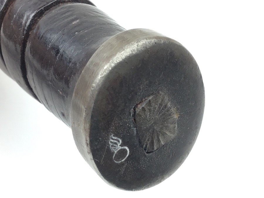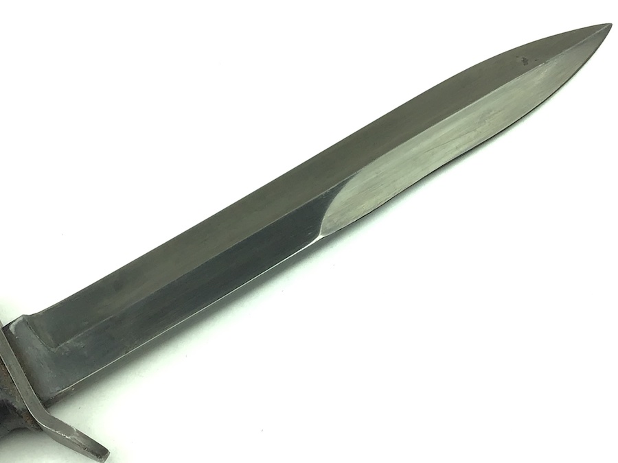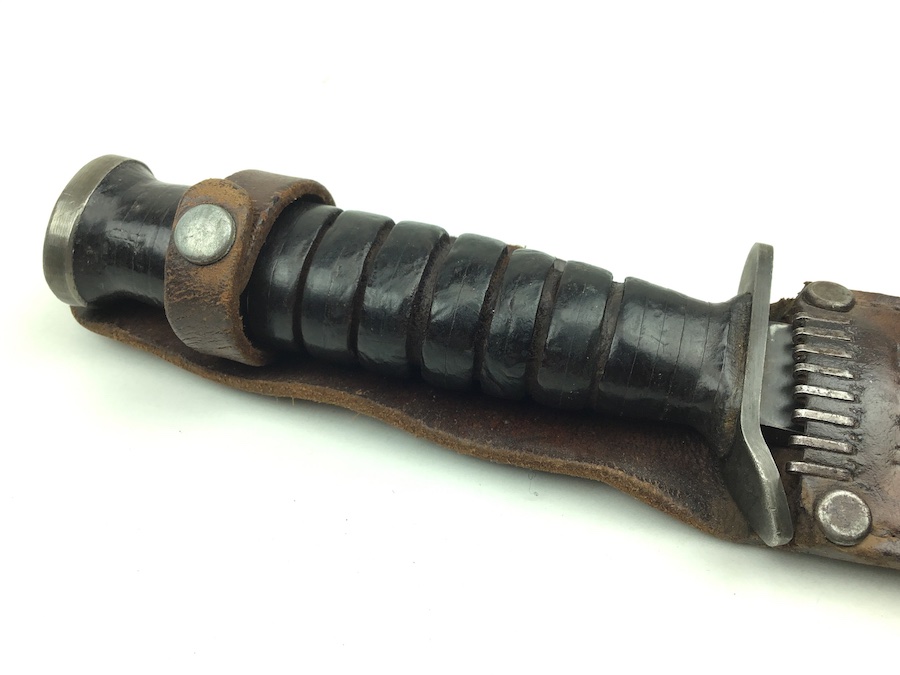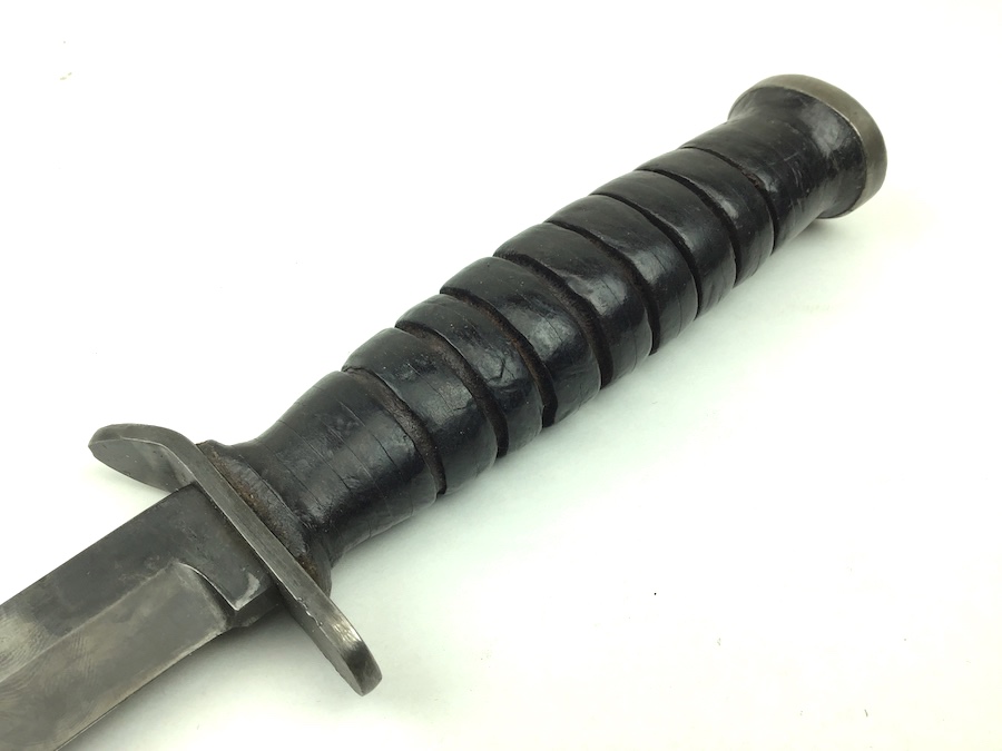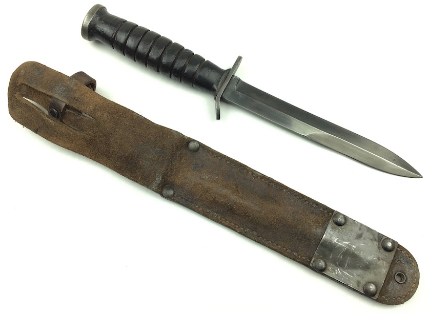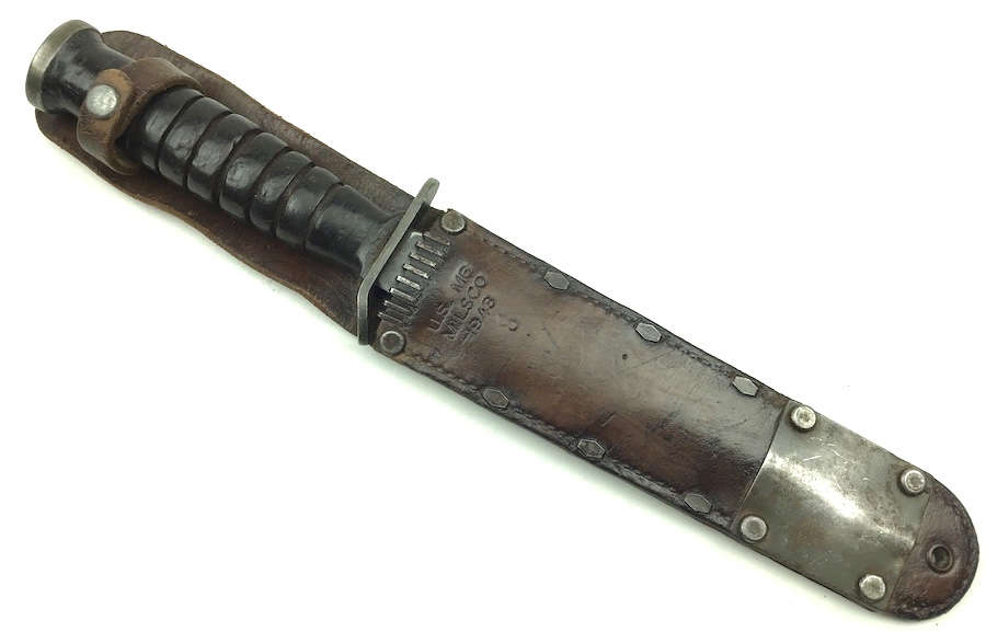 5/13/20 – This is an original & rare maker, Kinfolks M3 fighting knife with an original leather m6 scabbard. The blade is maker marked along with US and M3. The blued blade is in great condition but there is some bluing loss, as well as thinning throughout. No edge chips and no evidence of sharpening. Excellent and tight leather handle. Cross guard wiggles just slightly, but it is secure. The leather scabbard is stamped 1943 MILSCO. The leather is excellent. Some normal wear and aging, but very nice for an earlier variation like this.