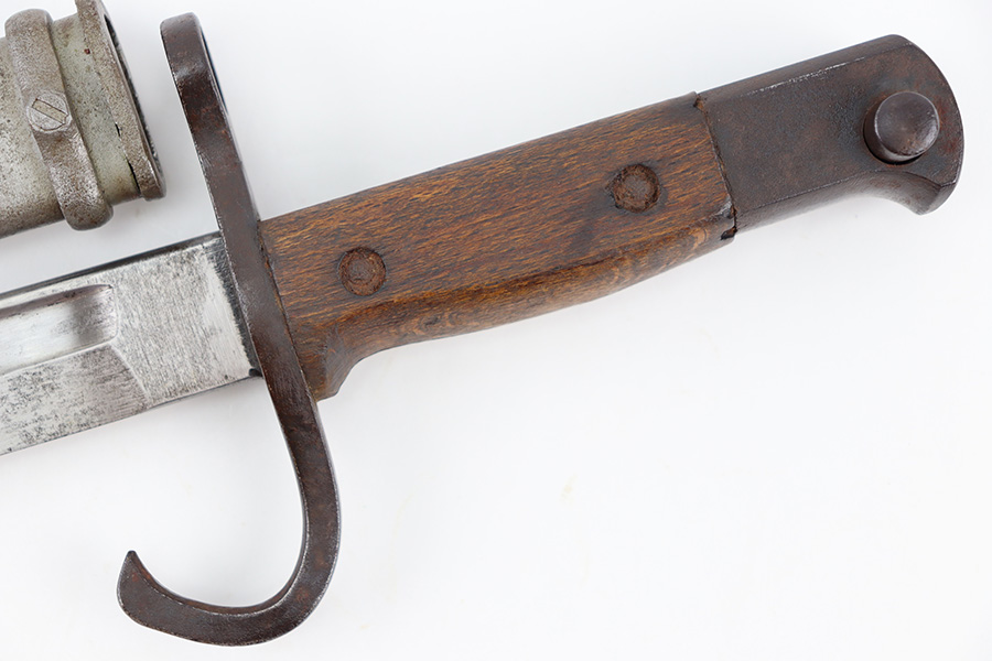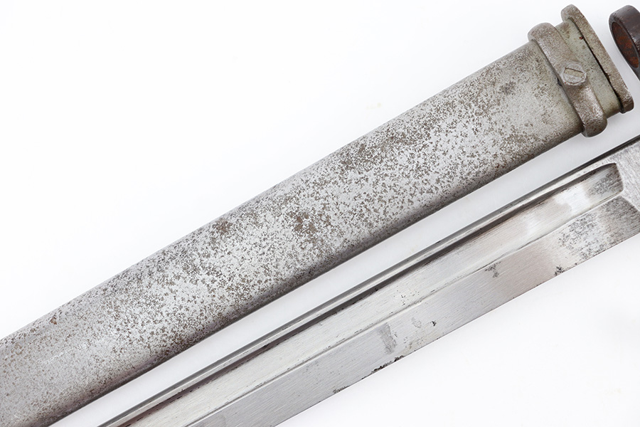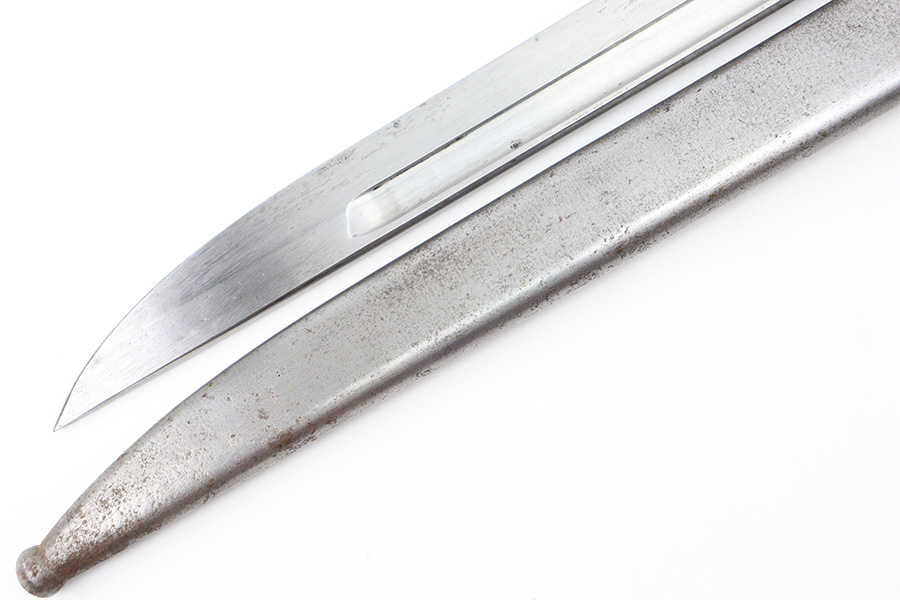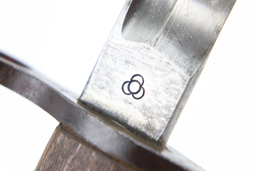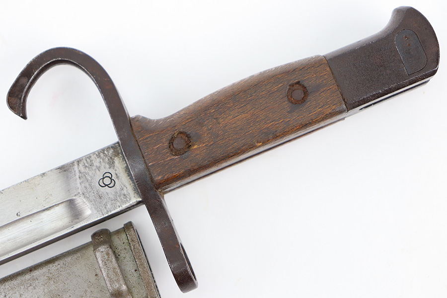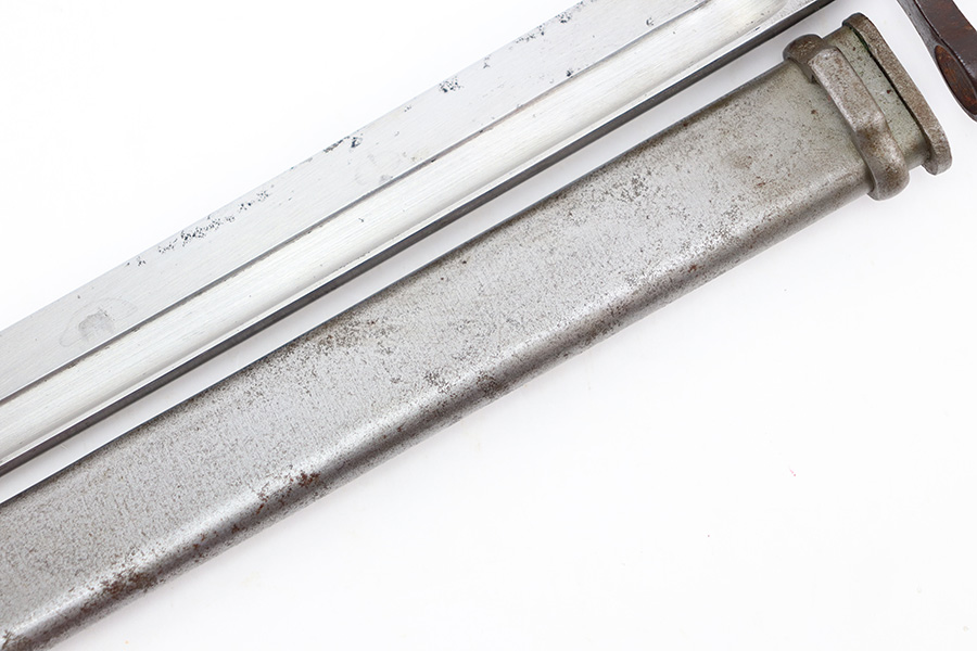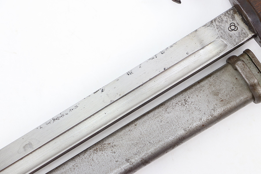 12/11/23 – This is an original WW2 production Type 30 bayonet. The bayonet is maker stamped by Kokura Arsenal on the blade. Cited in Labar’s book as LB-83 on page 110. The bayonet features a bright, fullered blade that’s clean and in near-excellent condition. Hooked crossguard. Contoured wood grips with 2 rivets, and a bird’s head pommel which is serial / lot numbered. Comes with a ball-tipped metal scabbard which is missing all of the original finish. There’s surface pitting throughout the scabbard as well, but still fits and functions without issue.