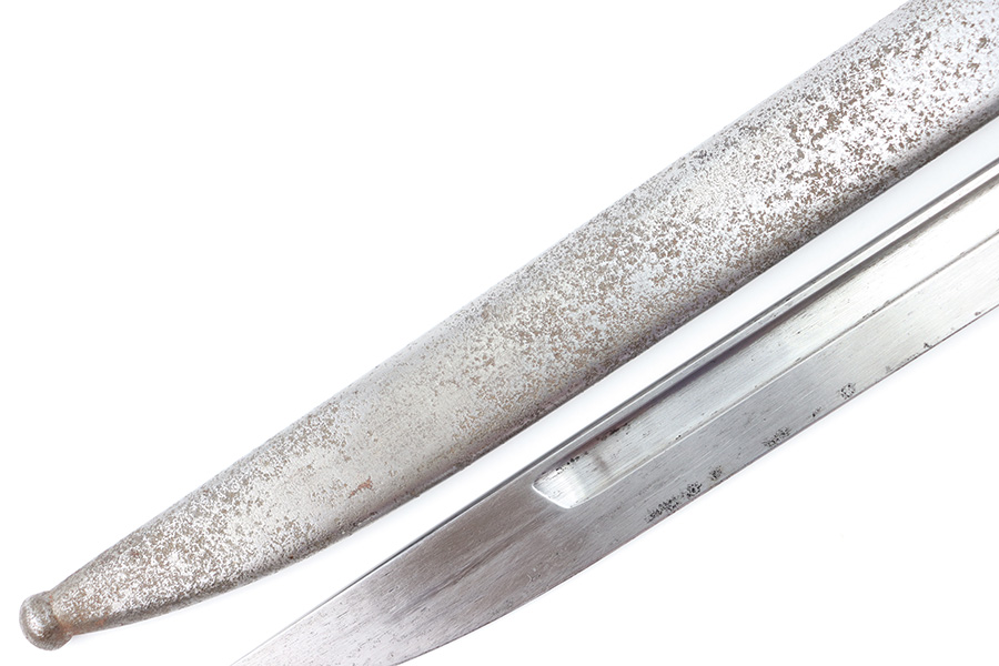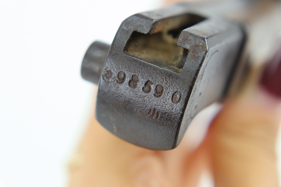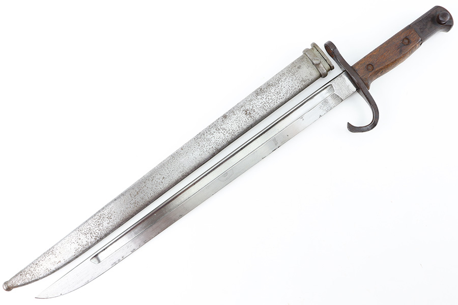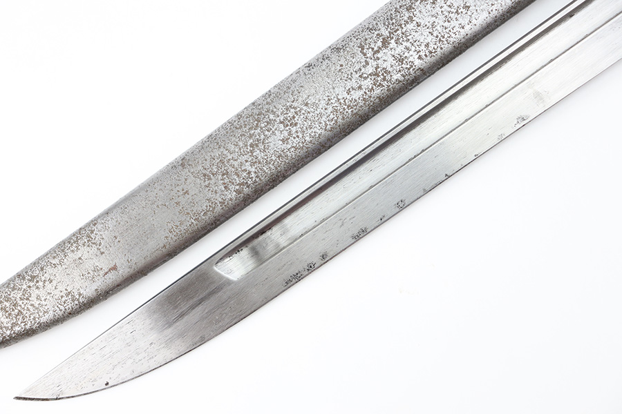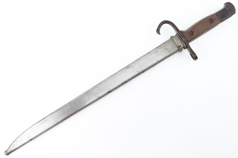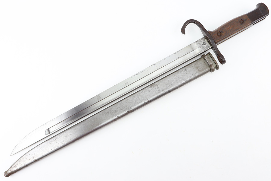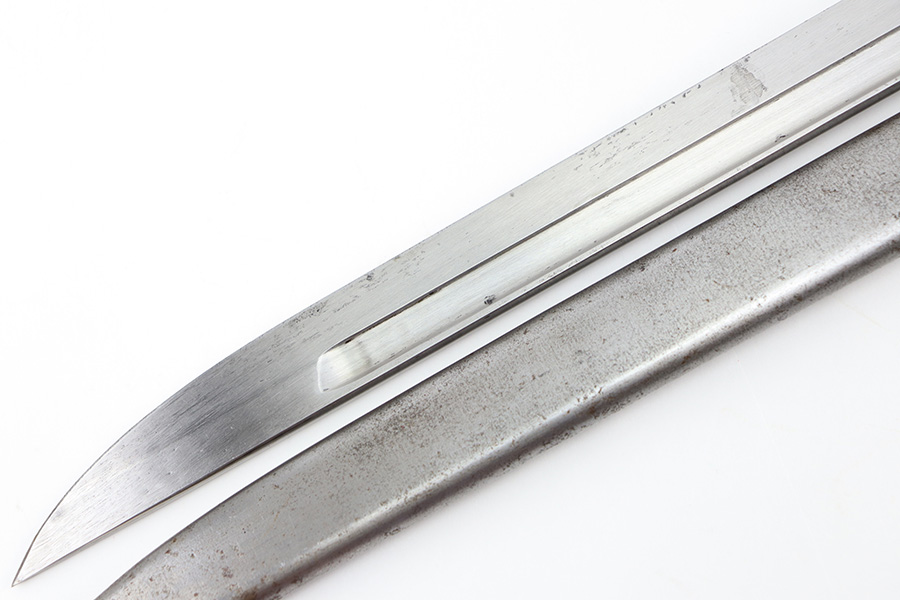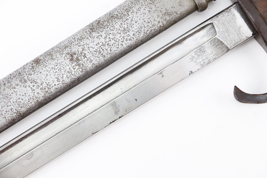 12/11/23 – This is an original WW2 production Type 30 bayonet. The bayonet is maker stamped by Kokura Arsenal on the blade. Cited in Labar’s book as LB-83 on page 110. The bayonet features a bright, fullered blade that’s clean and in near-excellent condition. Hooked crossguard. Contoured wood grips with 2 rivets, and a bird’s head pommel which is serial / lot numbered. Comes with a ball-tipped metal scabbard which is missing all of the original finish. There’s surface pitting throughout the scabbard as well, but still fits and functions without issue.