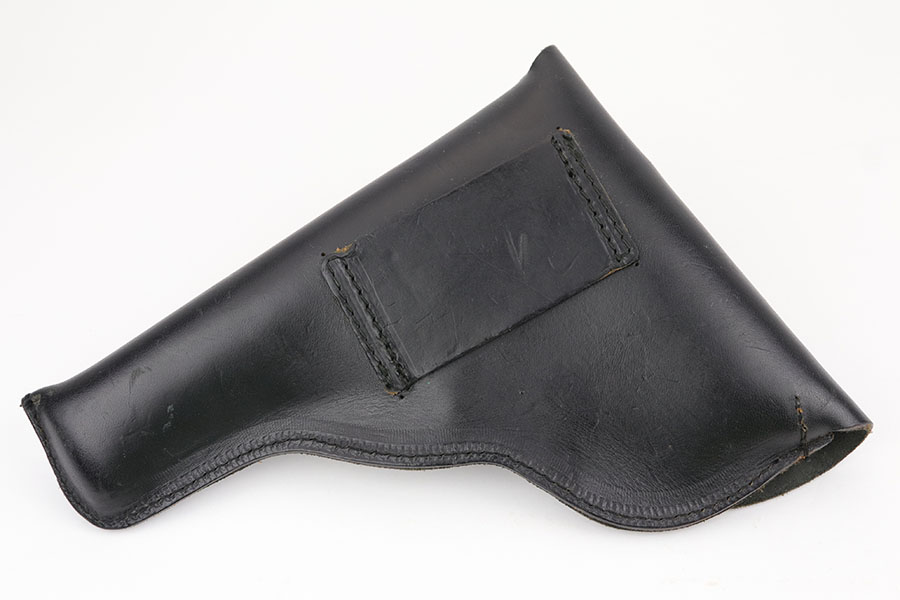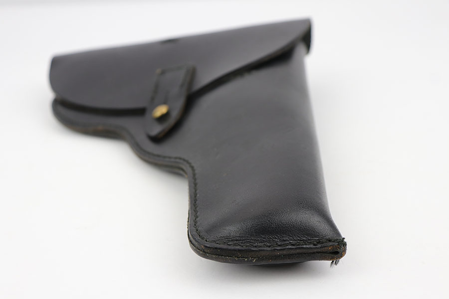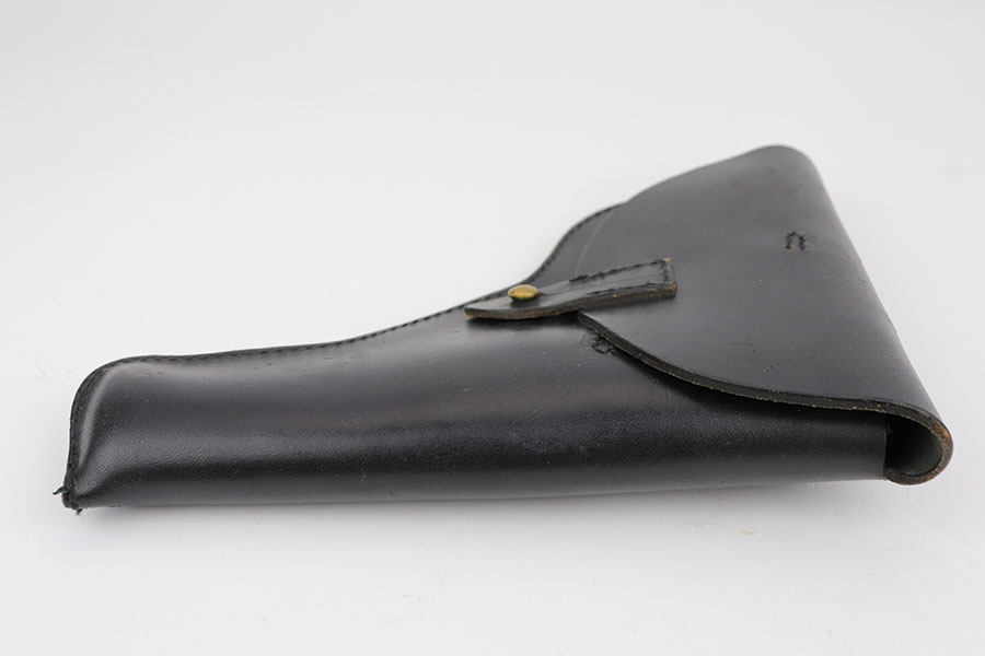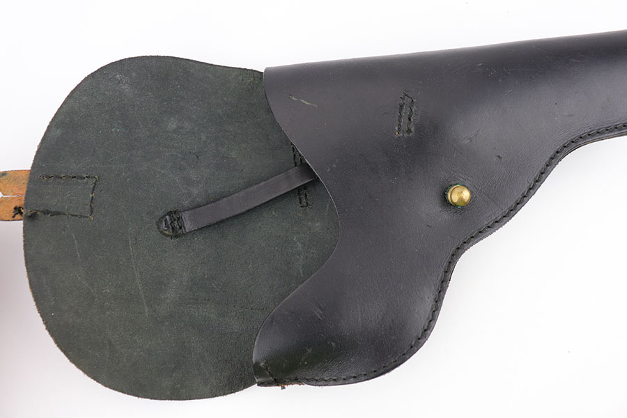 9/3/19 – This is (what we believe) a Norwegian model 1914 “Kongsberg Colt” holster from pre/early WW2. The holster is unmarked, but of similar style and construction of other Kongsberg model 1914 holsters. The leather is black and in great overall condition with minimal scuffs and wear. The stitching is black as well and all in tact. Brass closure stud as well. Appears original and authentic.