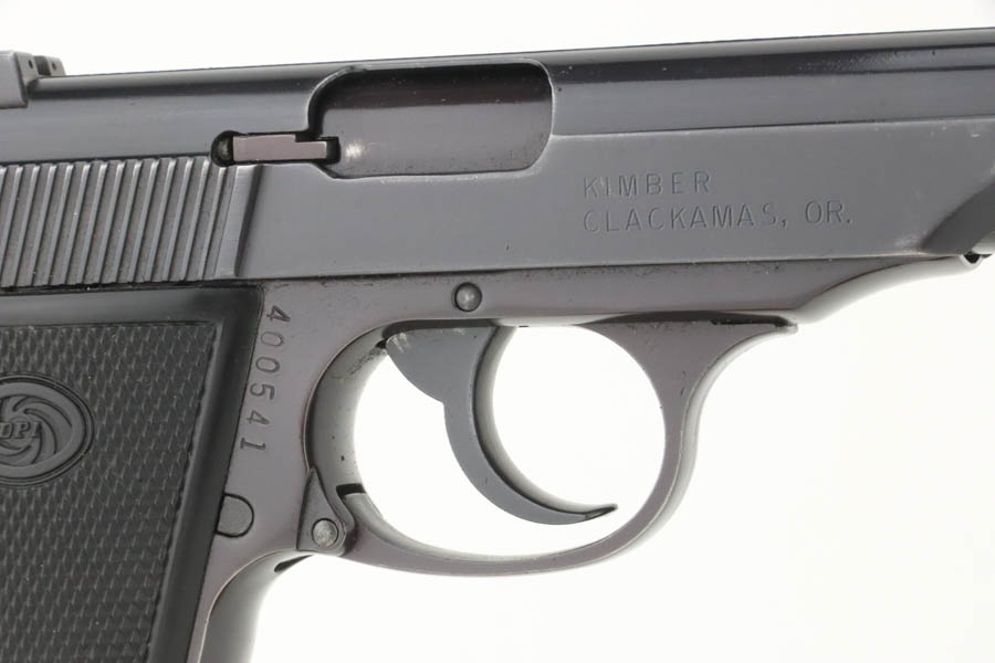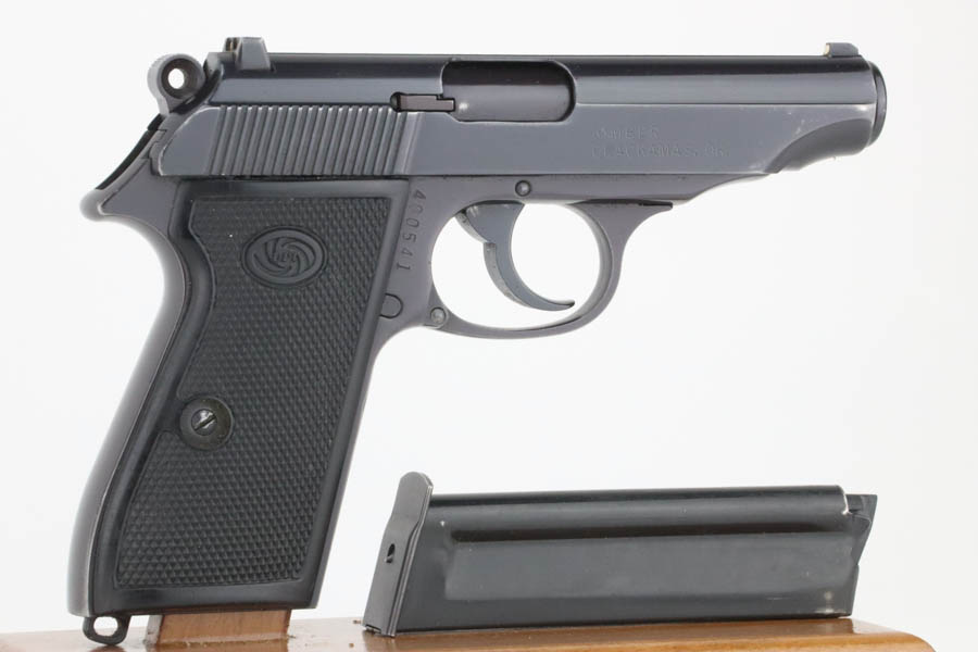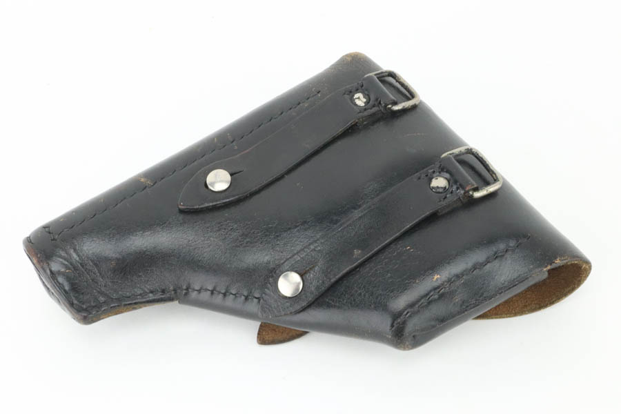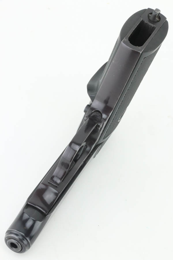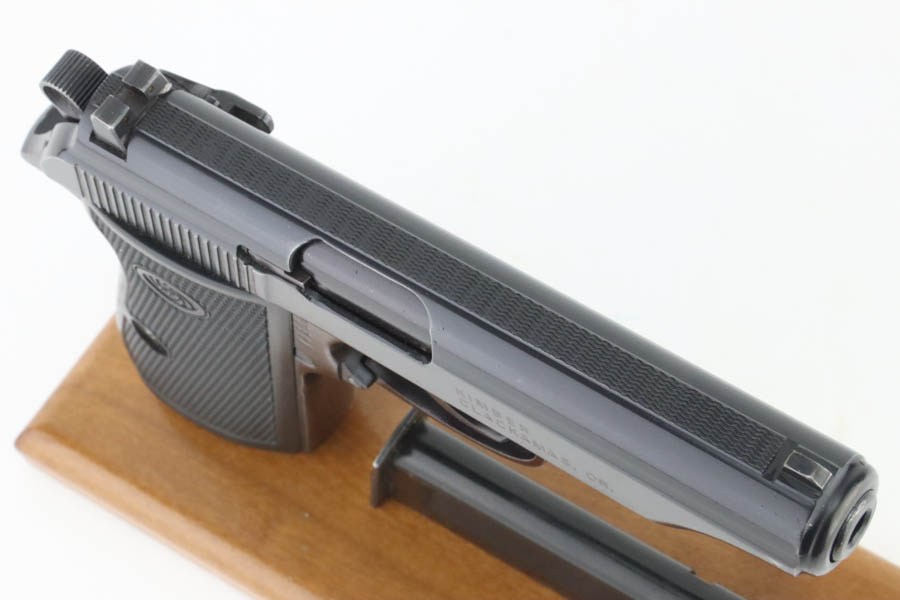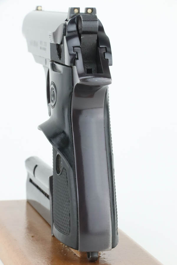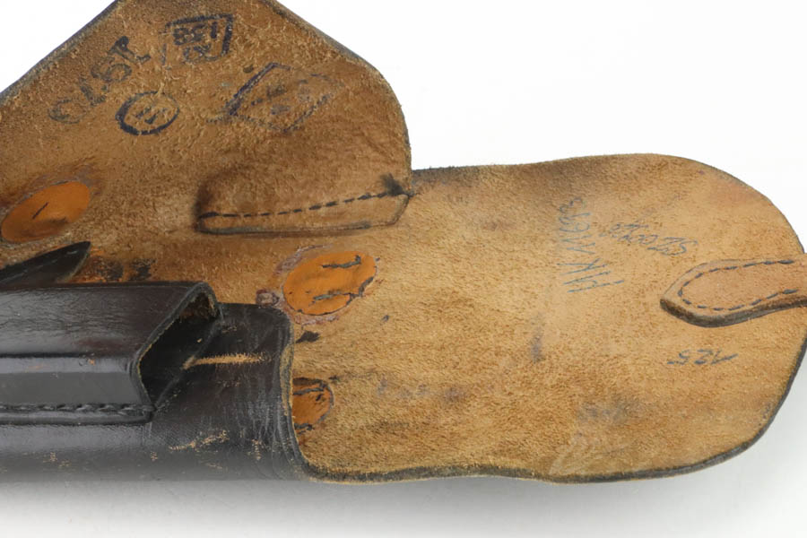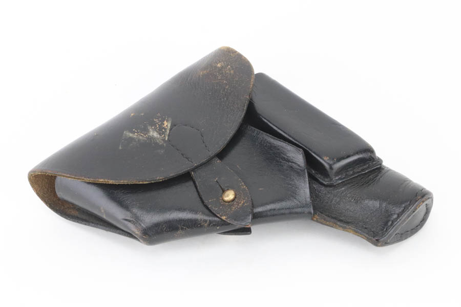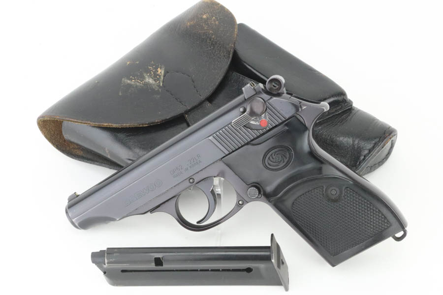 8/21/24 – This is a Daewoo DP52 from 1994-96, a Korean clone of the Walther PP. Chambered in .22 LR. Import mark on the right side of the slide. It comes as a rig with a 1979-dated black leather holster and one magazine. The gun has retained about 98% of its bluing with just hints of high edge and muzzle wear. Fitted with nice DPI-marked black plastic grips. Minty bore.