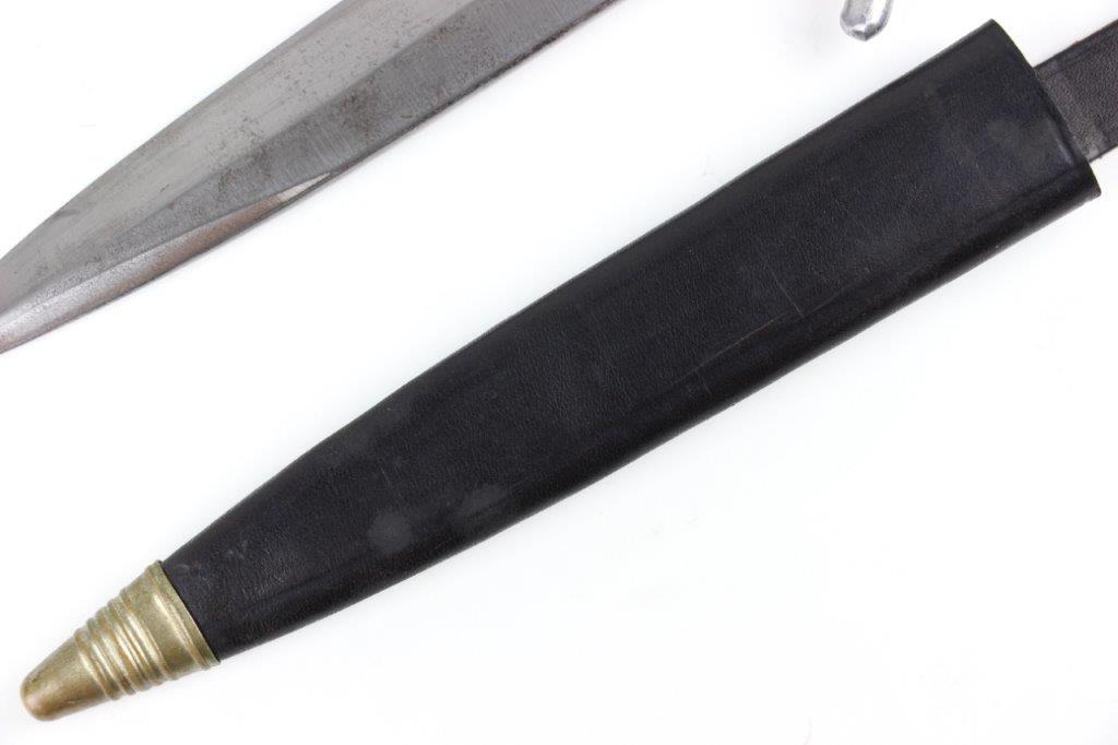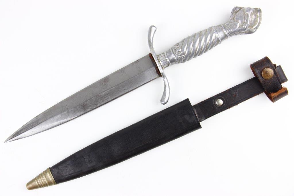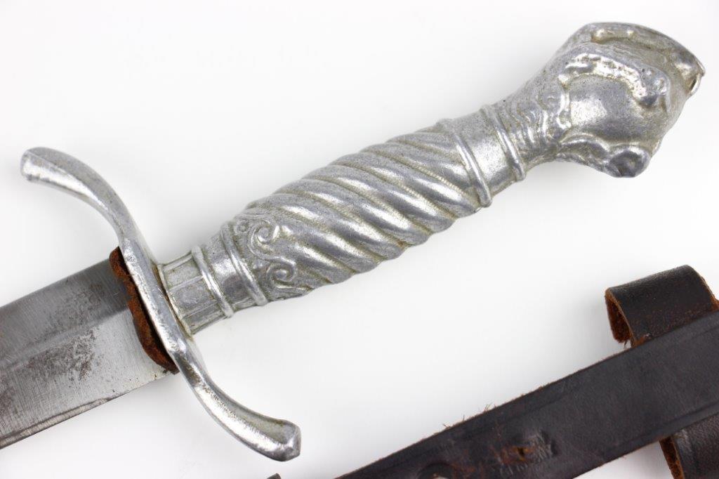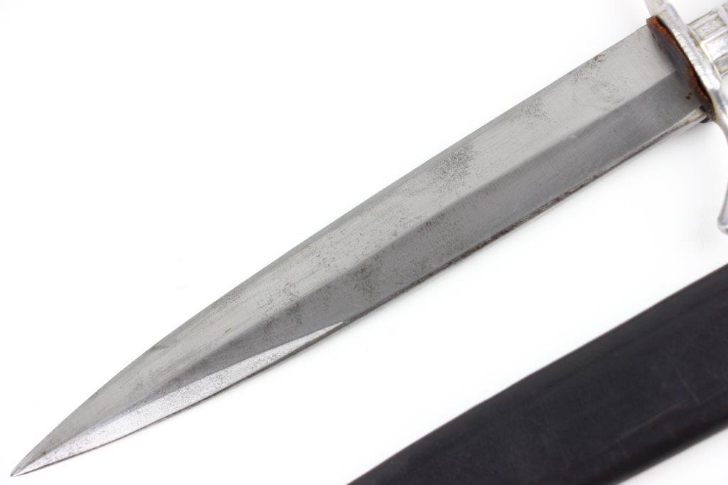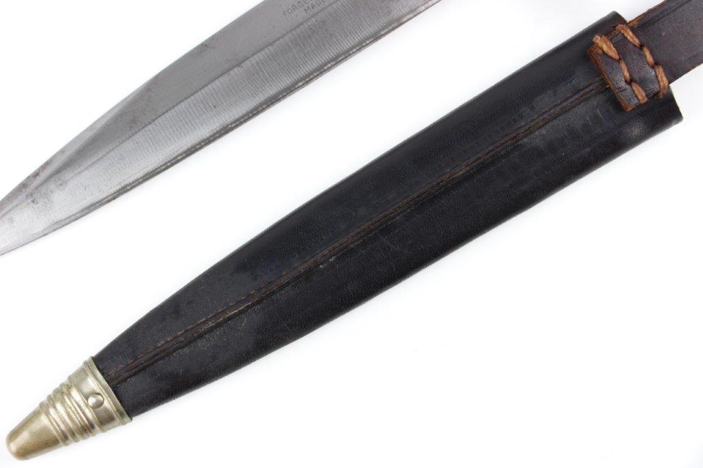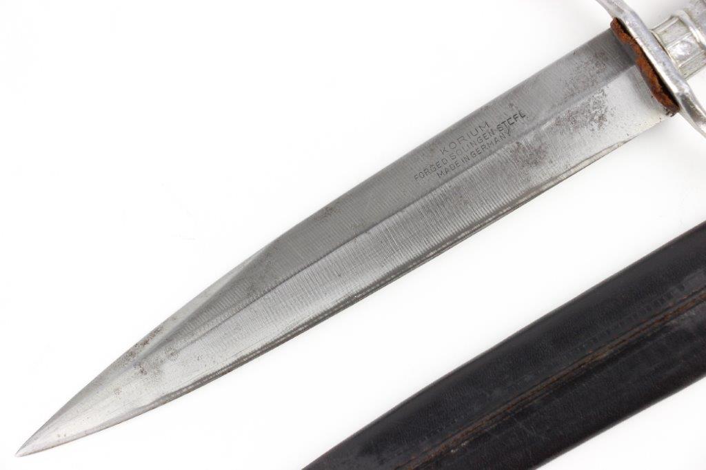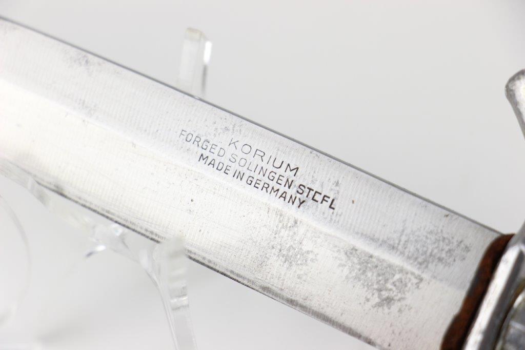 7/15/24 – This is a 1950’s production German Knife by Korium. The knife features an aluminum “claw and ball” style pommel. The handle is in great condition with a visible side seam and natural surface patina. The blade shows light oxidation but is in great overall condition with visible cross-graining and a maker stamp on one side, “Korium Forged Solingen Steel Made in Germany”. Blade measures about 15.5cm long and overall length around 26cm. Leather stopper intact. Comes with an original leather scabbard, which has a leather frog. The retaining clip at the top of the frog is broken, but still present, as shown.
