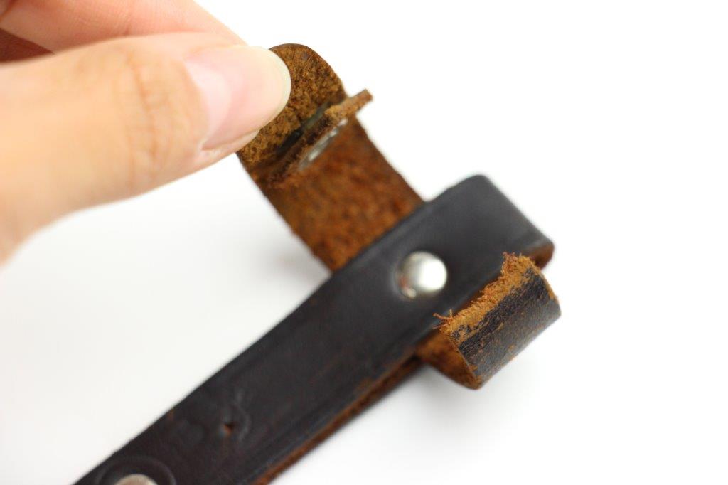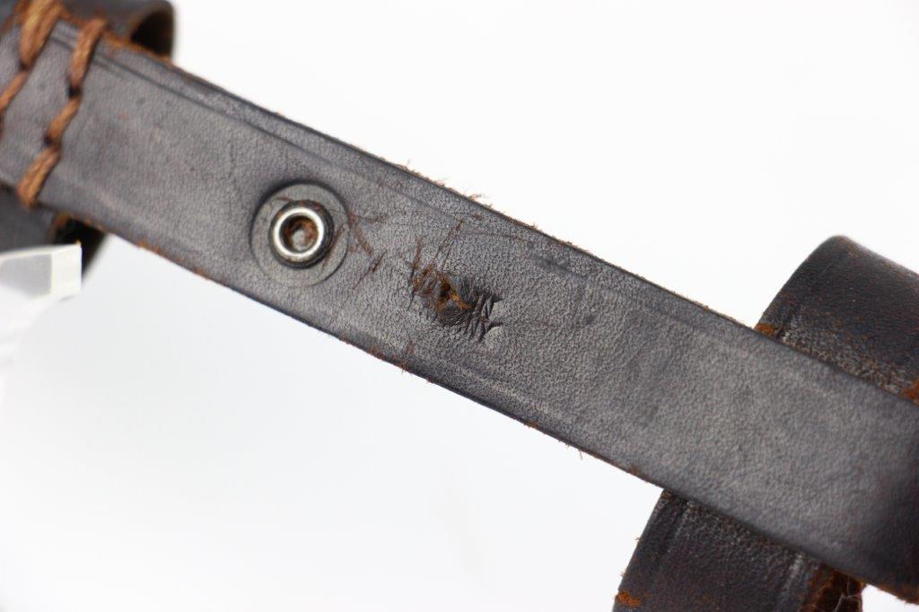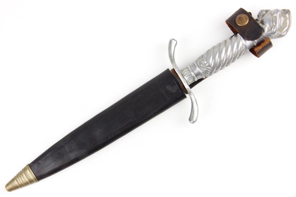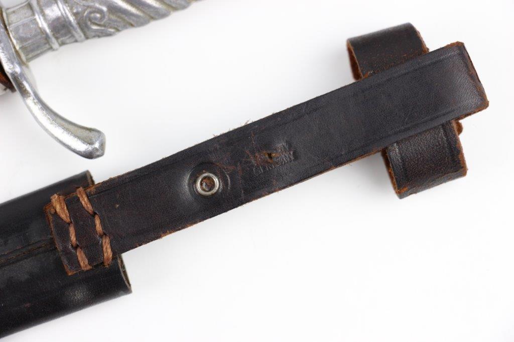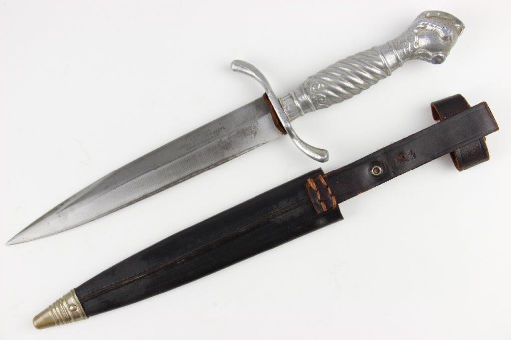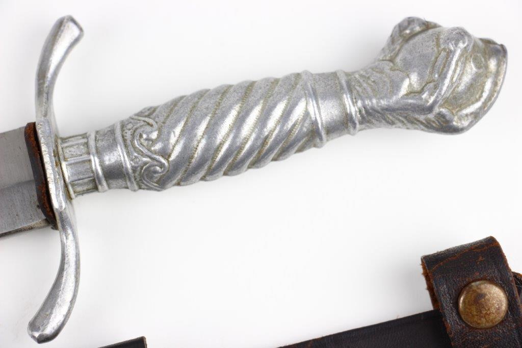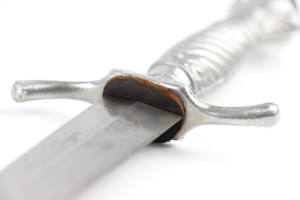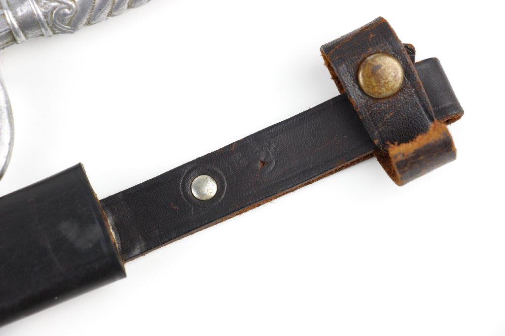 7/15/24 – This is a 1950’s production German Knife by Korium. The knife features an aluminum “claw and ball” style pommel. The handle is in great condition with a visible side seam and natural surface patina. The blade shows light oxidation but is in great overall condition with visible cross-graining and a maker stamp on one side, “Korium Forged Solingen Steel Made in Germany”. Blade measures about 15.5cm long and overall length around 26cm. Leather stopper intact. Comes with an original leather scabbard, which has a leather frog. The retaining clip at the top of the frog is broken, but still present, as shown.