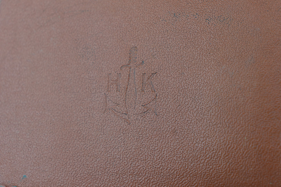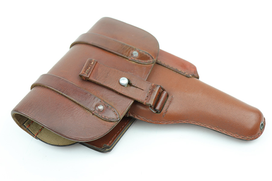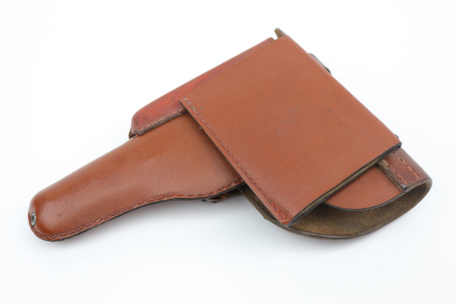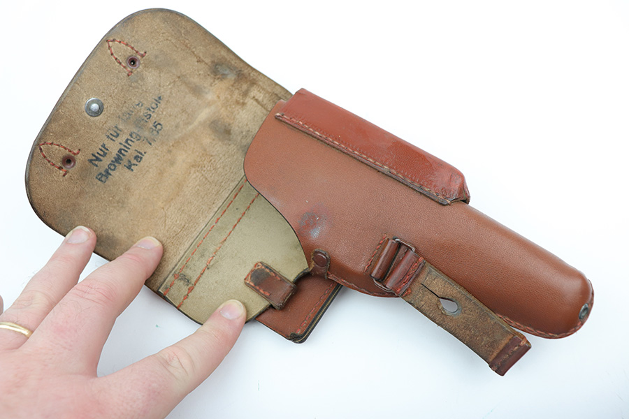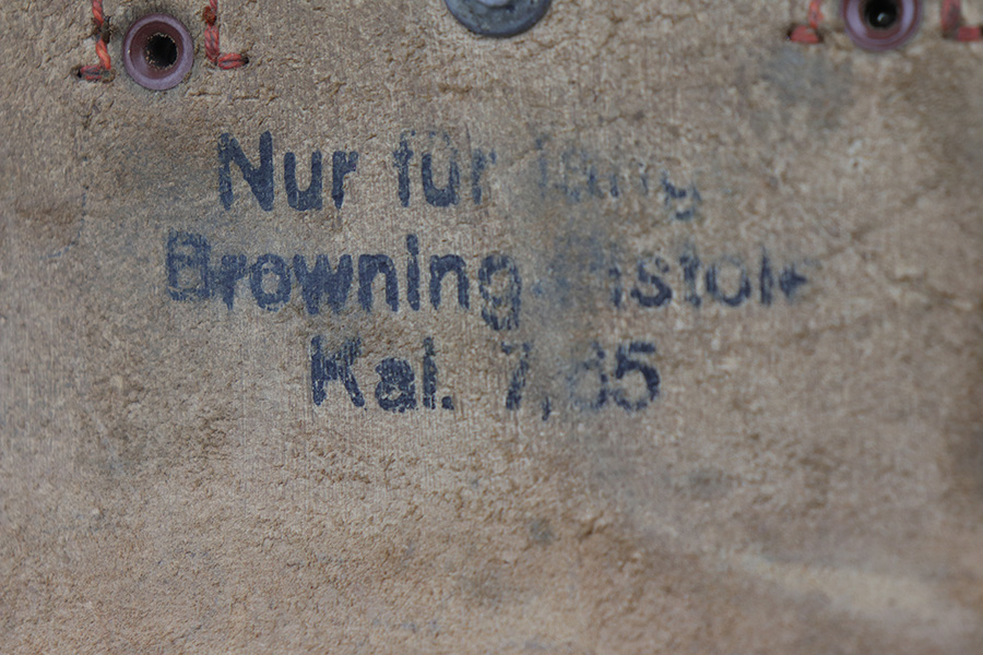 10/11/21 – This is a late WW2 production FN 1922 holster made by Krieghoff for the German Luftwaffe. The holster has an ersatz base and a leather top. The closure strap is also leather. The front of the top flap is Krieghoff proof stamped just above the closure stud. The back belt loop is HK stamped by Krieghoff as well. The interior leather has the original ink stamp which indicates the holster is for a FN 1922 Browning. The stitching and leather / ersatz is excellent throughout.