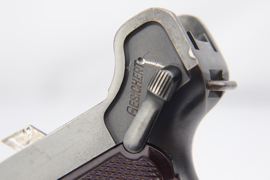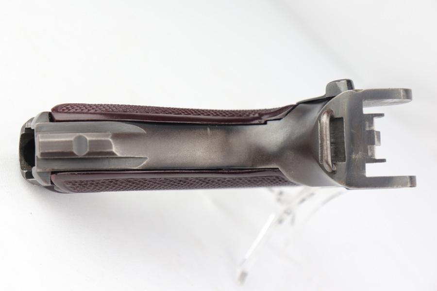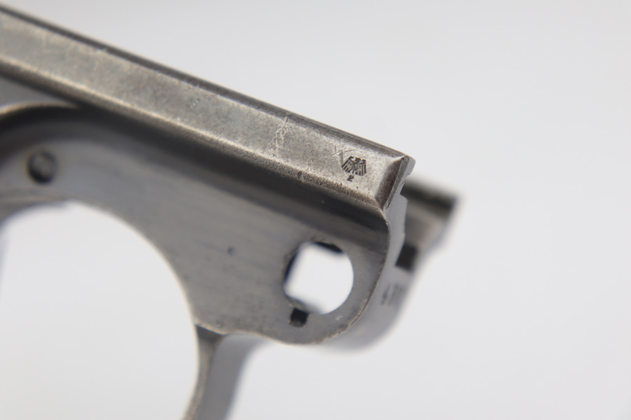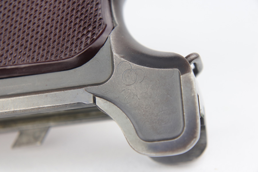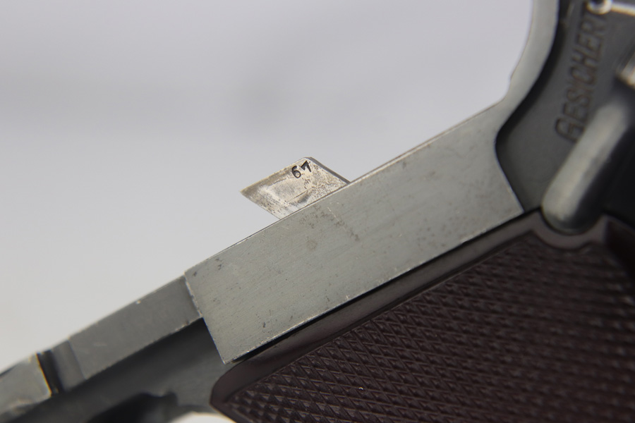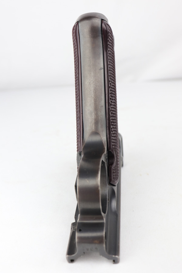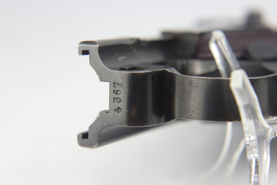 12/19/18 – This is an original Krieghoff Luger frame, complete with everything shown in photos. The serial number is 4367 and matching on the safety bar and on the safety lever. The main spring is also matching. The original finish is mostly intact with some thinning and normal wear on the front and back straps. Overall about 90% original finish is in tact. The grips are reproduction brown made to look like bakelite, and are thrown in as a placeholder. All else is guaranteed original and authentic.