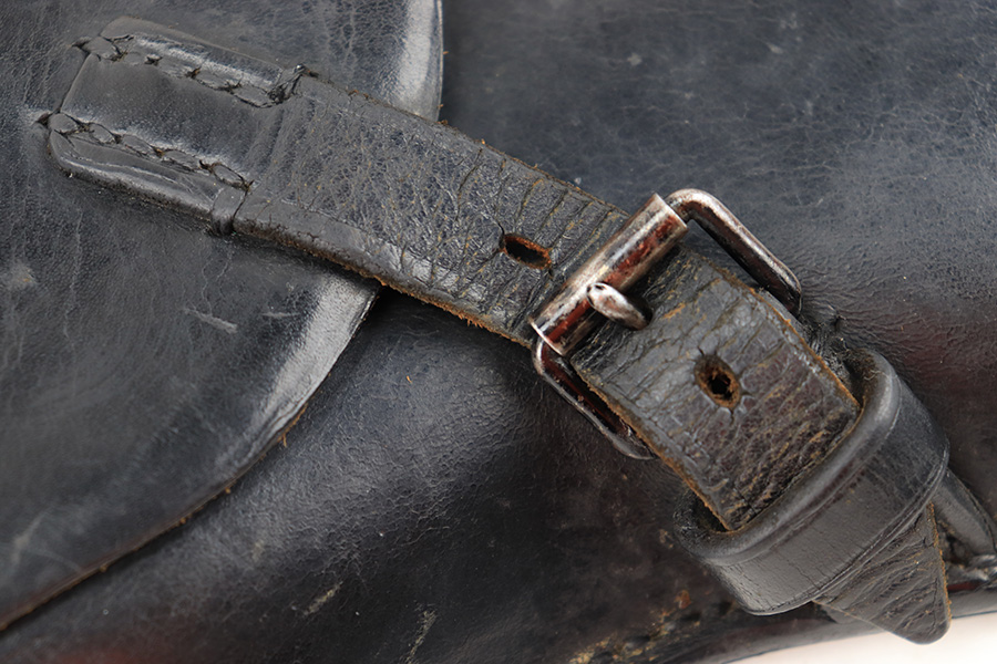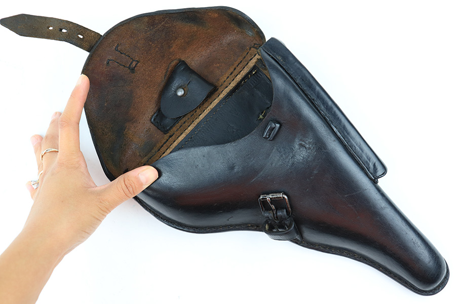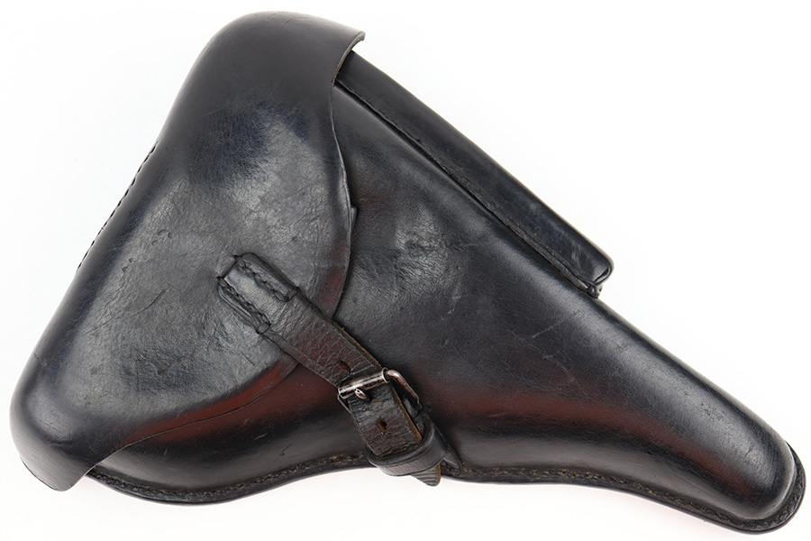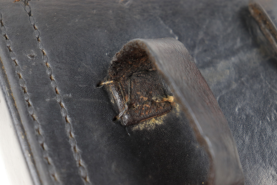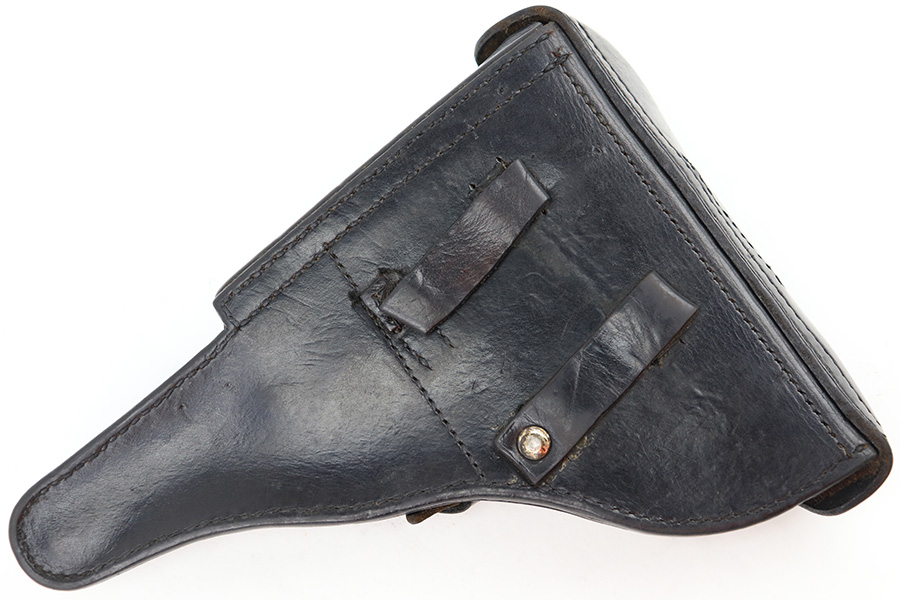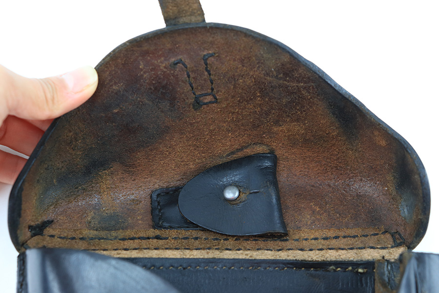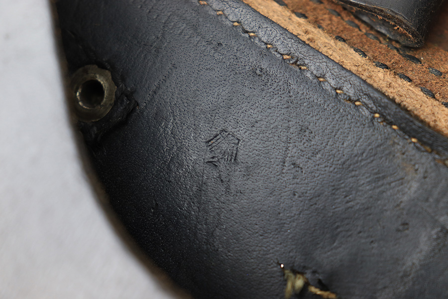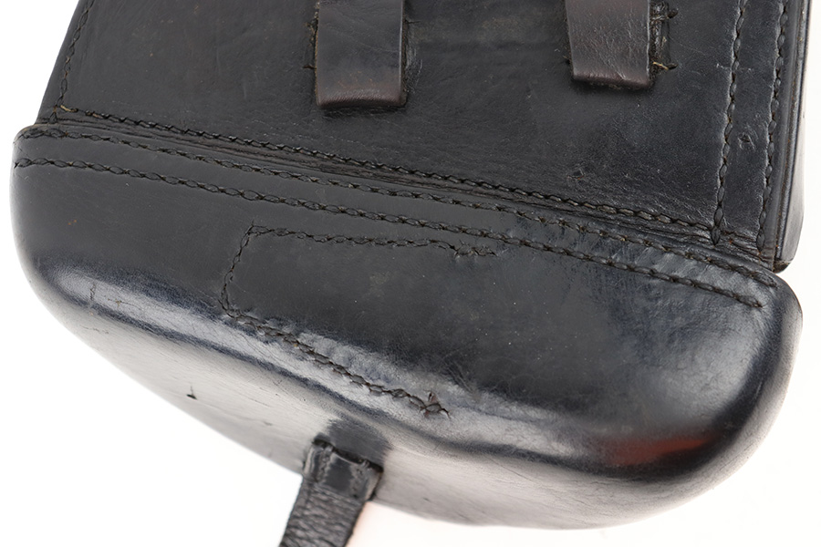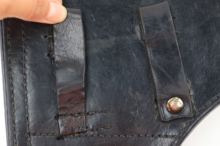 7/25/23 – This is an original, desirable variation Krieghoff Luger holster from WW2. The holster is in great overall condition despite having a riveted replacement back right belt loop. The rest of the holster leather and stitching is original and intact. The leather has normal pliability and signs of previous use. There’s mild wrinkling on the closure strap but no cracks or major flaws. The interior leather is fairly clean and shows a distinct Krieghoff eagle/2 proof stamp. The stitching is all tight and original (except on the belt loop). A very nice example of a rare, highly collectible Luger holster.