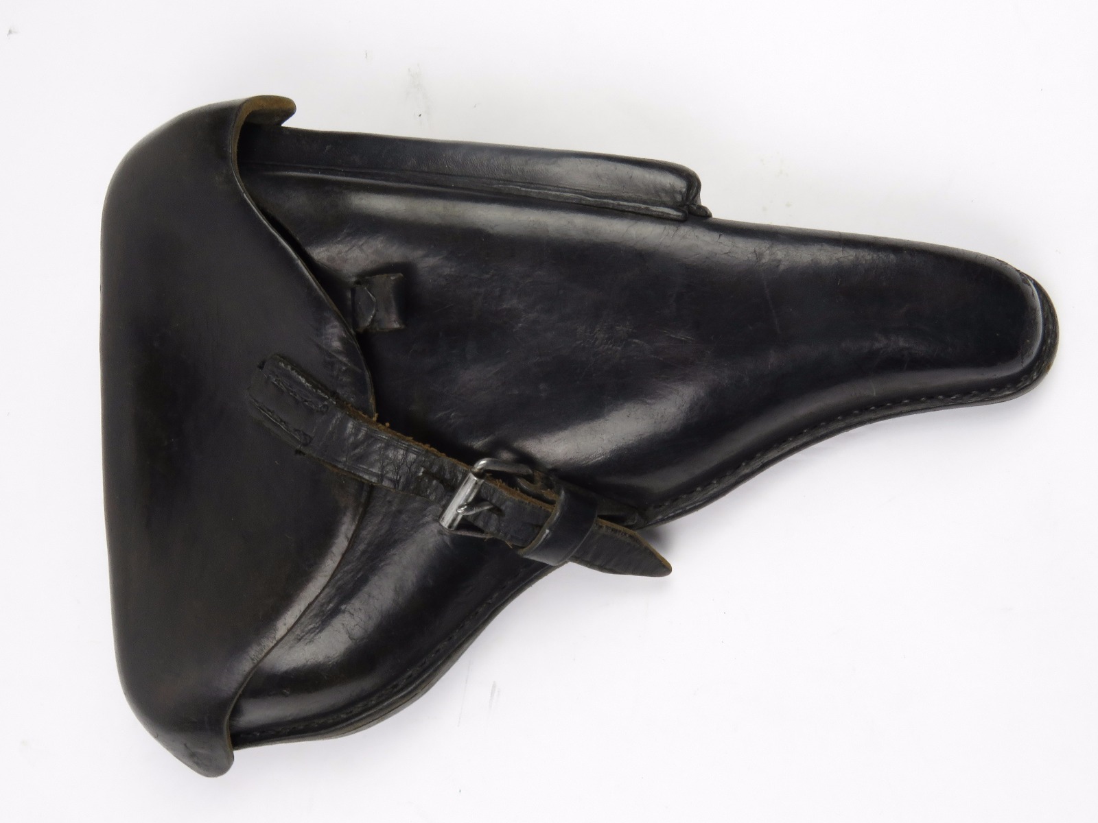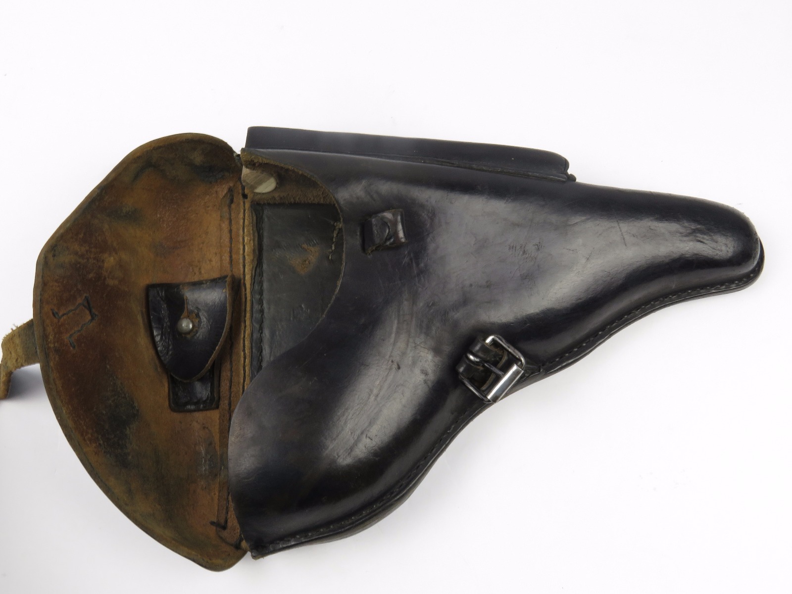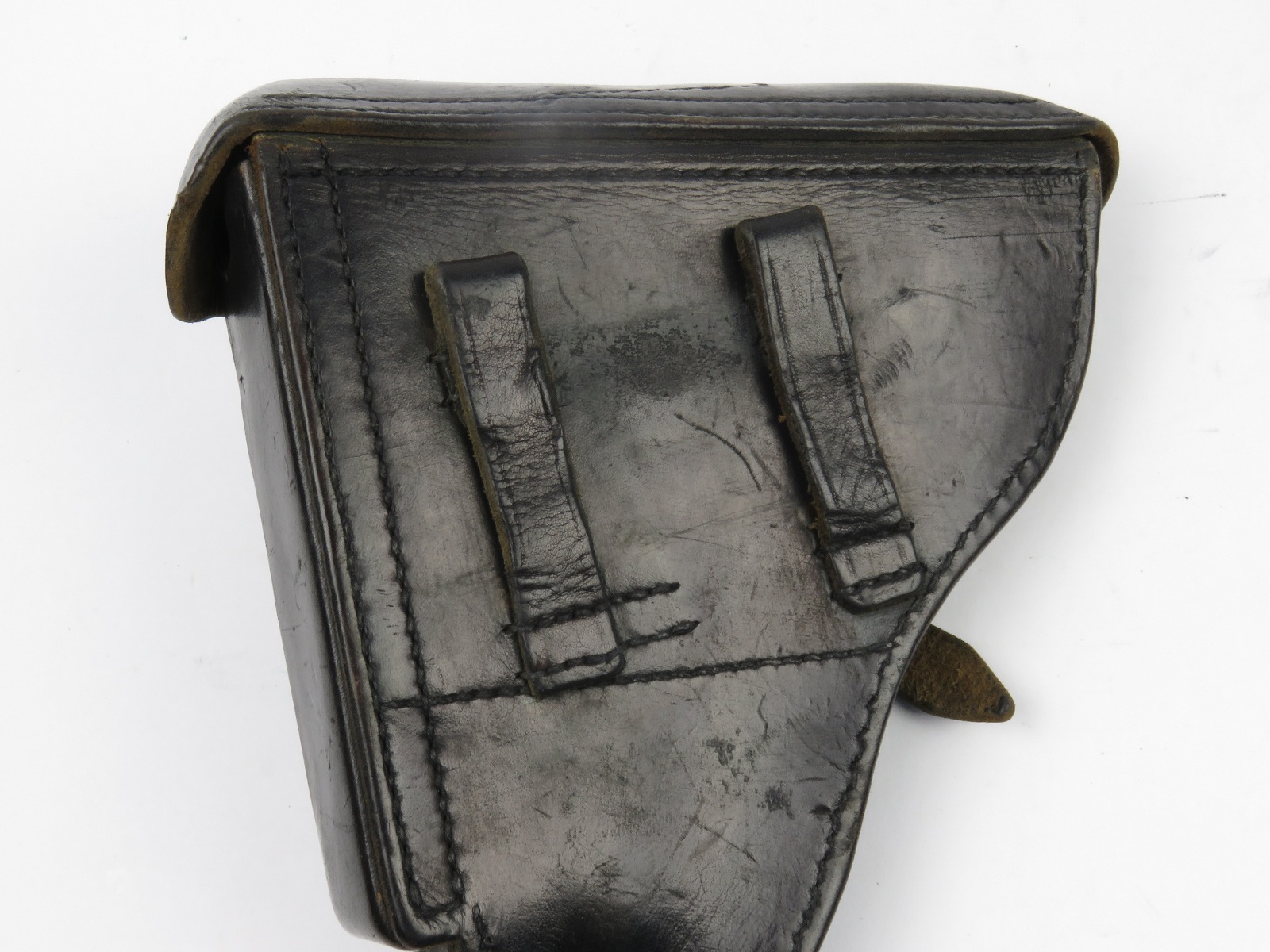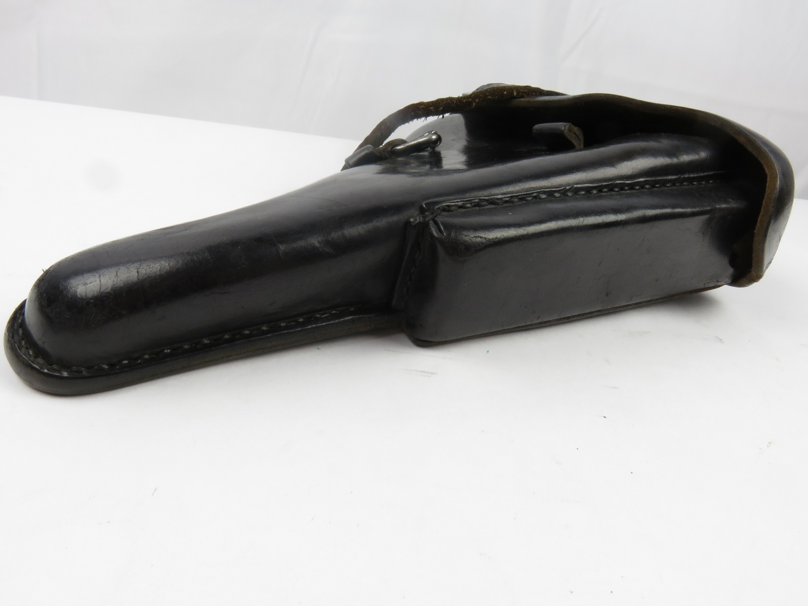 7/25/17 – This is an original, rare variation Krieghoff Luger holster. These black leather holsters are increasingly hard to find, and were known as the “premier” manufacturer of Lugers and accessories at the time. This holster is in great condition, with all original leather and stitching in tact. The leather has nice shape and a shined original finish. No signs of polishing or tampering on the leather or stitching. The interior body of the holster has a small eagle/2 Krieghoff proof stamp. There are no other markings. The stitching is black, and all correct. There is some minor residue on the backside of the holster, but otherwise there is no notable wear or issues. The interior leather is fairly clean. Guaranteed original.