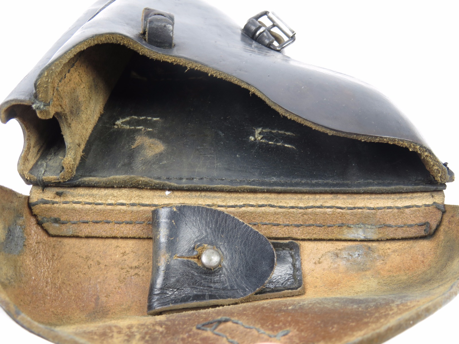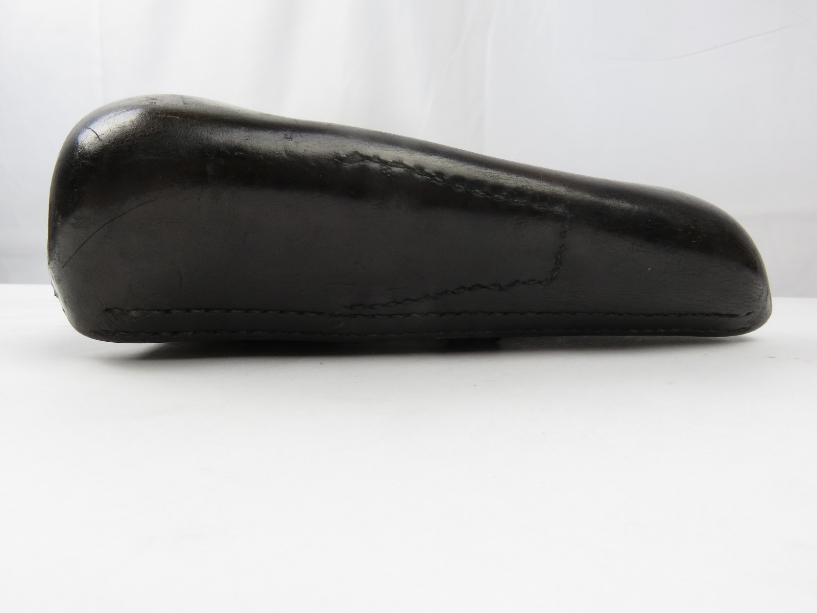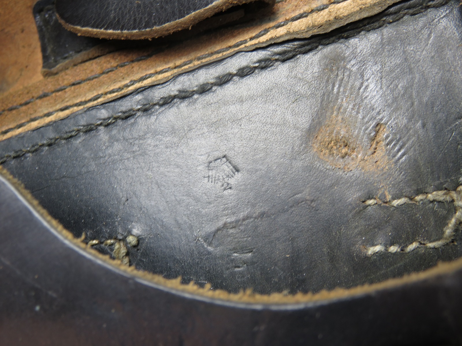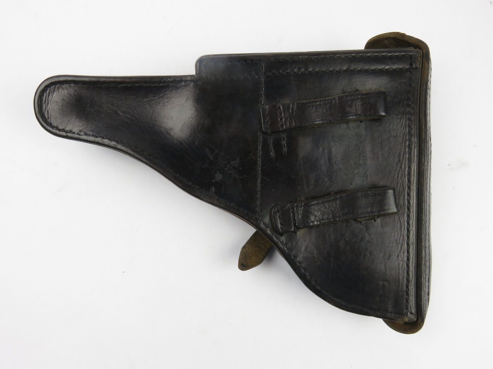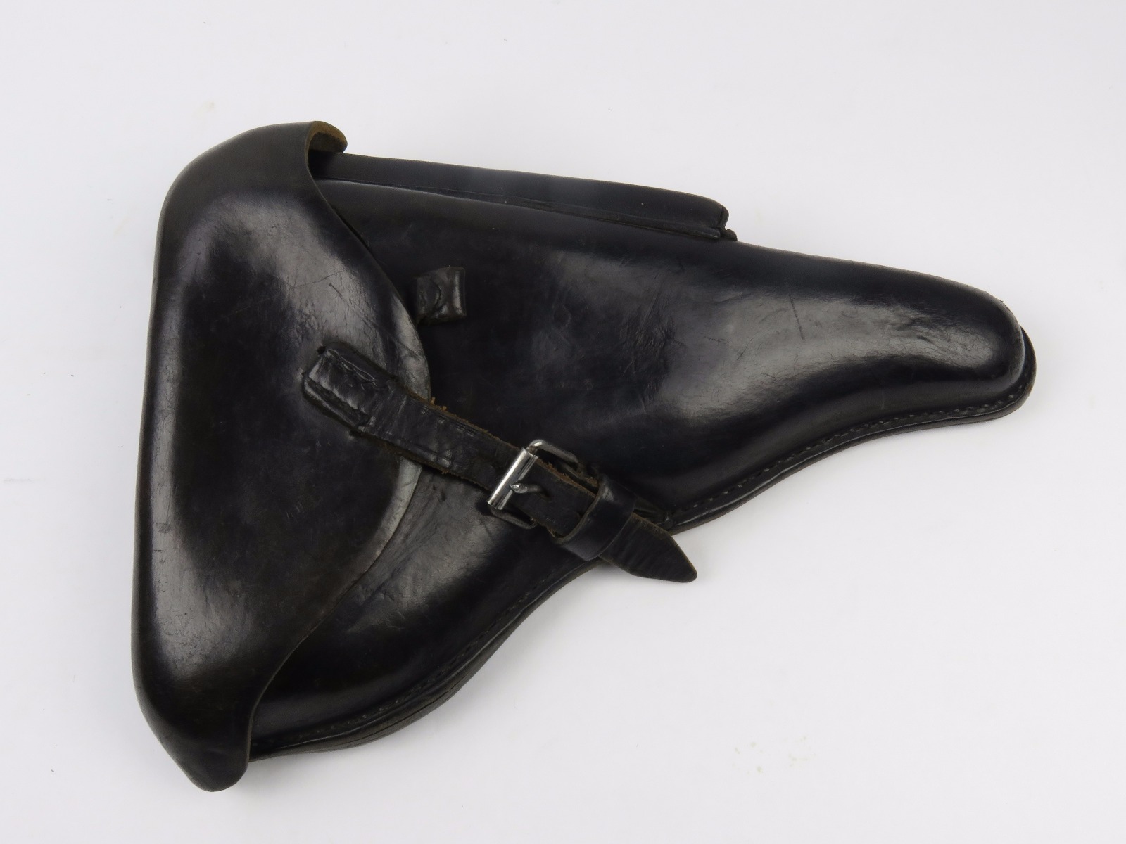 7/25/17 – This is an original, rare variation Krieghoff Luger holster. These black leather holsters are increasingly hard to find, and were known as the “premier” manufacturer of Lugers and accessories at the time. This holster is in great condition, with all original leather and stitching in tact. The leather has nice shape and a shined original finish. No signs of polishing or tampering on the leather or stitching. The interior body of the holster has a small eagle/2 Krieghoff proof stamp. There are no other markings. The stitching is black, and all correct. There is some minor residue on the backside of the holster, but otherwise there is no notable wear or issues. The interior leather is fairly clean. Guaranteed original.