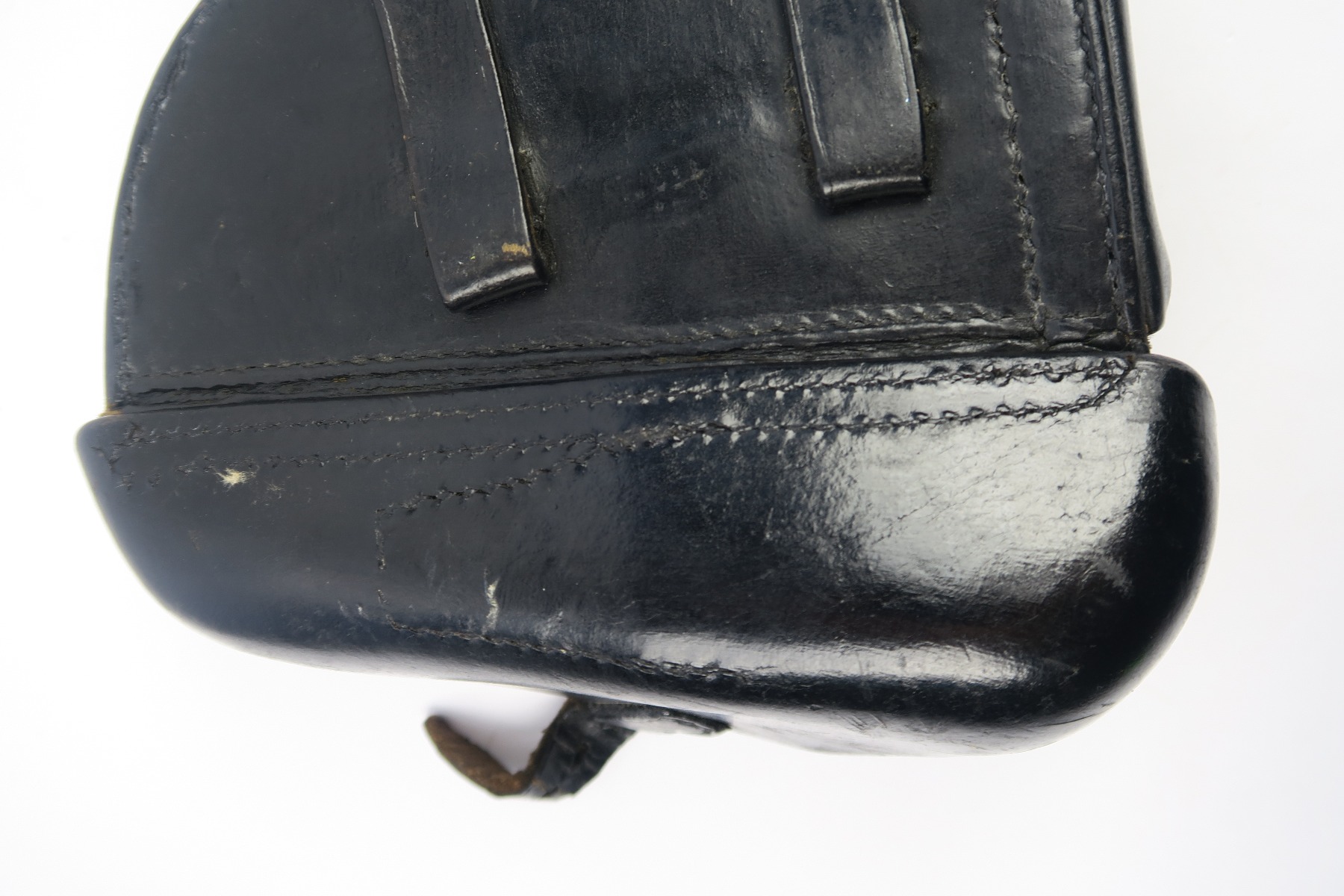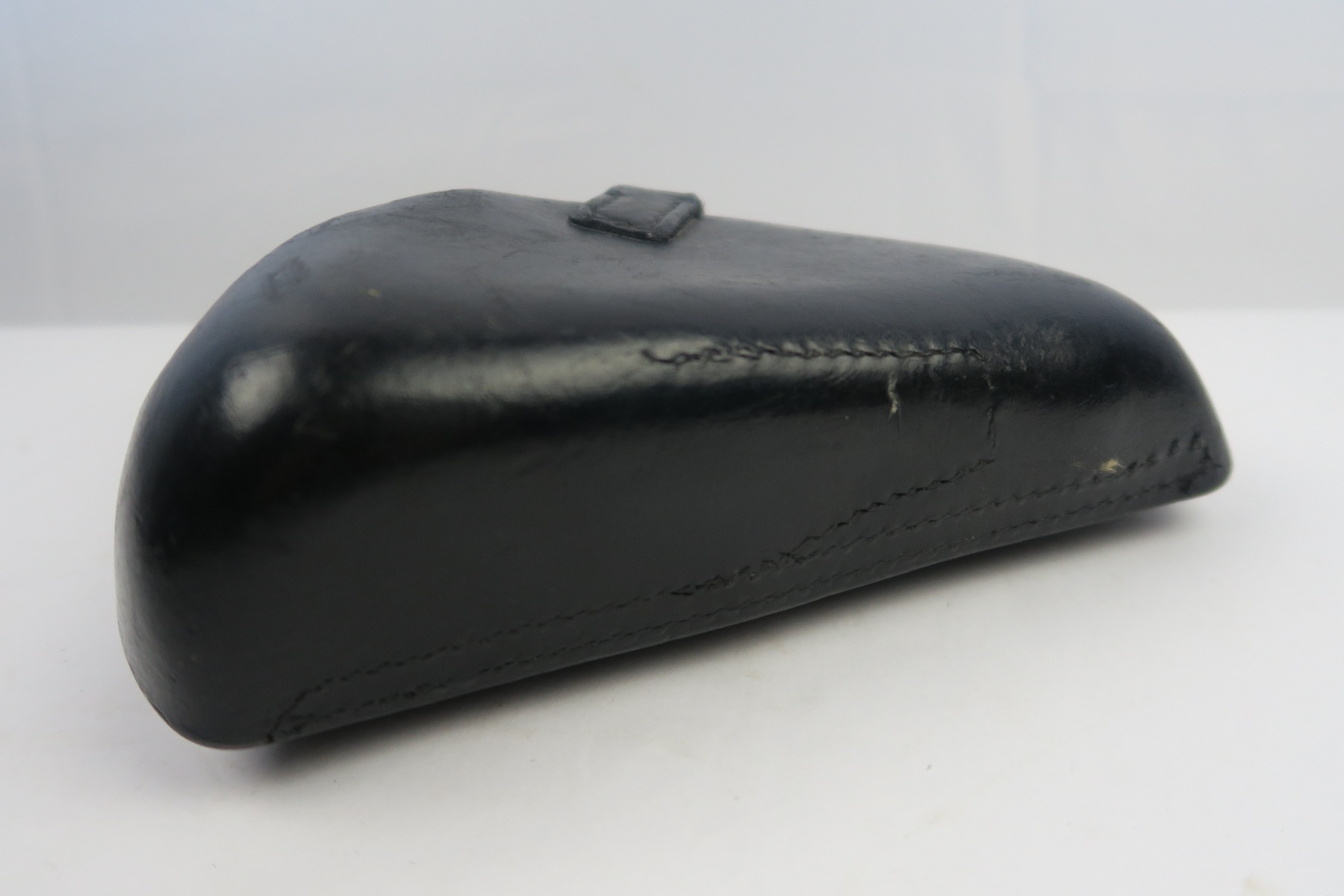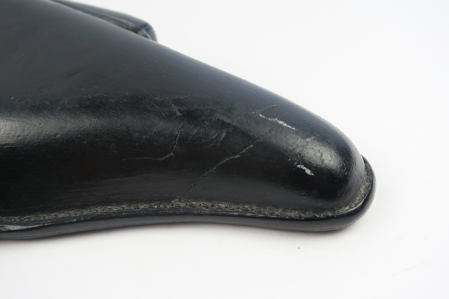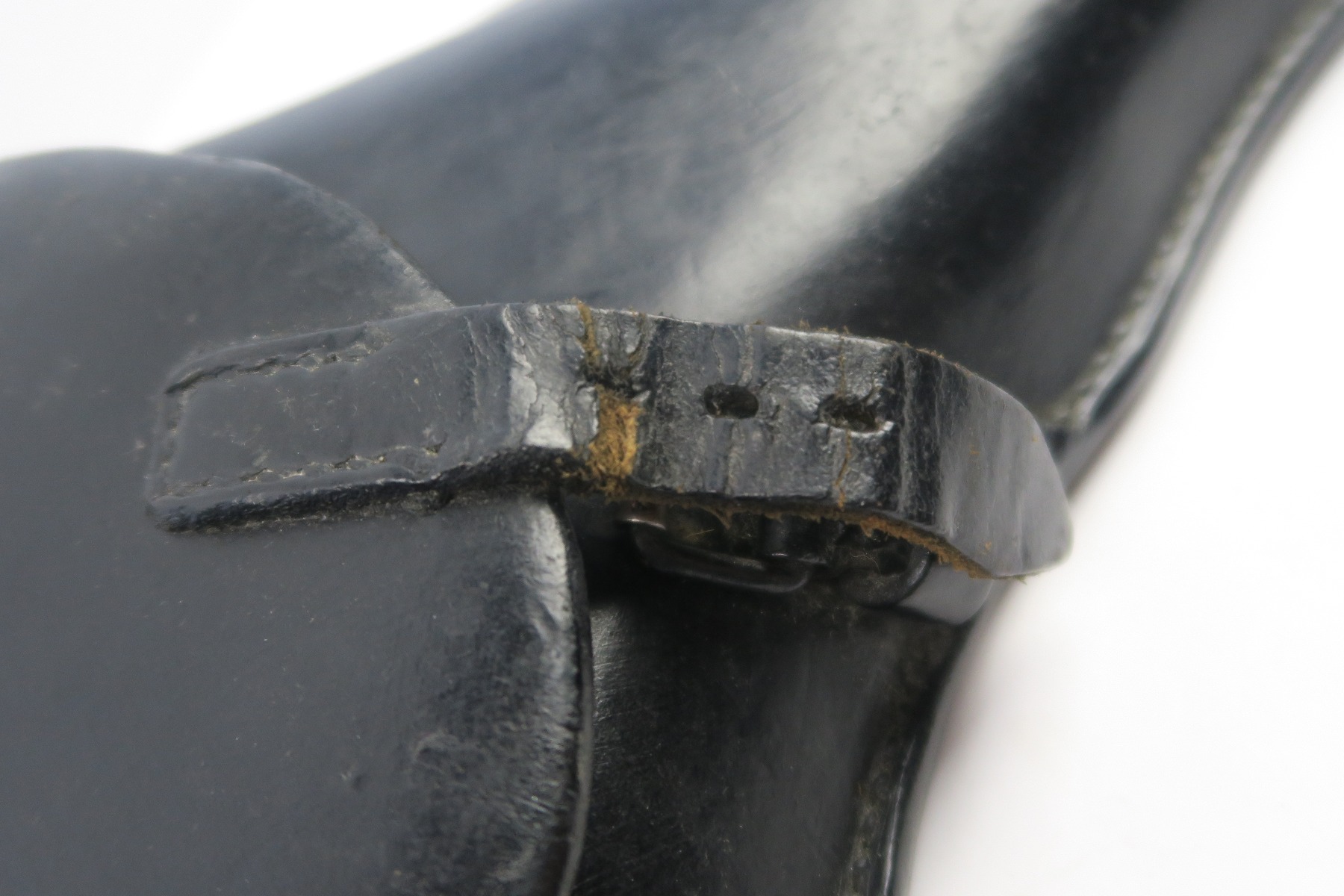 12/28/17 – This is an original WW2 production Krieghoff Luger holster. The holster has strong black leather and black stitching. The stitching looks original and passes a black light test, but it’s hard to tell due to the black color. The interior leather has a light Krieghoff eagle/2 stamp (notice it’s a light factory double stamp!). The closure strap has some surface cracking, but no major issues. The front toe of the holster has a light surface scratch as well. Overall the holster is strong and guaranteed all original!