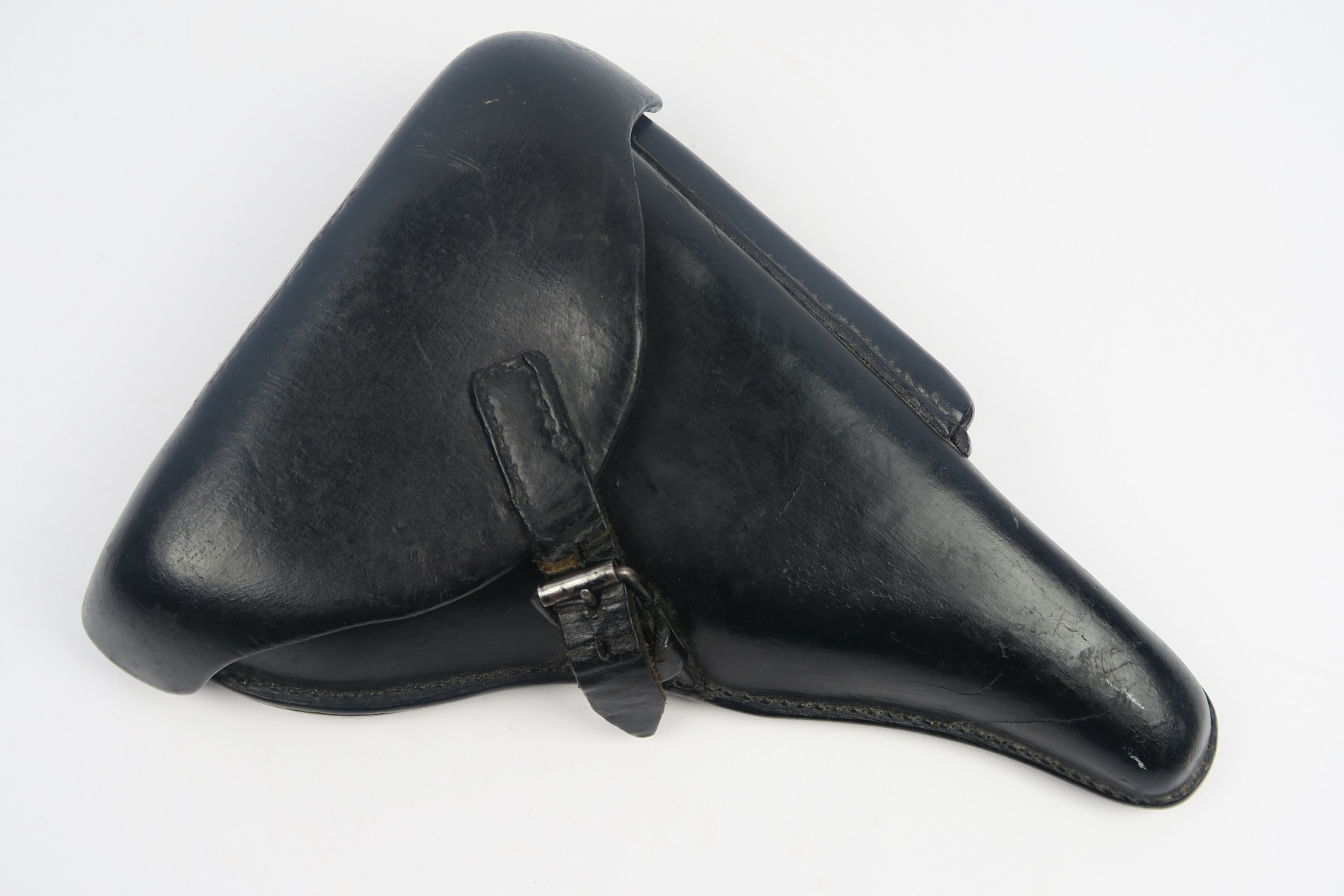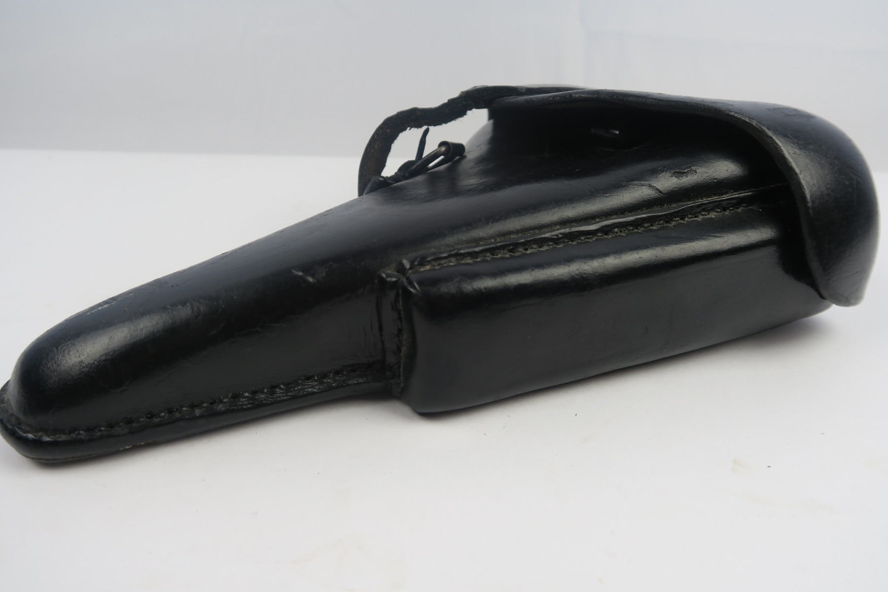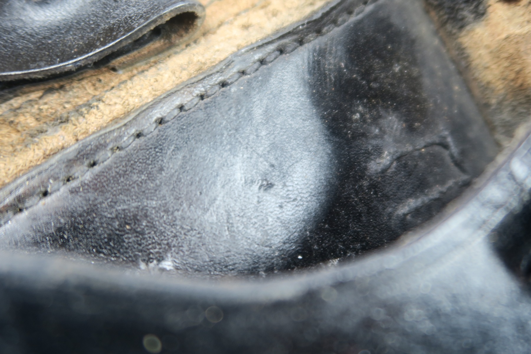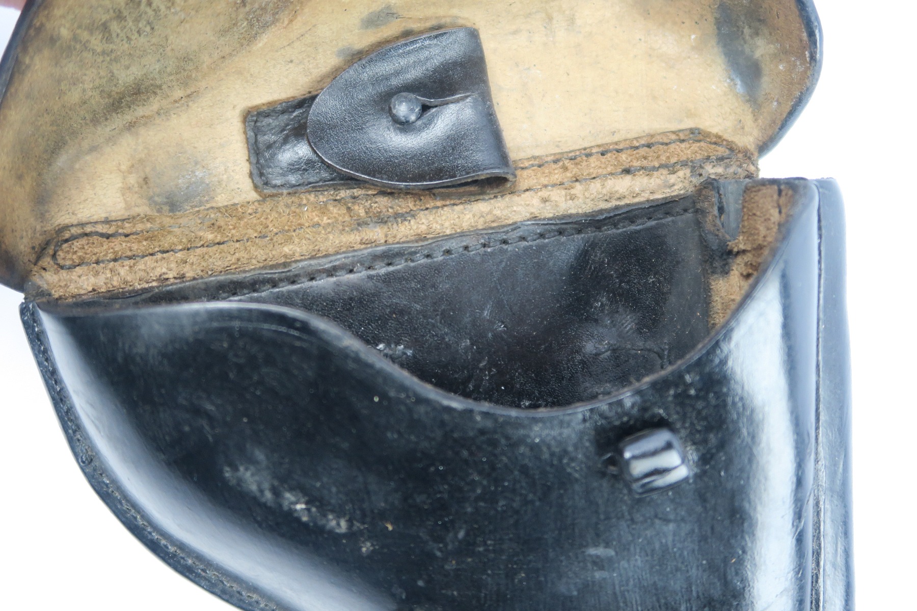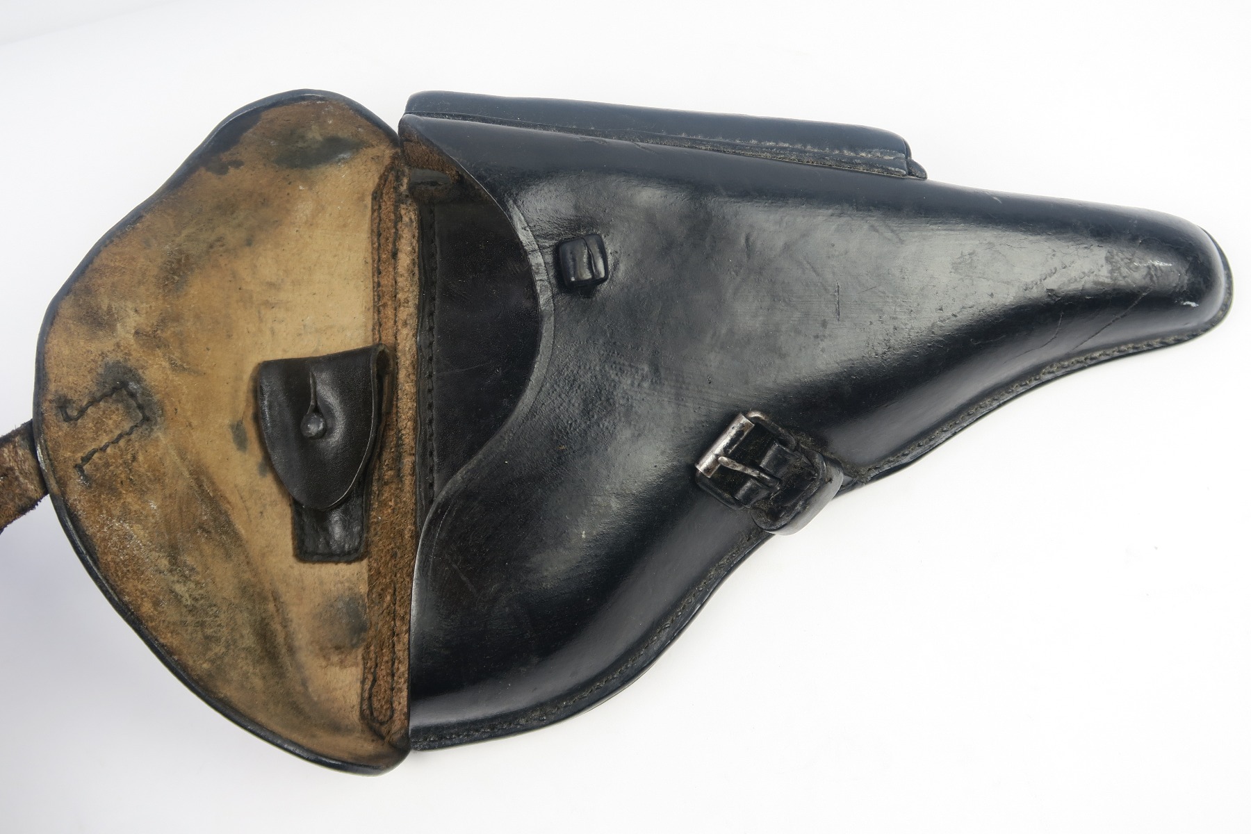 12/28/17 – This is an original WW2 production Krieghoff Luger holster. The holster has strong black leather and black stitching. The stitching looks original and passes a black light test, but it’s hard to tell due to the black color. The interior leather has a light Krieghoff eagle/2 stamp (notice it’s a light factory double stamp!). The closure strap has some surface cracking, but no major issues. The front toe of the holster has a light surface scratch as well. Overall the holster is strong and guaranteed all original!