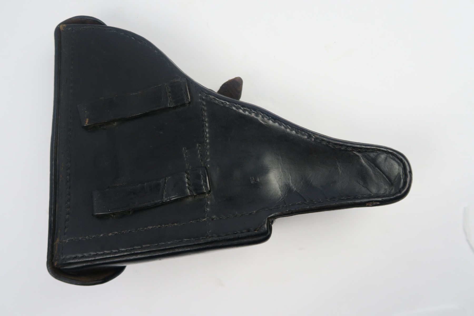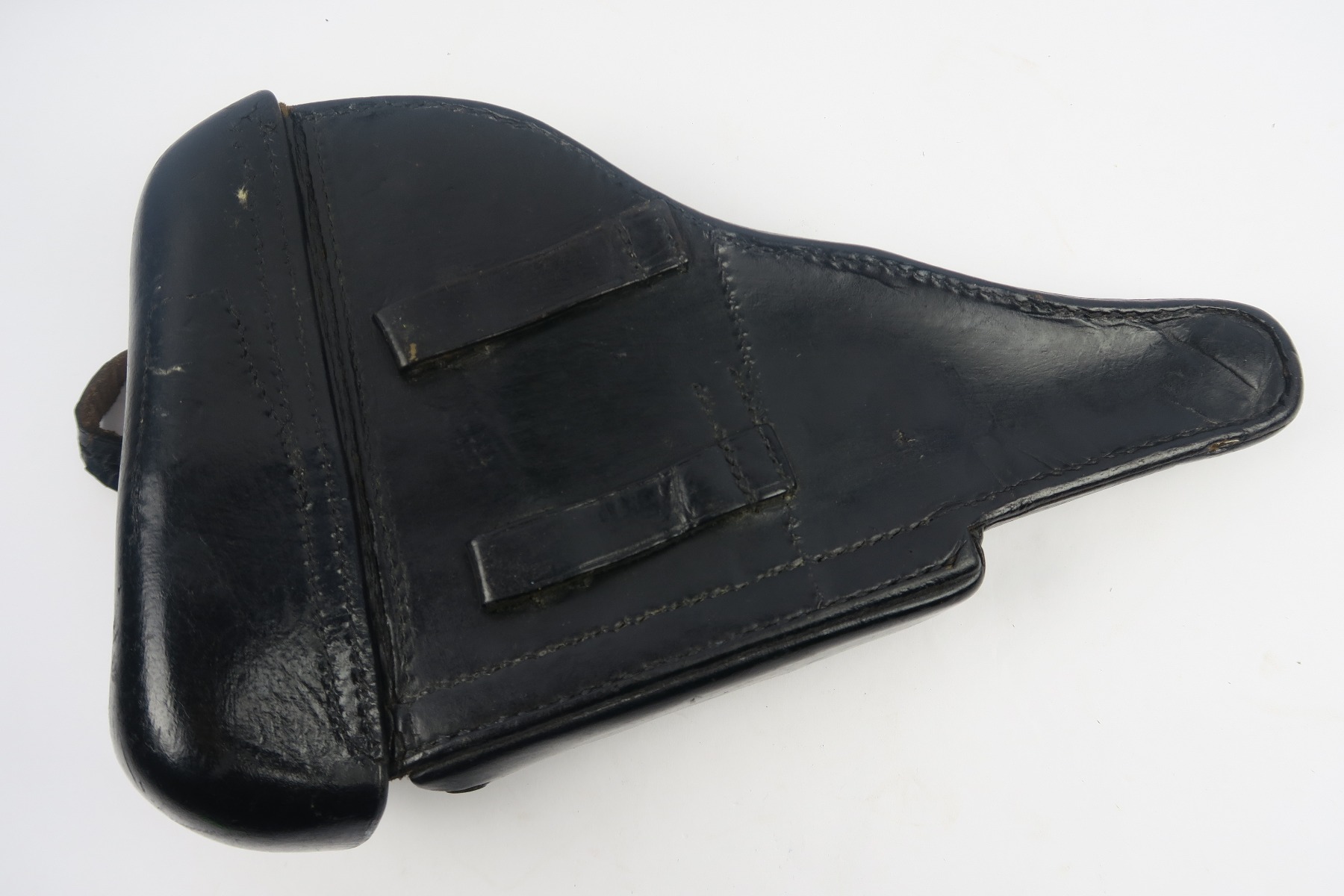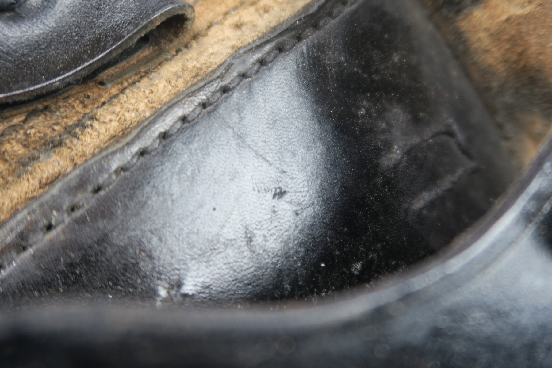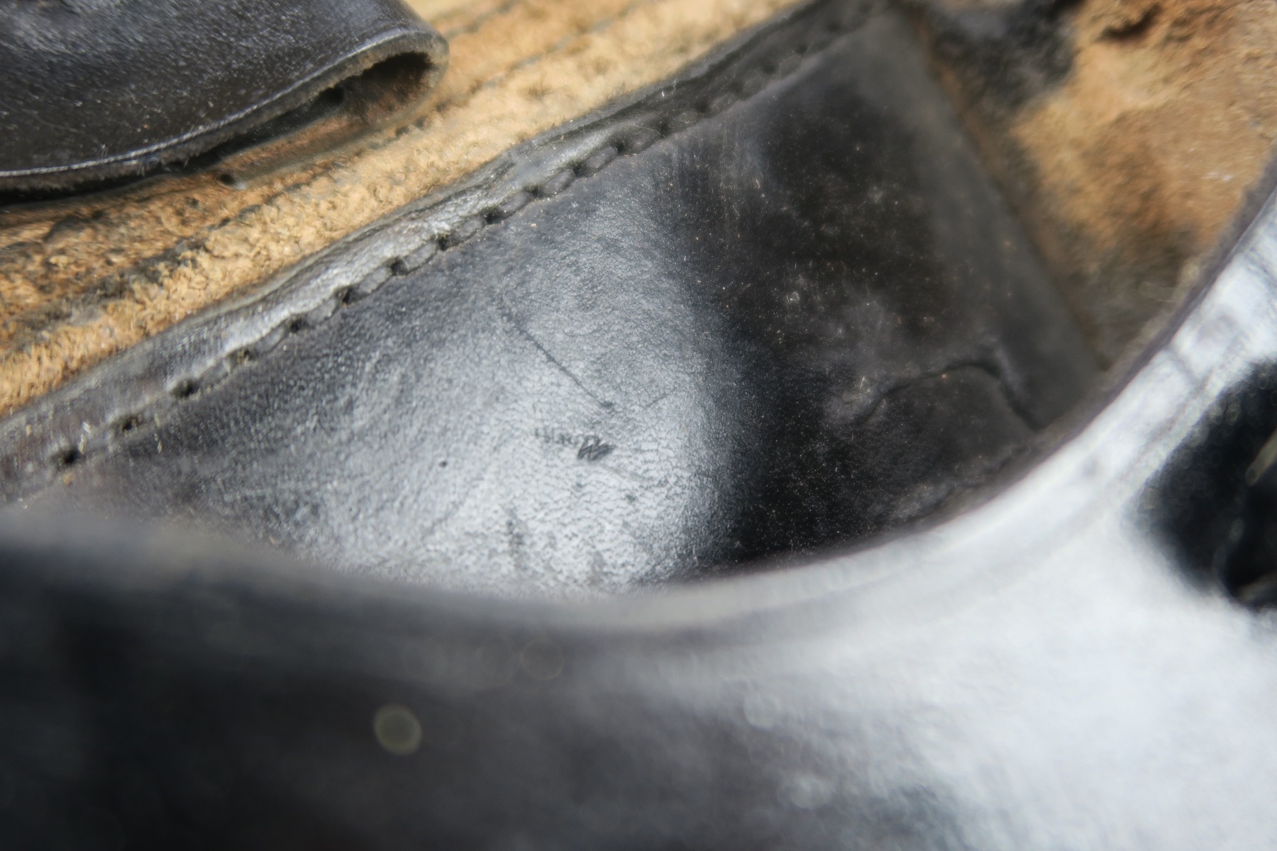12/28/17 – This is an original WW2 production Krieghoff Luger holster. The holster has strong black leather and black stitching. The stitching looks original and passes a black light test, but it’s hard to tell due to the black color. The interior leather has a light Krieghoff eagle/2 stamp (notice it’s a light factory double stamp!). The closure strap has some surface cracking, but no major issues. The front toe of the holster has a light surface scratch as well. Overall the holster is strong and guaranteed all original!