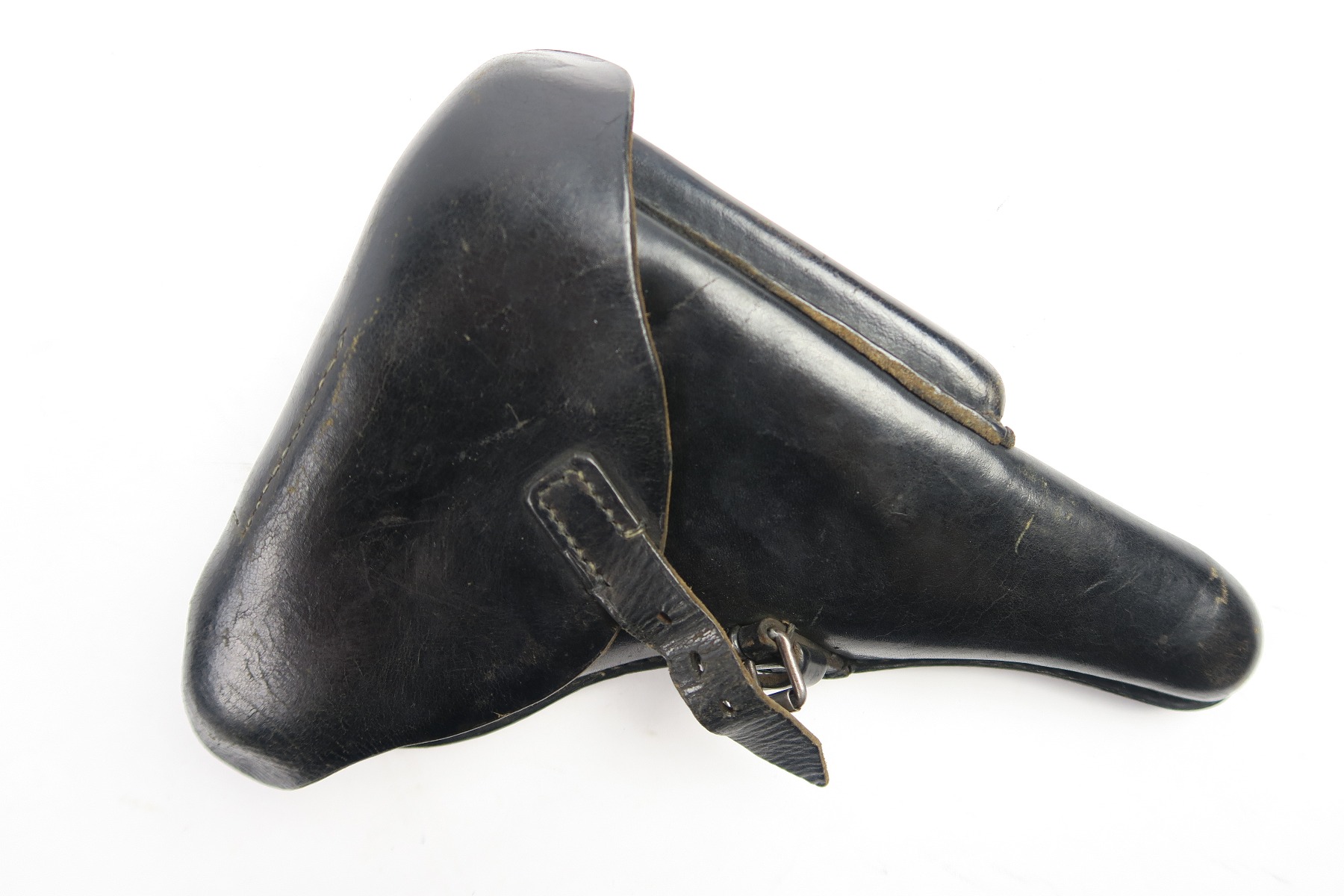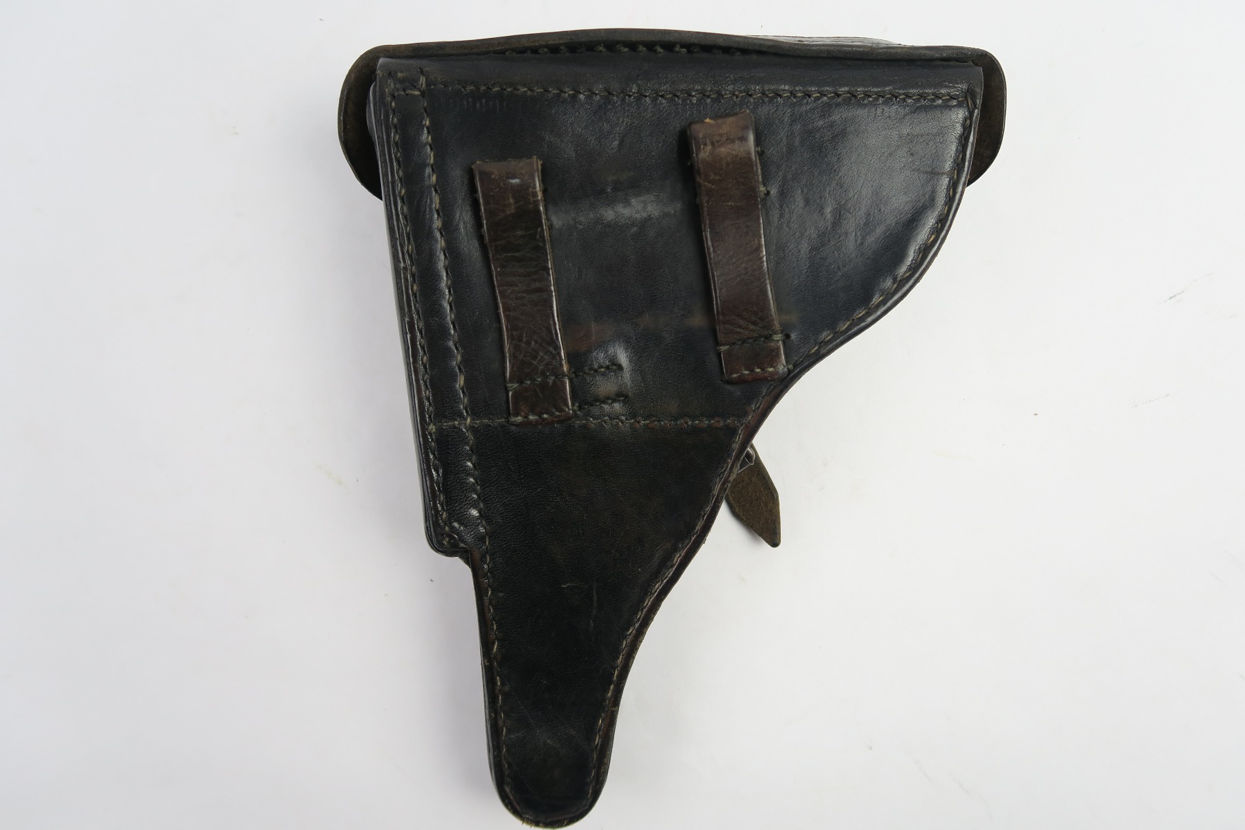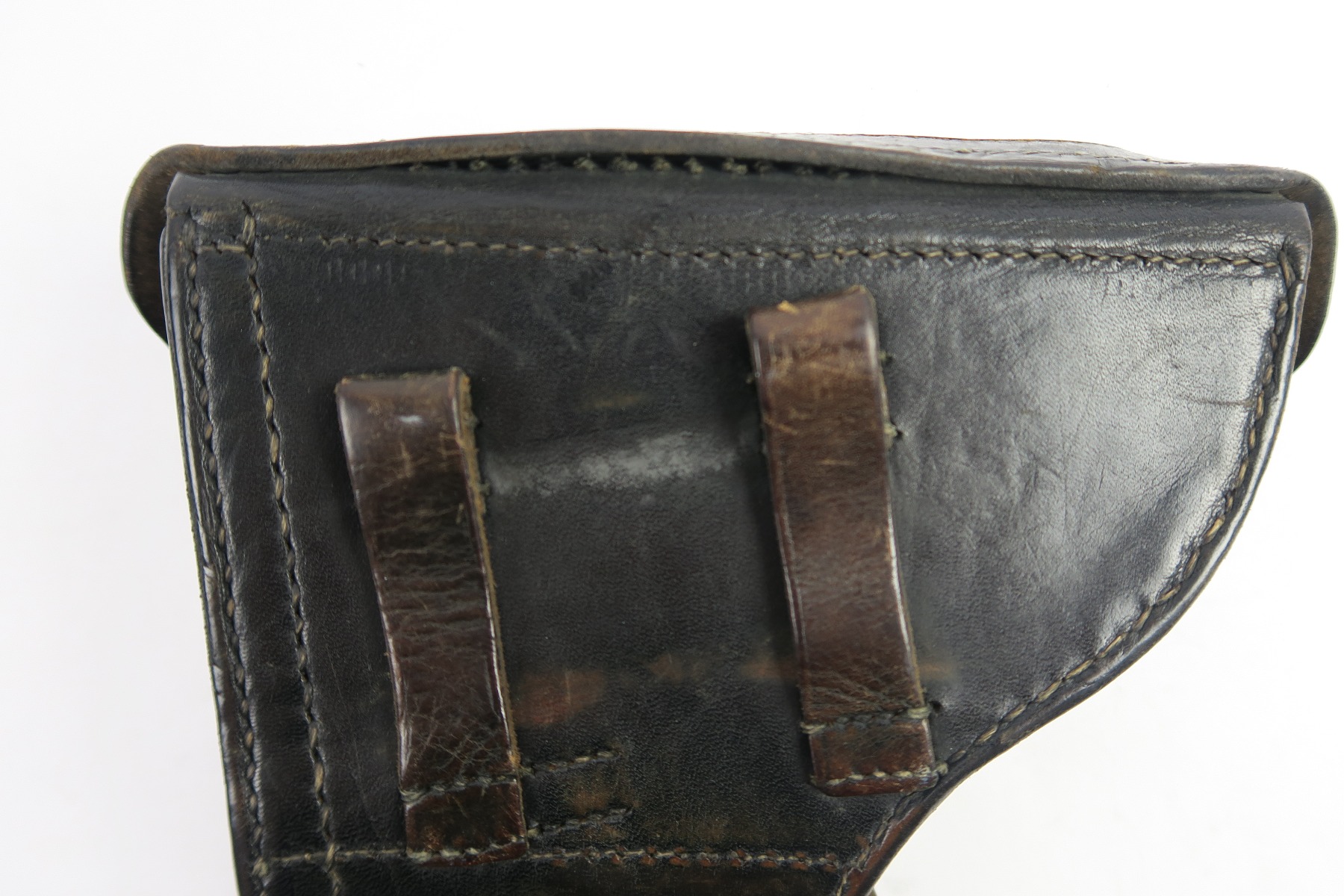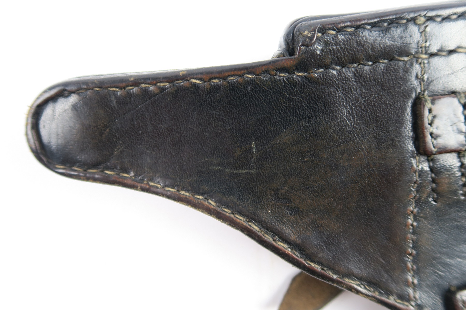 4/30/18 – This is an original WW2 production Krieghoff Luger holster. This rare holster is all original and authentic with a Krieghoff eagle/2 stamp on the interior body of leather. There are no other stamps on the holster. The holster leather is completely in tact, with soft and pliable leather. The stitching is all original but there are so missing/detached stitches on the lid. The lid is still fully attached to the body, and overall this piece is in good condition. Priced to sell!