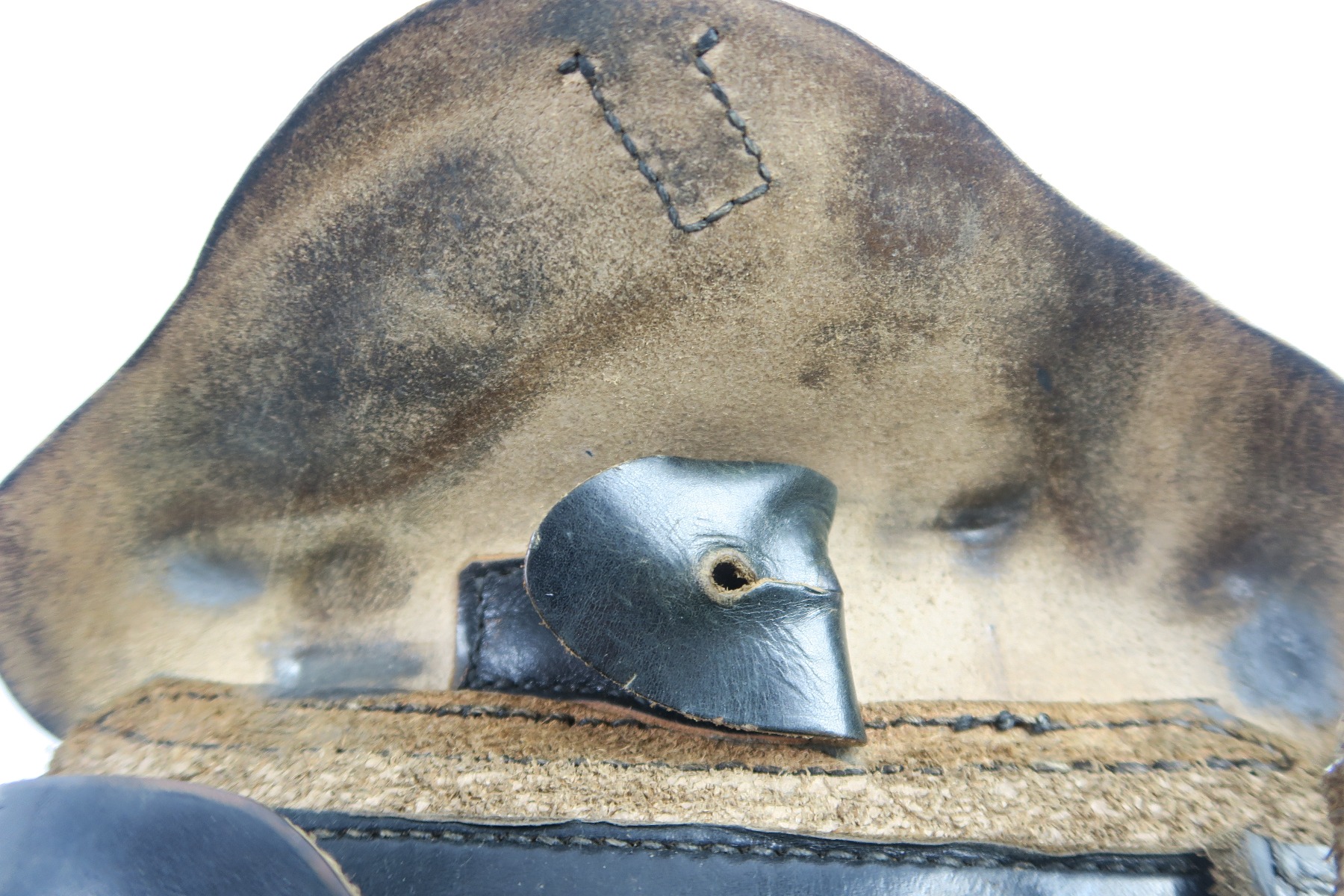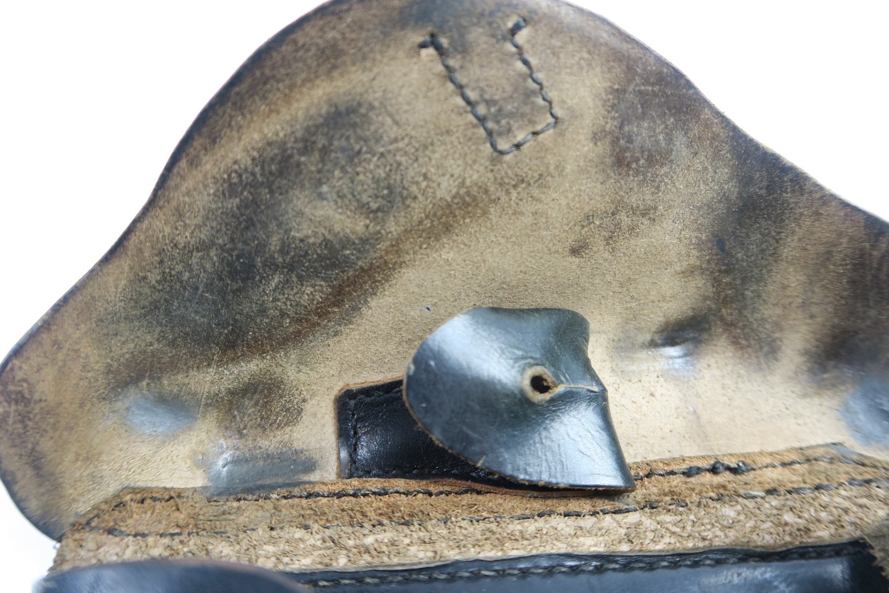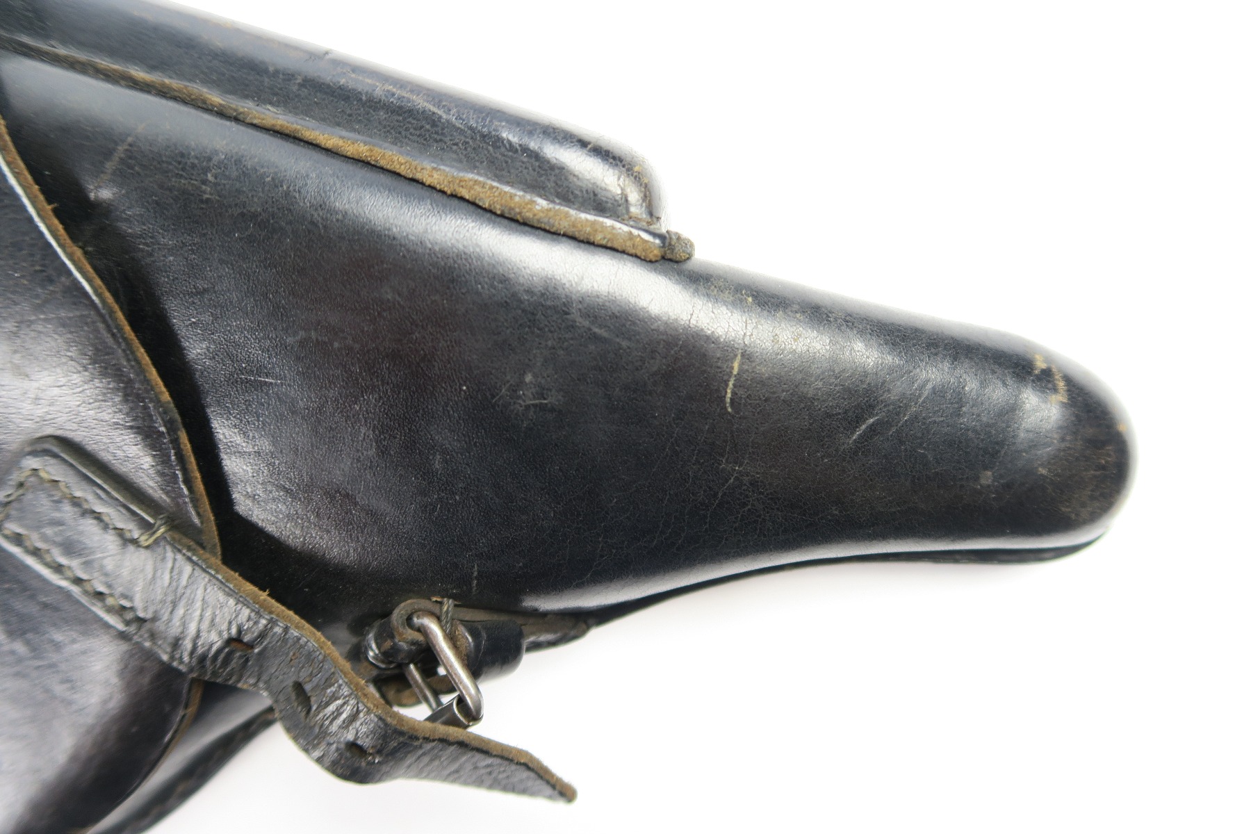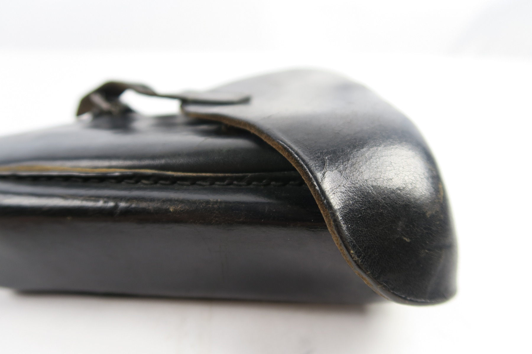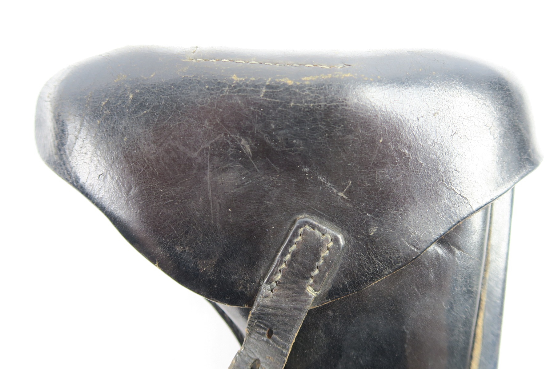 4/30/18 – This is an original WW2 production Krieghoff Luger holster. This rare holster is all original and authentic with a Krieghoff eagle/2 stamp on the interior body of leather. There are no other stamps on the holster. The holster leather is completely in tact, with soft and pliable leather. The stitching is all original but there are so missing/detached stitches on the lid. The lid is still fully attached to the body, and overall this piece is in good condition. Priced to sell!