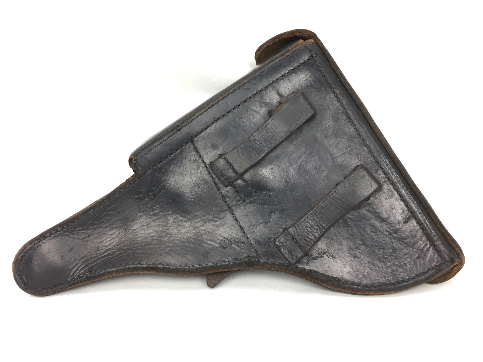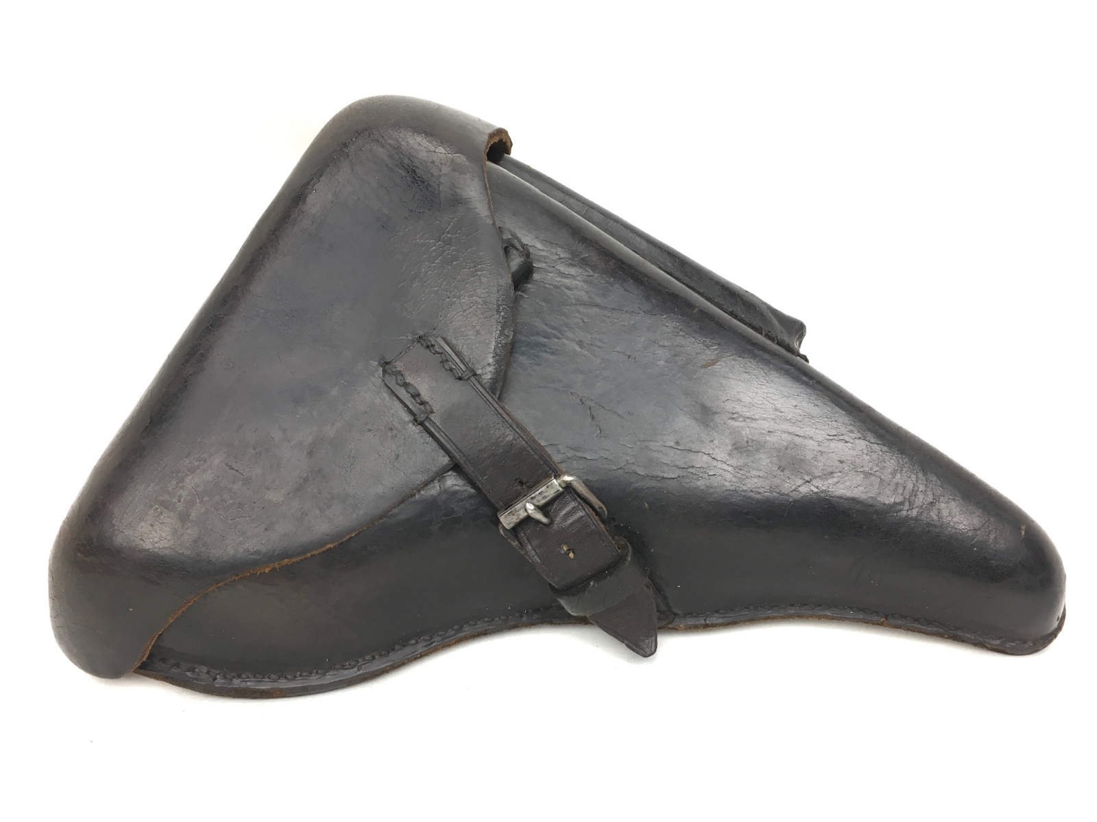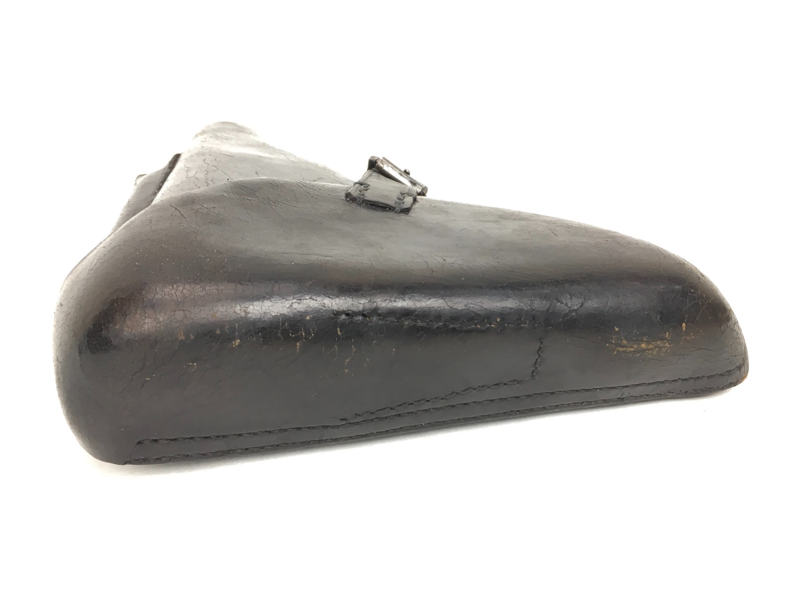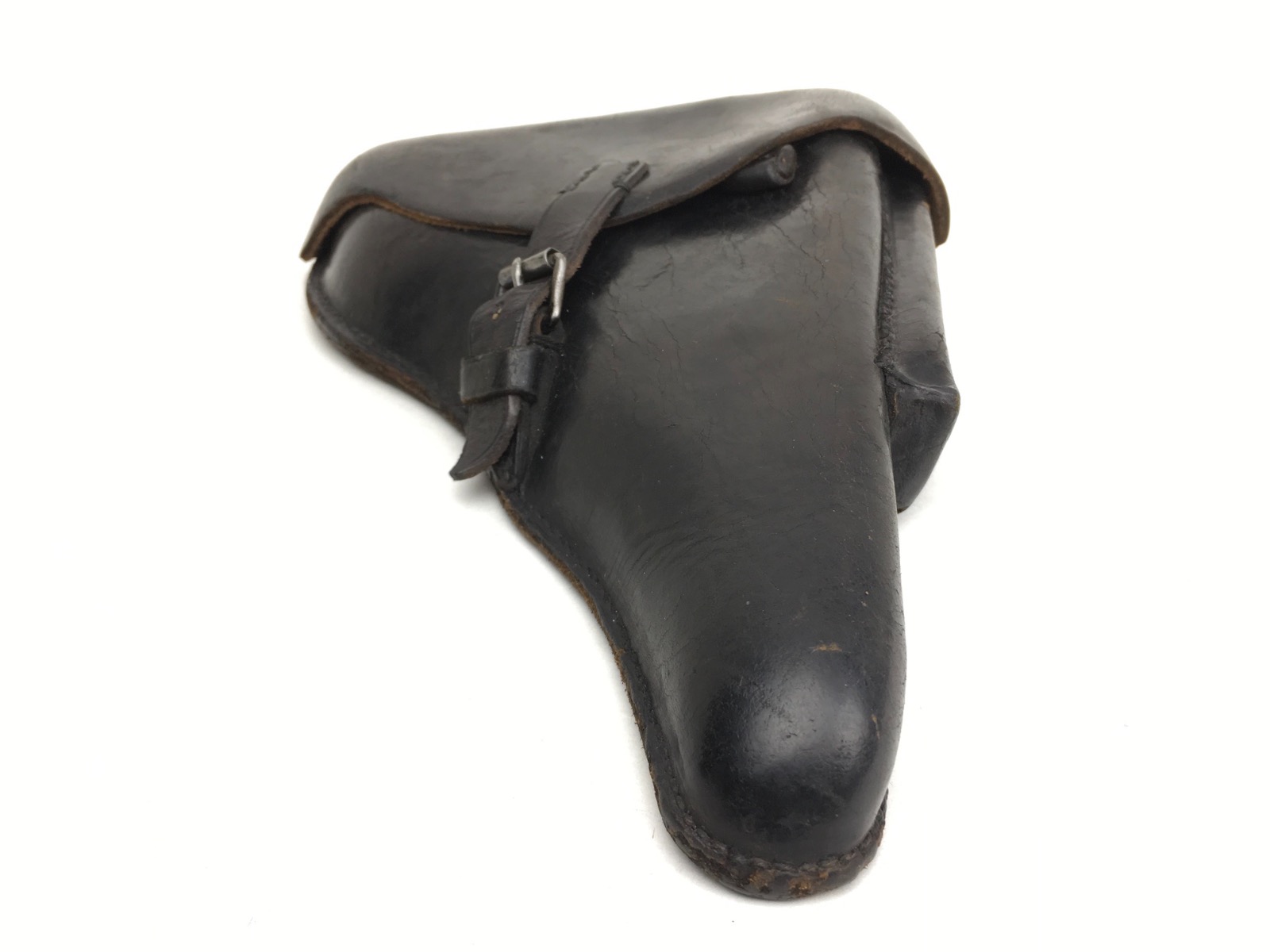 3/14/19 – This is an original WW2 production Krieghoff Luger holster. The holster has strong black leather and black stitching. Minor surface cracking on the mag pouch and on the front leather. The interior leather has the Krieghoff eagle/2 stamp. The closure strap and buckle are in great shape and function properly. Clean interior and secure lift strap. Overall the holster is strong and guaranteed all original.