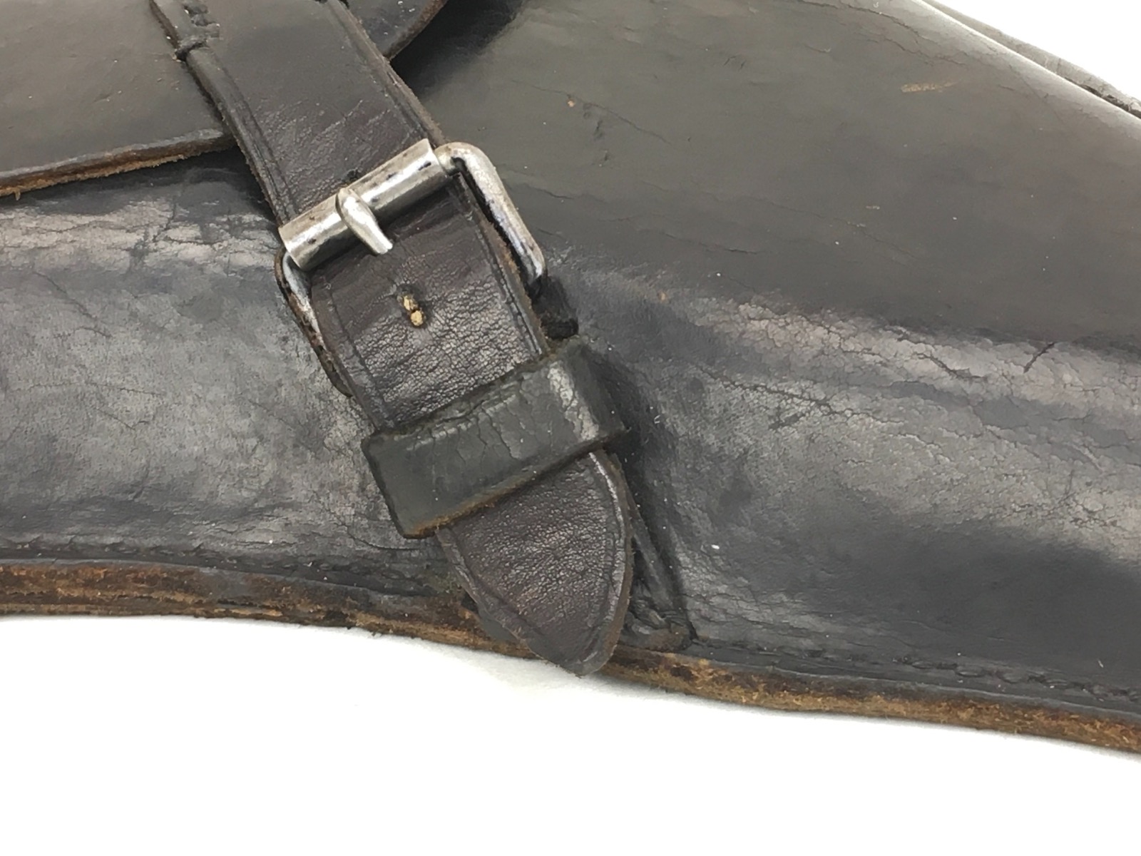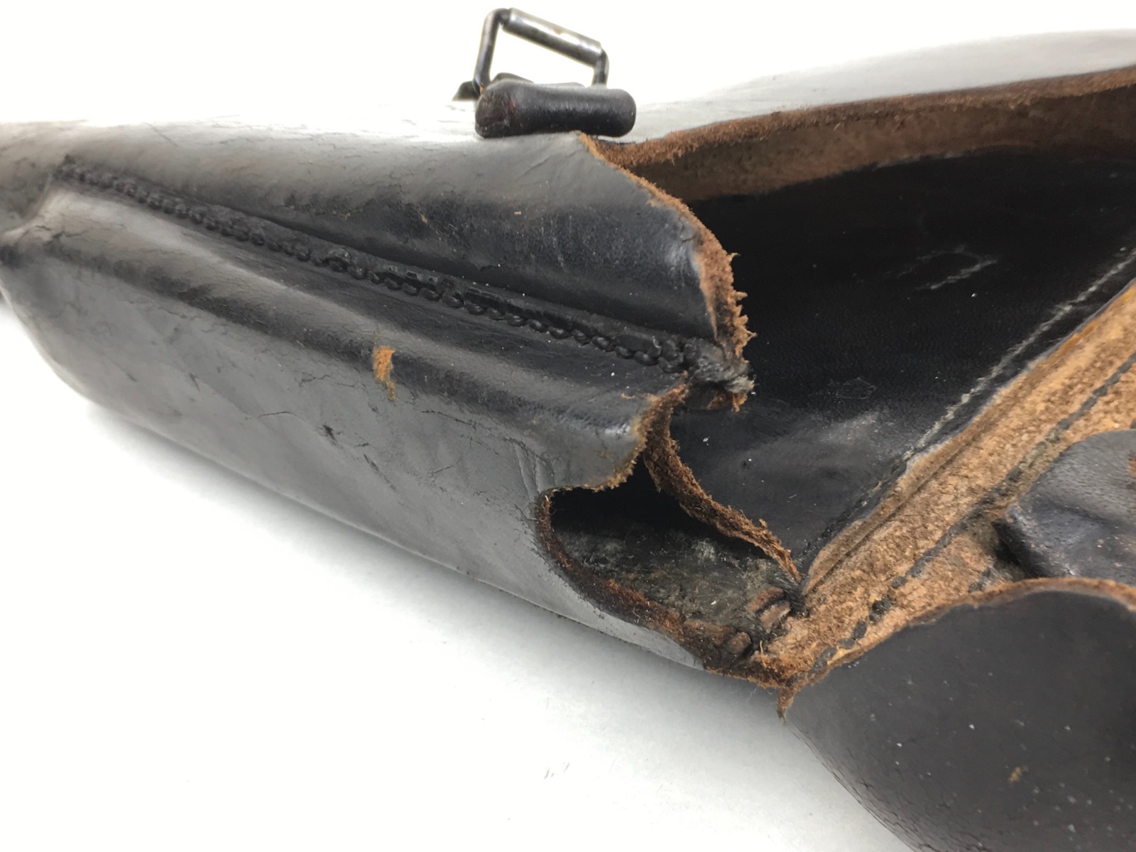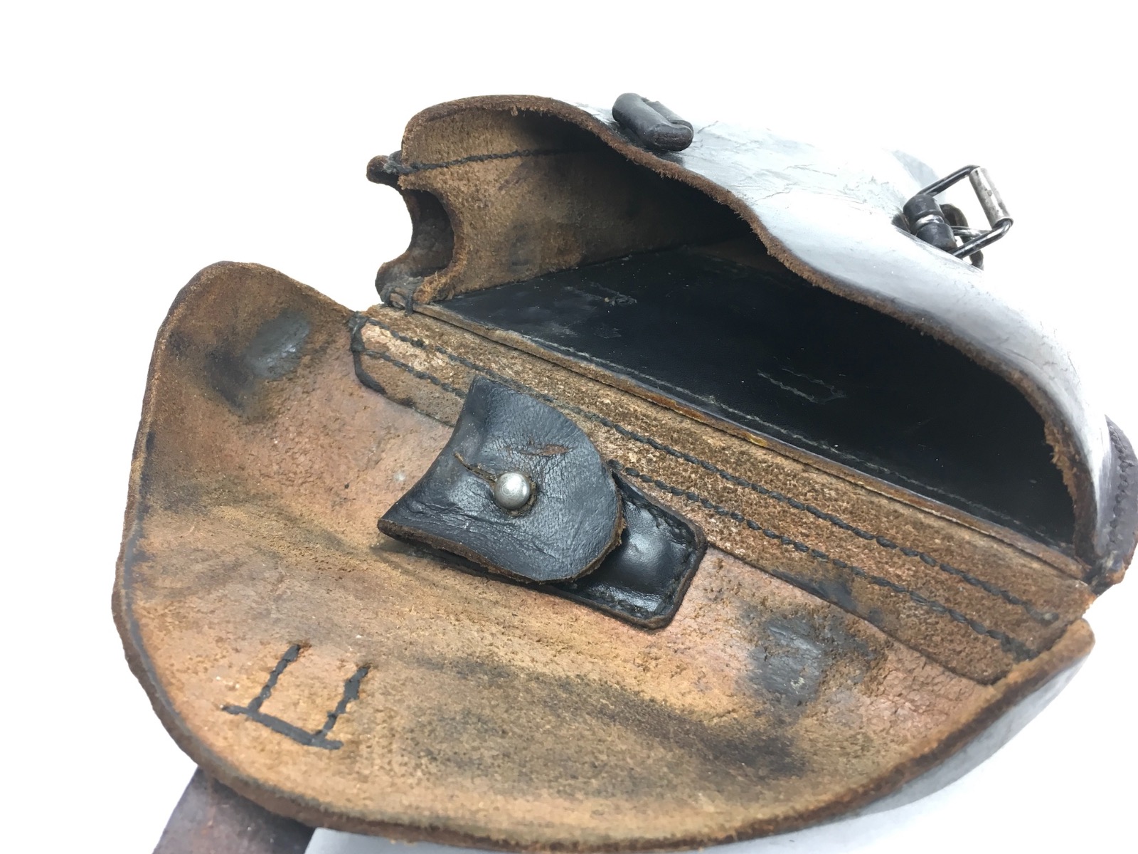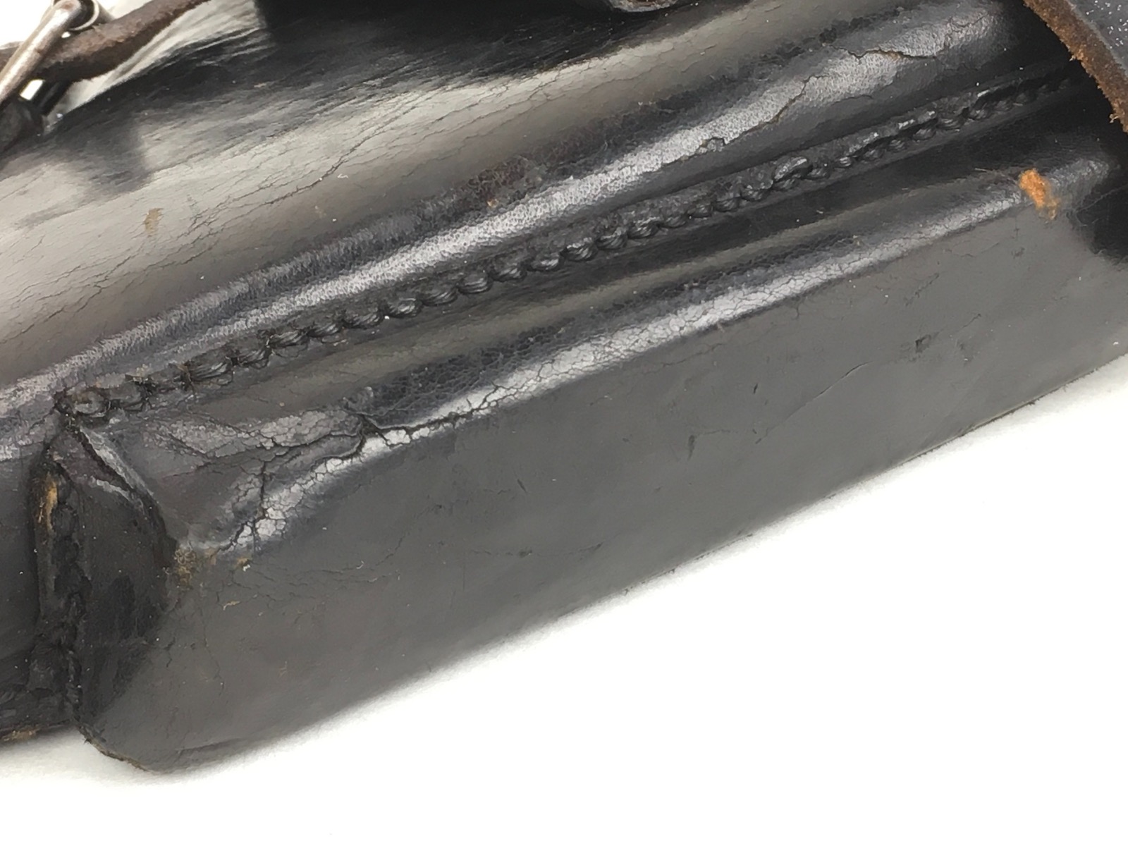 3/14/19 – This is an original WW2 production Krieghoff Luger holster. The holster has strong black leather and black stitching. Minor surface cracking on the mag pouch and on the front leather. The interior leather has the Krieghoff eagle/2 stamp. The closure strap and buckle are in great shape and function properly. Clean interior and secure lift strap. Overall the holster is strong and guaranteed all original.