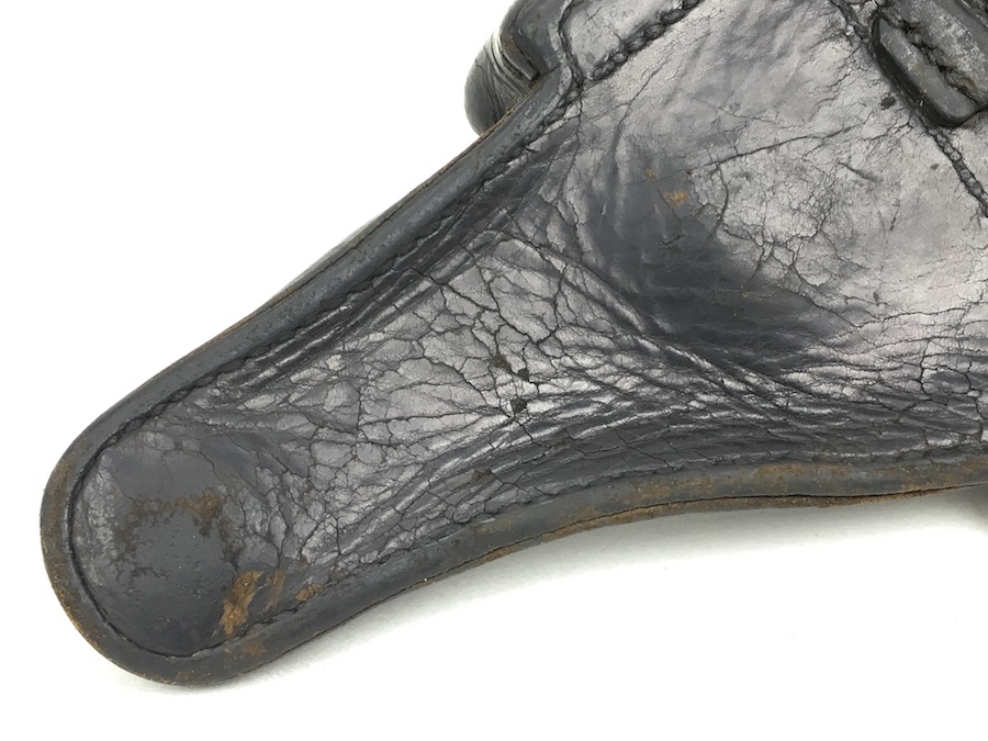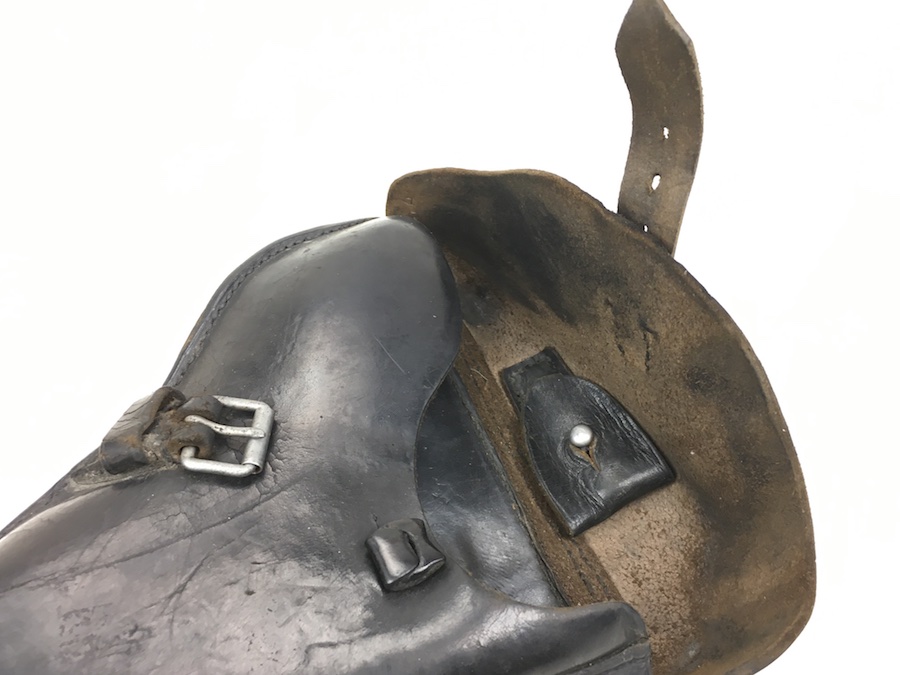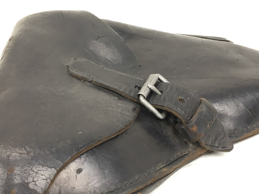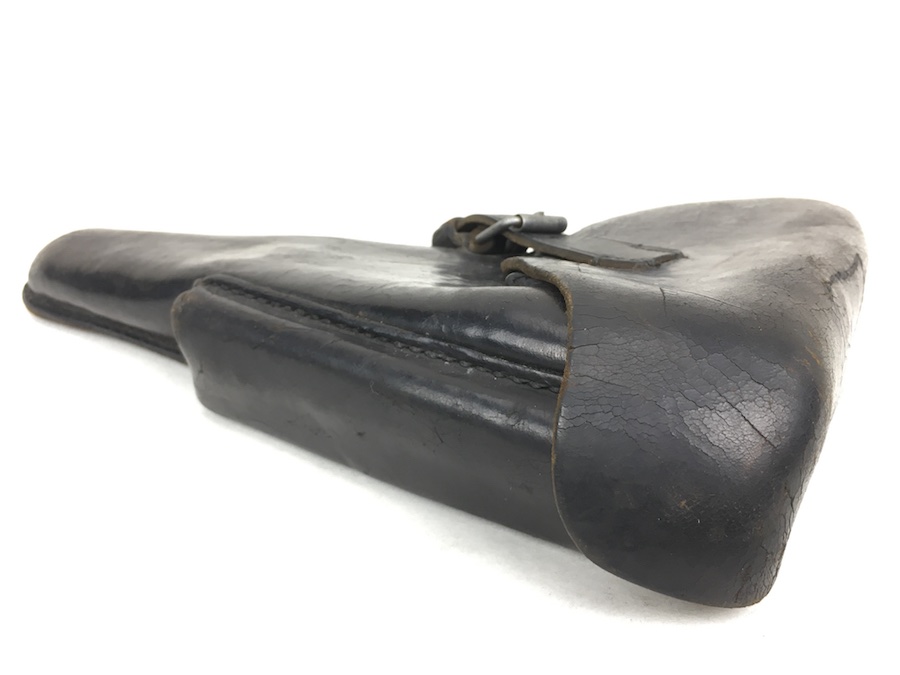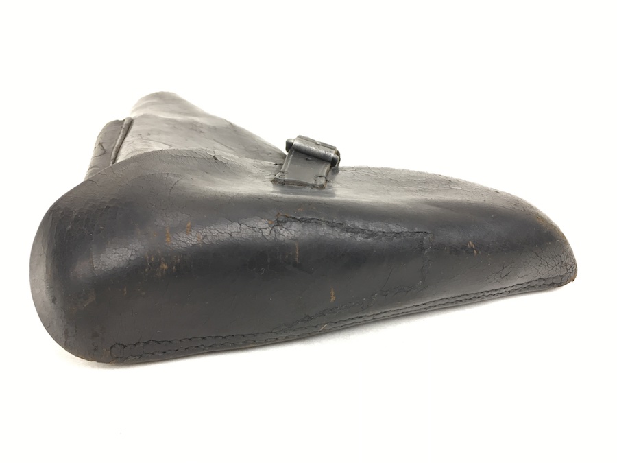 3/29/19 – This is an original WW2 production Krieghoff Luger holster. The holster has black leather and black stitching. Minor surface cracking on approximately 80% of the holster. Mostly on the flap and the back side. The interior leather has the Krieghoff eagle/2 stamp but nit is very faint. The leather at the closure buckle worn, however it is secure and functions properly. The holster is holding it’s shape, however, there is some deformity. The stitching is intact and secure. Clean interior and secure lift strap. Guaranteed all original.