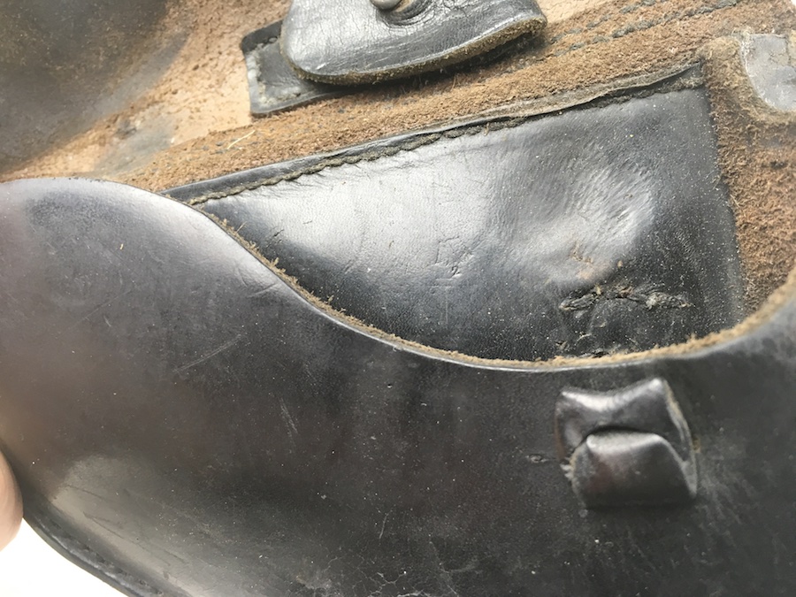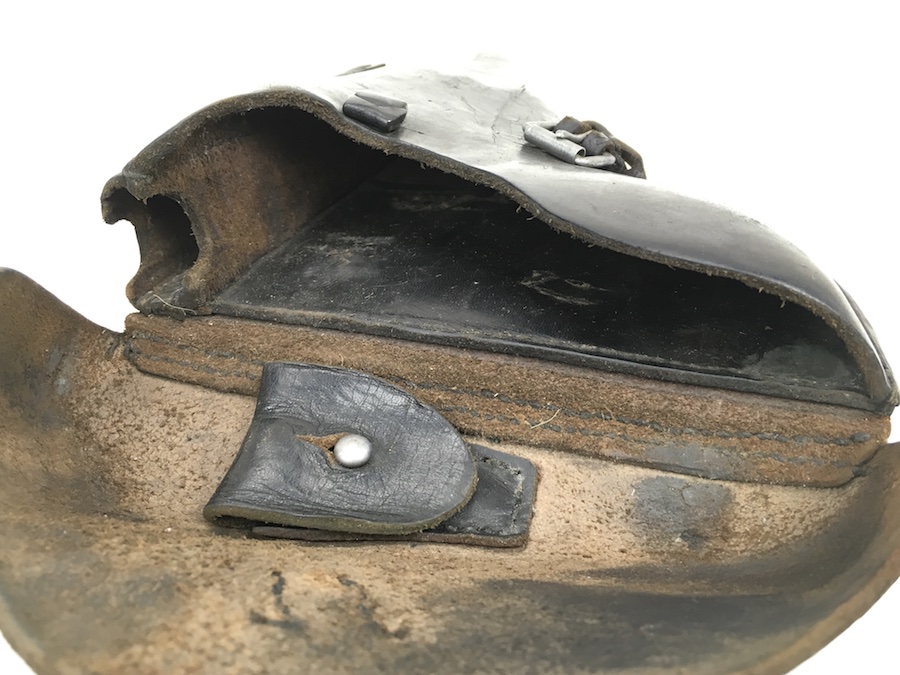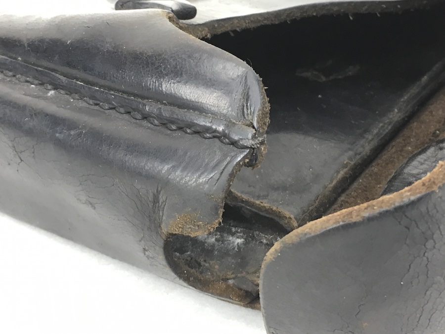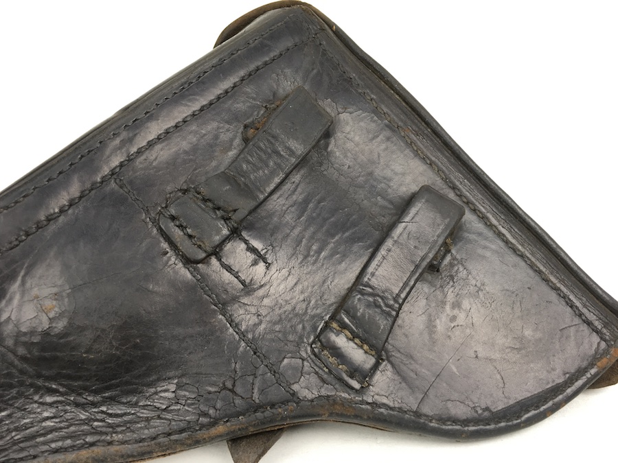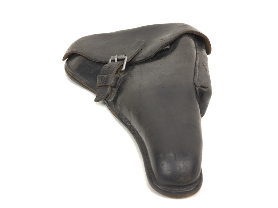 3/29/19 – This is an original WW2 production Krieghoff Luger holster. The holster has black leather and black stitching. Minor surface cracking on approximately 80% of the holster. Mostly on the flap and the back side. The interior leather has the Krieghoff eagle/2 stamp but nit is very faint. The leather at the closure buckle worn, however it is secure and functions properly. The holster is holding it’s shape, however, there is some deformity. The stitching is intact and secure. Clean interior and secure lift strap. Guaranteed all original.