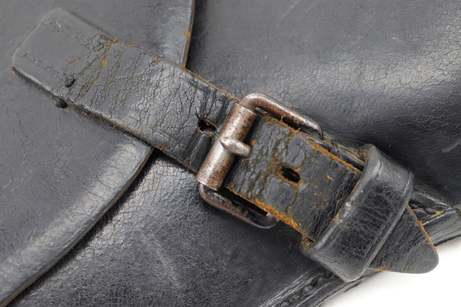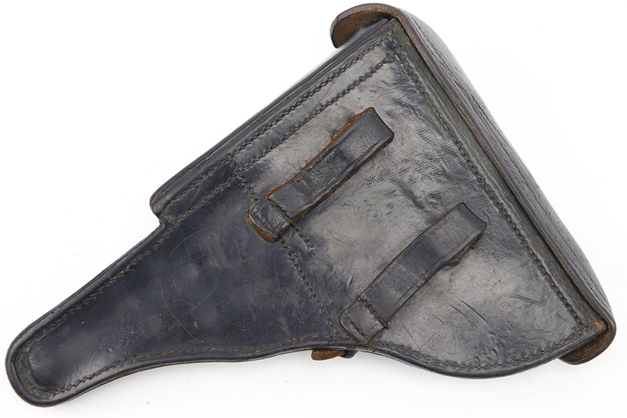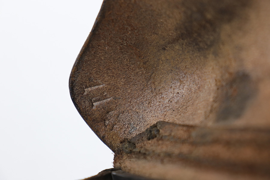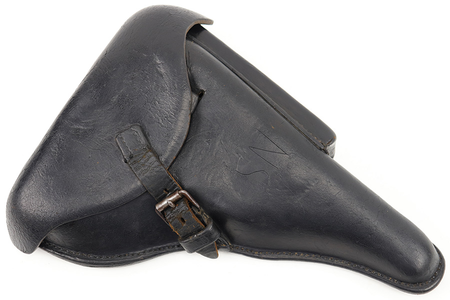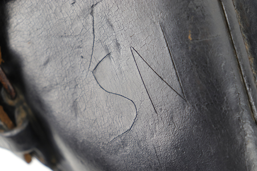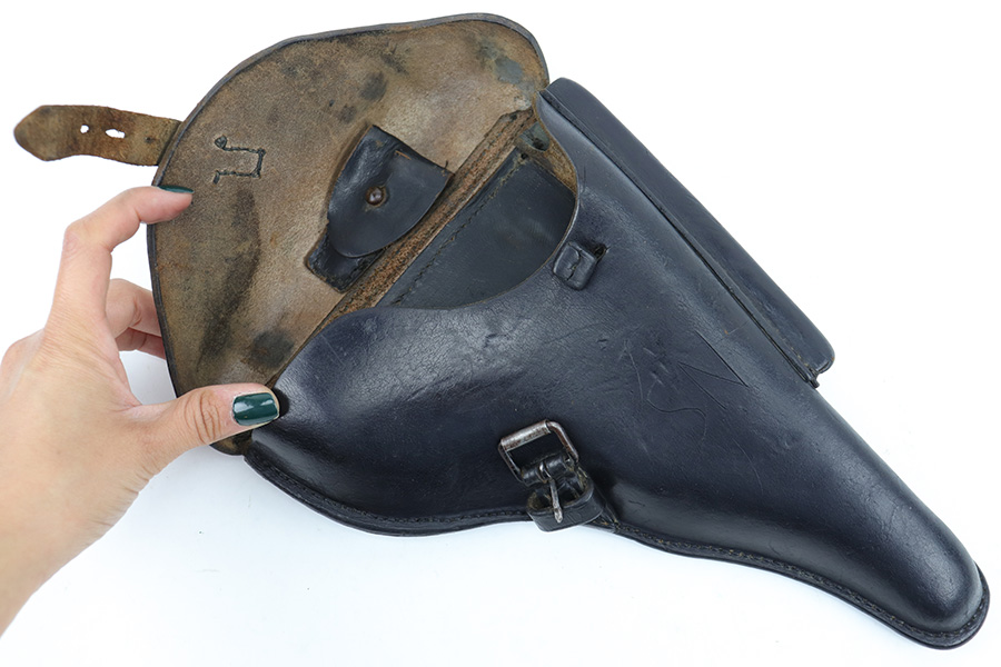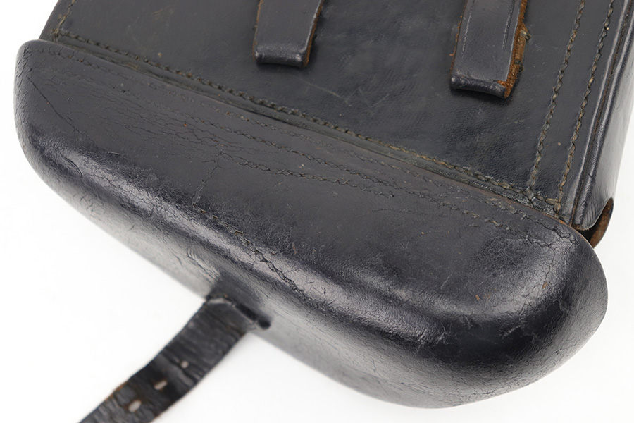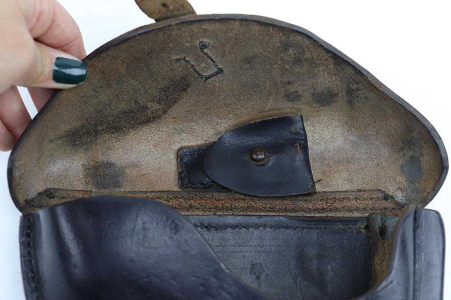 4/3/23 – This is an original, rare variation Krieghoff Luger holster from WW2. The holster is in great overall condition, despite having “SN” scratched into the front leather. The leather has normal pliability and typical use / aging wear throughout without any excessive damage. All original black stitching is tight and intact. Krieghoff proof stamped on the interior leather as shown. The interior lid has an odd stamp that looks like it could be “41” date stamped. Fairly clean interior leather.