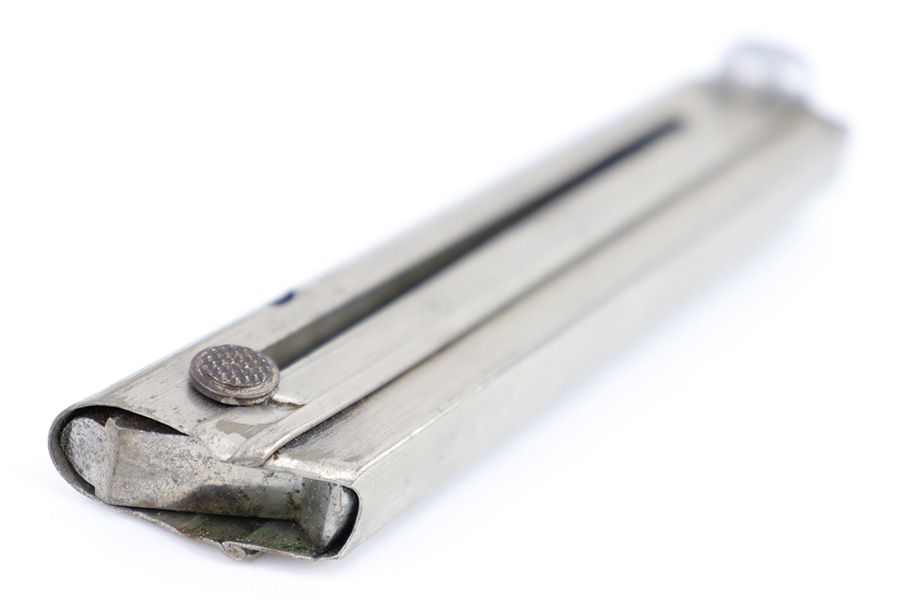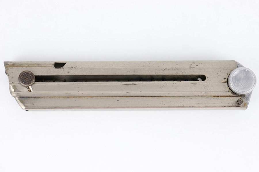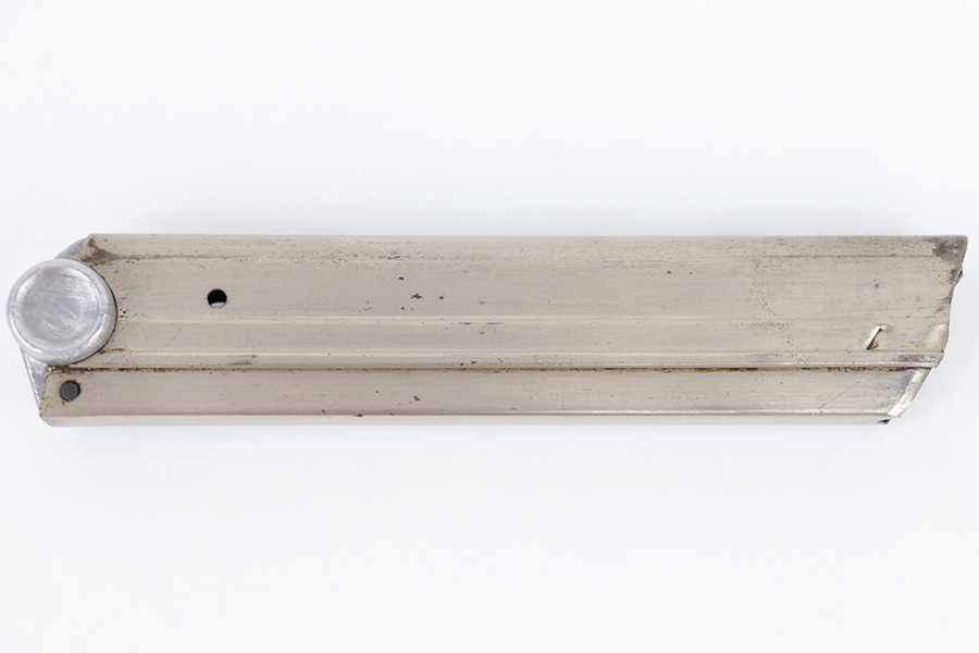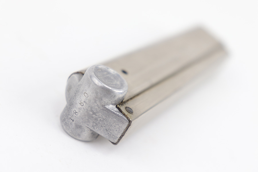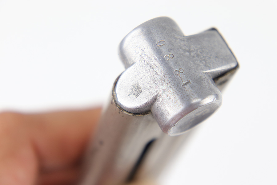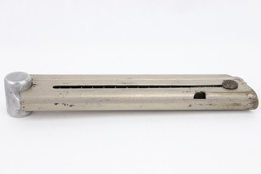 6/21/23 – This is an original Krieghoff Luger magazine from WW2. The magazine is in great overall condition with a nickel tube and aluminum base. The base is serial numbered 1880 and has a Krieghoff proof stamp. The tube has some mild surface patina and mild signs of use and aging but no rust or pitting. Strong, functional spring.