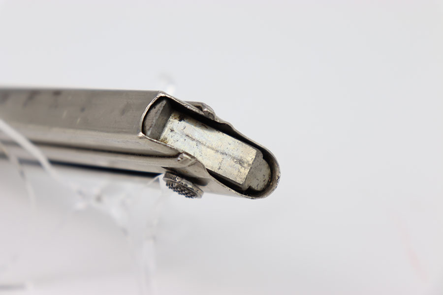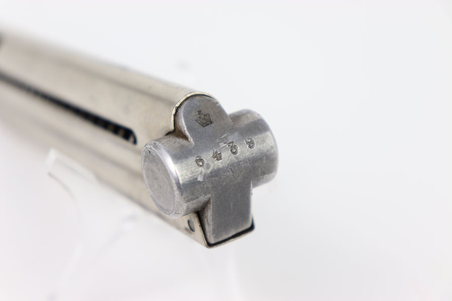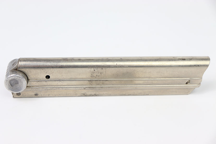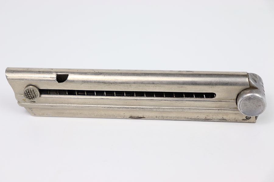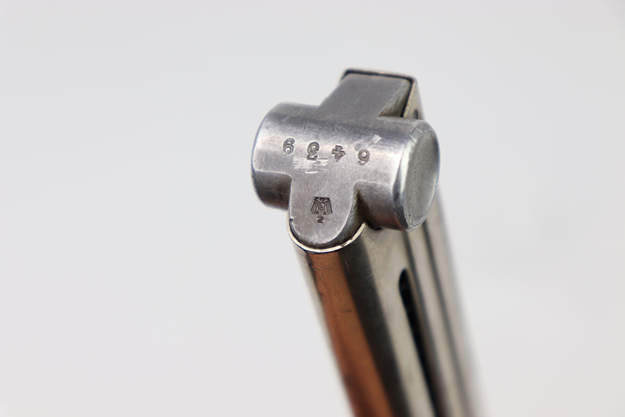 2/6/24 – This is an original Krieghoff Luger magazine from WW2. The magazine has a nickel tube and aluminum base. This example is in overall excellent condition, other than some light wear throughout, mainly on the spine and adjacent edges. The spine of the magazine has one tiny dent at the top but does not affect it’s functionality in anyway. The aluminum base is serial numbered 6439 with a Krieghoff proof stamp. Strong, functional spring.