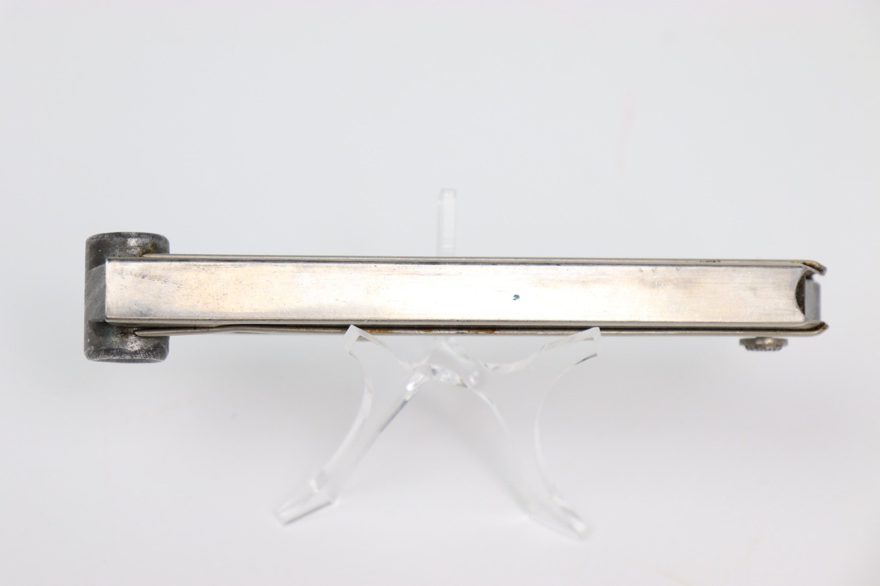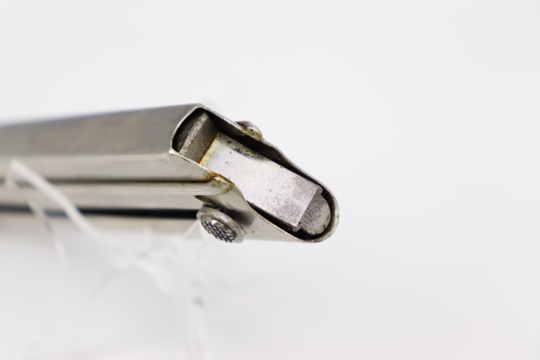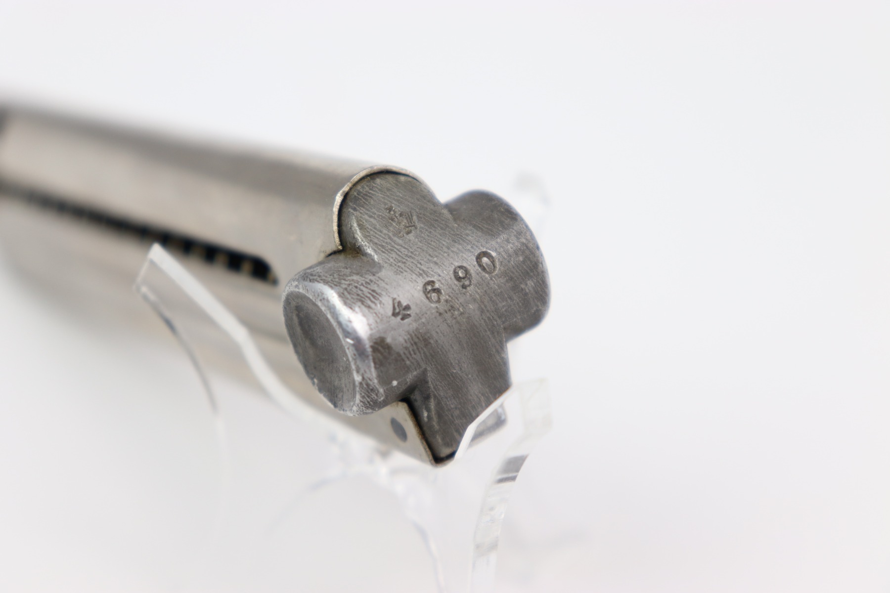 3/13/24 – This is an excellent original Krieghoff Luger magazine from WW2. The magazine has a nickel tube and aluminum base. This example is in overall excellent condition with minimal wear throughout. The aluminum base is serial numbered 4842 + with a Krieghoff proof stamp. There is one minor dent on the bottom of the right side of the tube, please see the photo for reference, this dent causes no issues in functionality and could be repaired. The spring is strong, functional, and smooth.