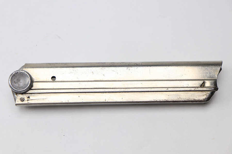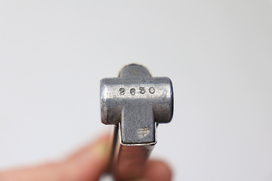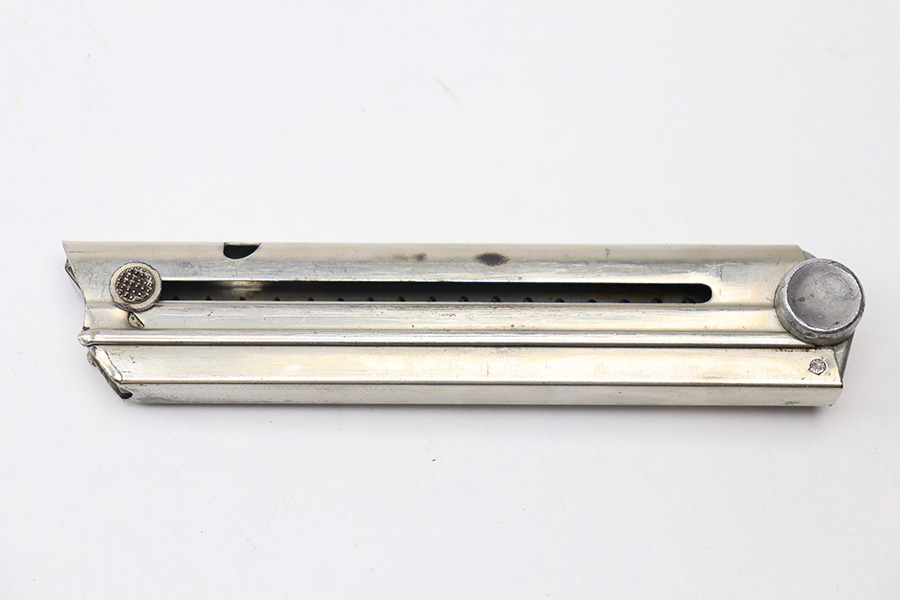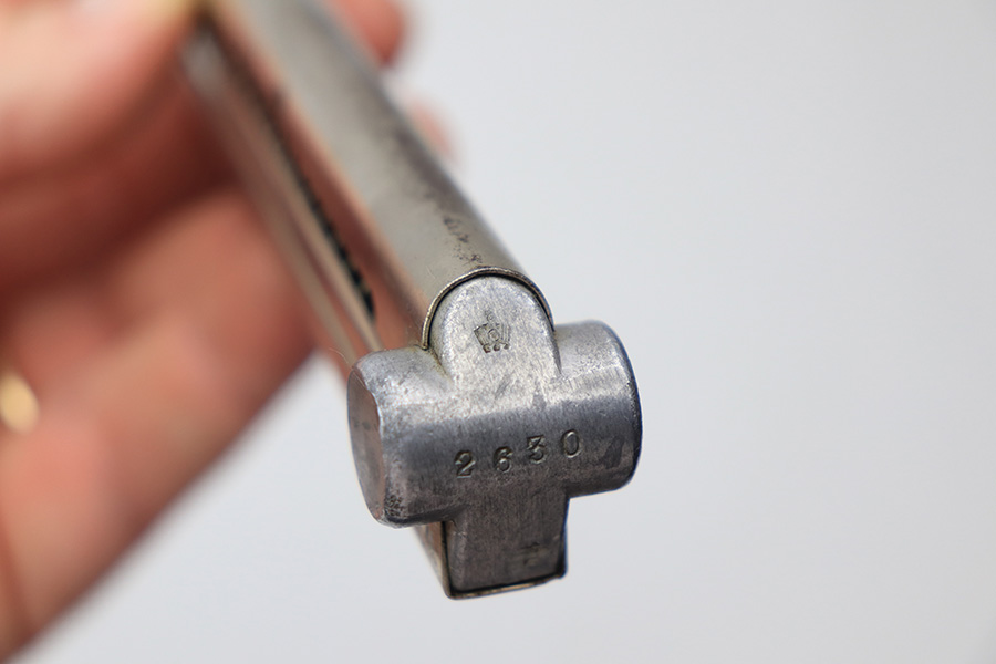 1/13/22 – This is a rare, desirable Krieghoff luger magazine from WW2. The magazine is in great condition overall with a Nickle tube and aluminum base. The base is serial numbered and proof stamped with an upside down eagle/2 Krieghoff proof stamp. Towards the bottom of the base, there’s a scuff / blemish that looks like it may have once been a proof stamp that was later covered up, but we’re not sure. This could also just be a nick from use or combat. The spring is strong and fully functional.