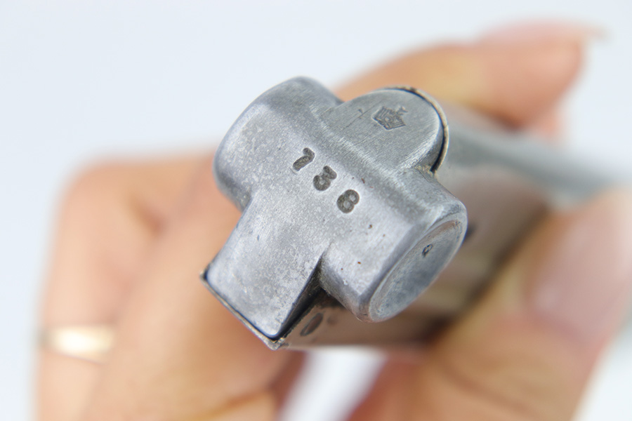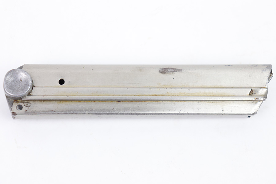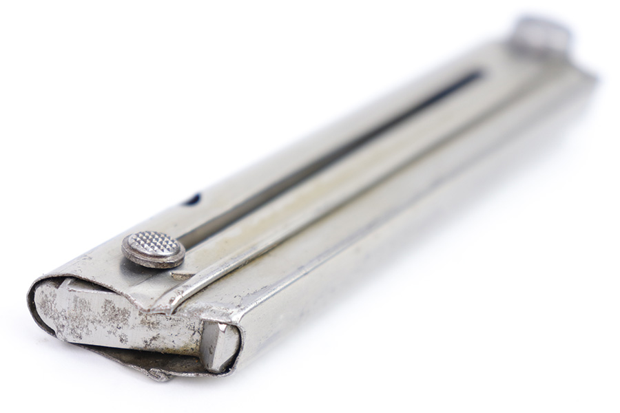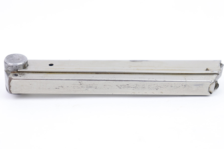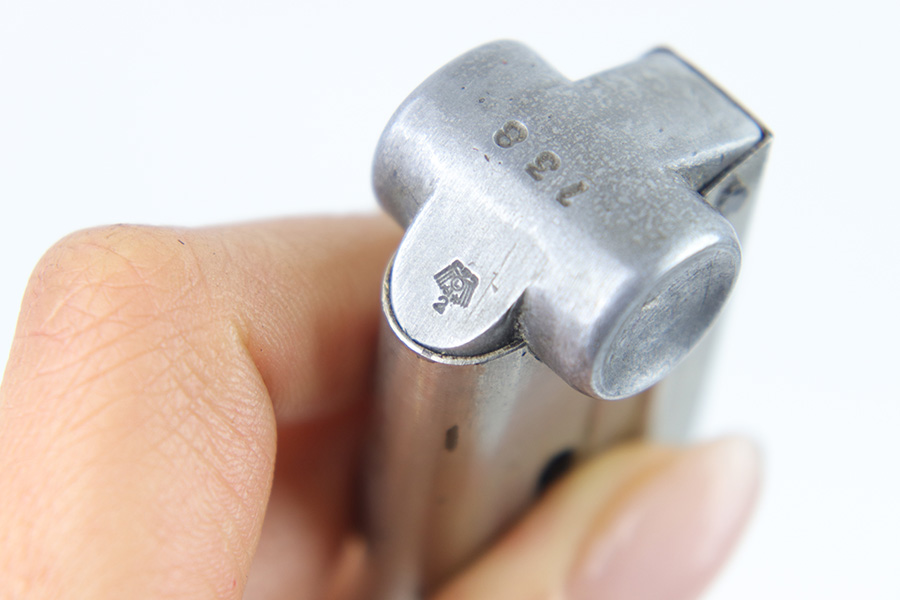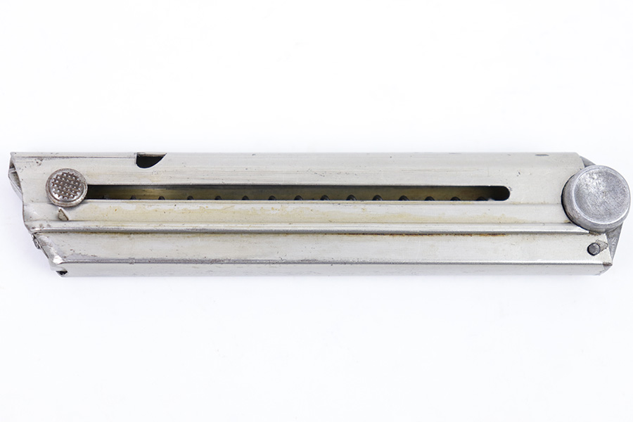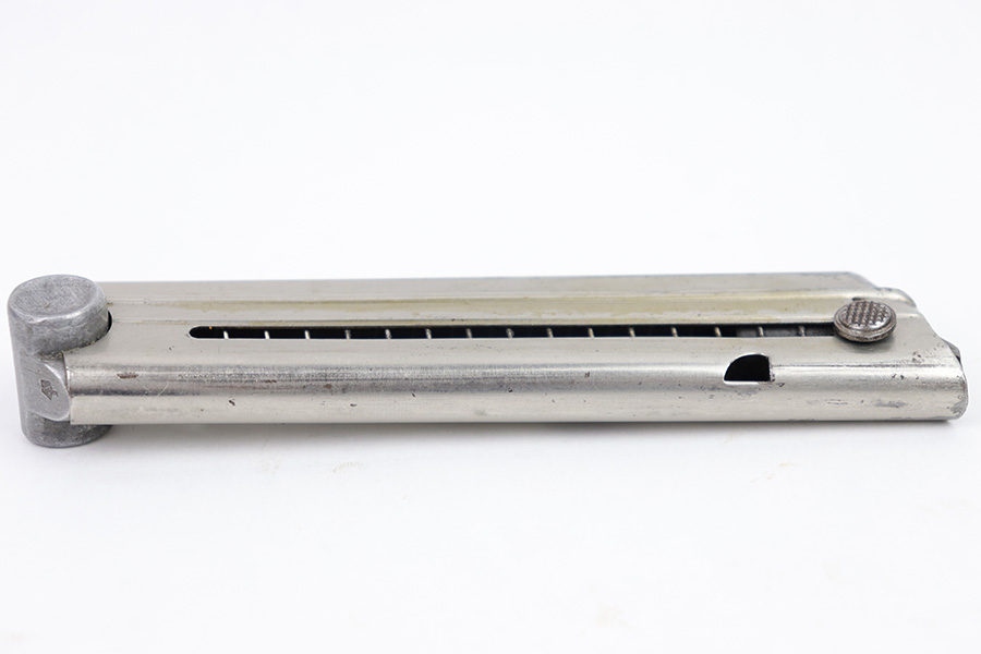 2/27/23 – This is an original, rare variation Krieghoff Luger magazine. The magazine has a nickeled tube and aluminum base. The base is stamped with an original Krieghoff proof and a 3 digit serial number. There’s some minor flattening on the base near the serial number stamp, which tells us the base has been ground down and re-numbered. Price reduced accordingly. The tube is in great condition with some minor surface wear but no rust or pitting and a fully functional spring.